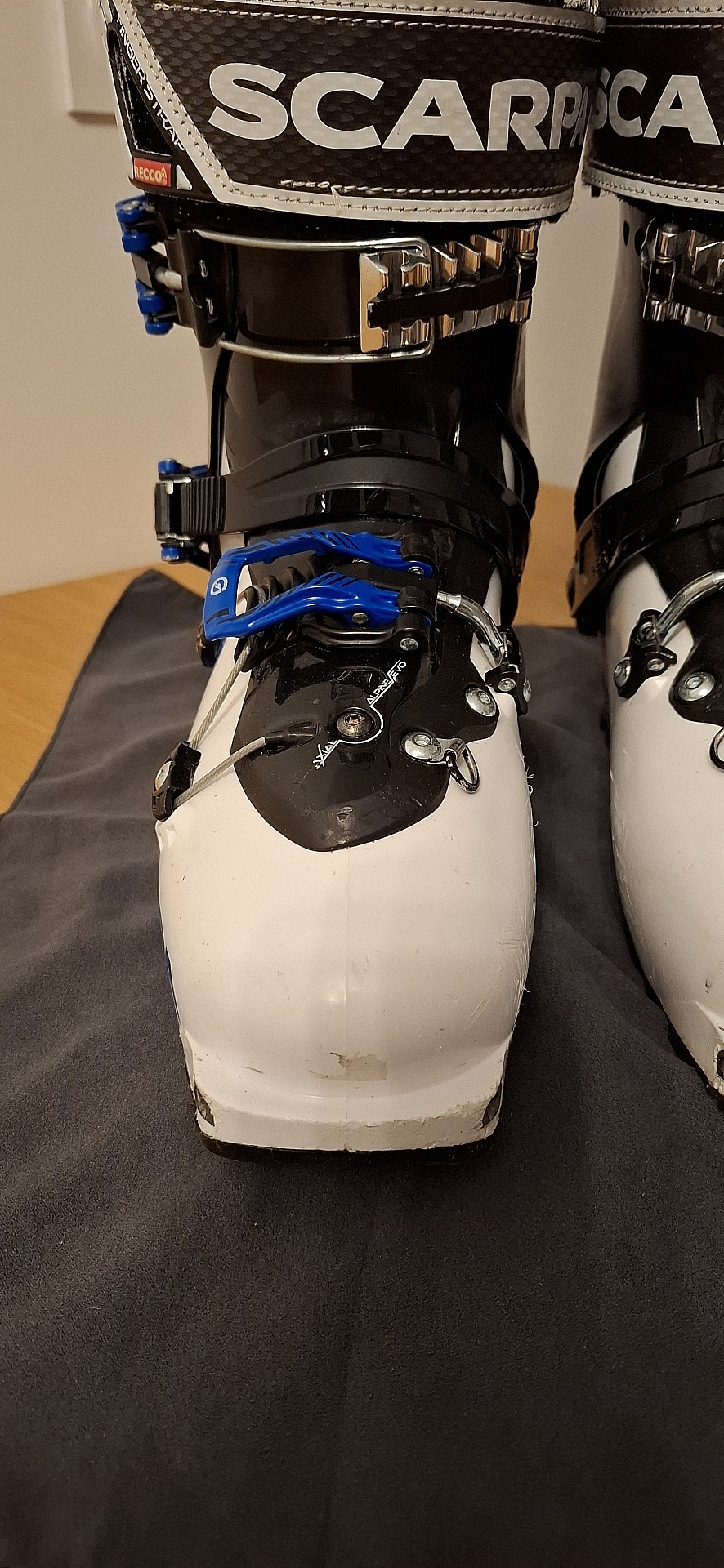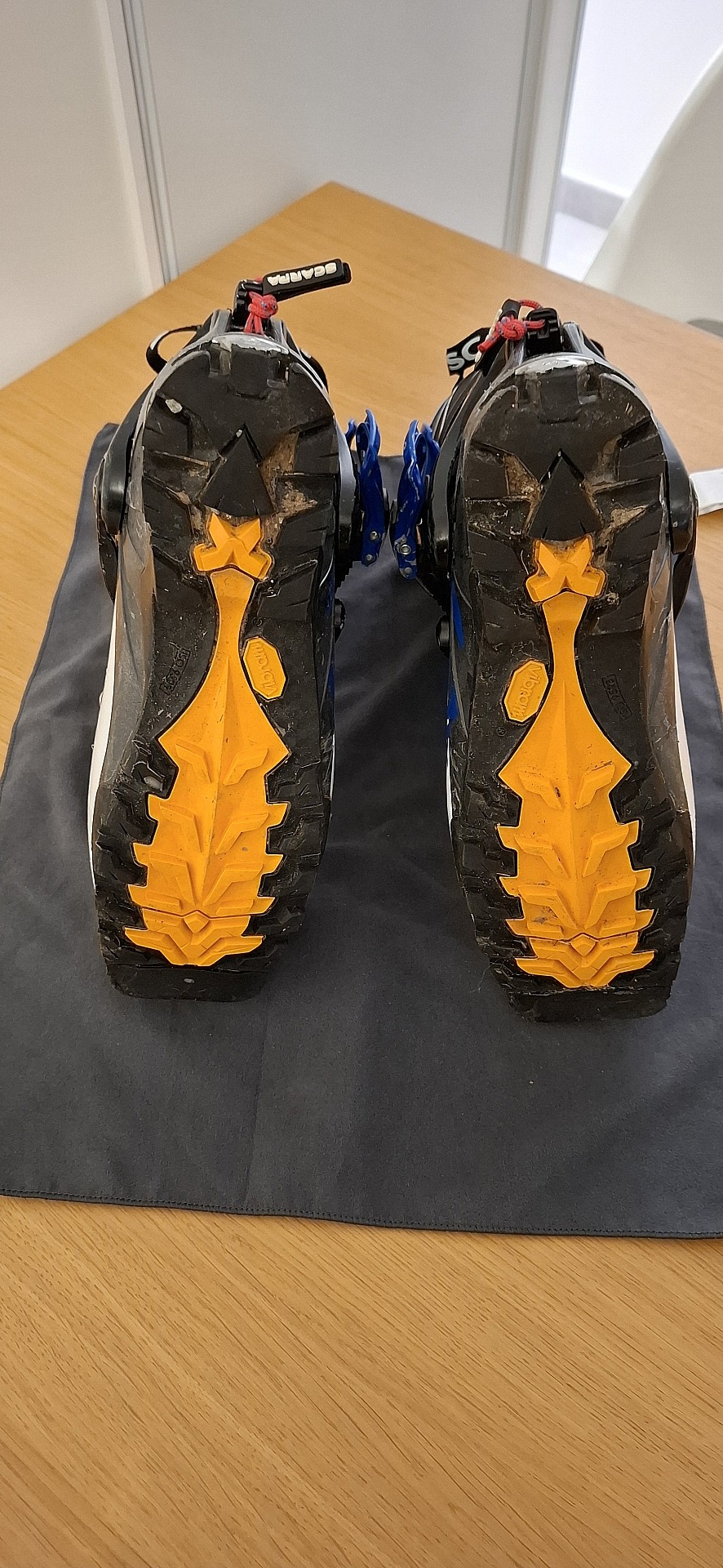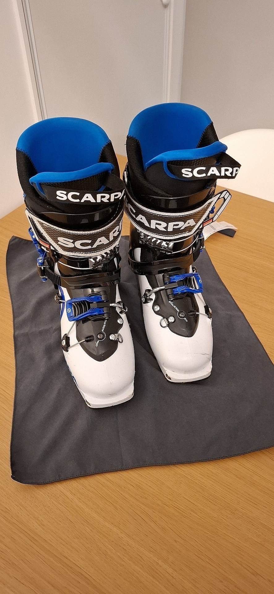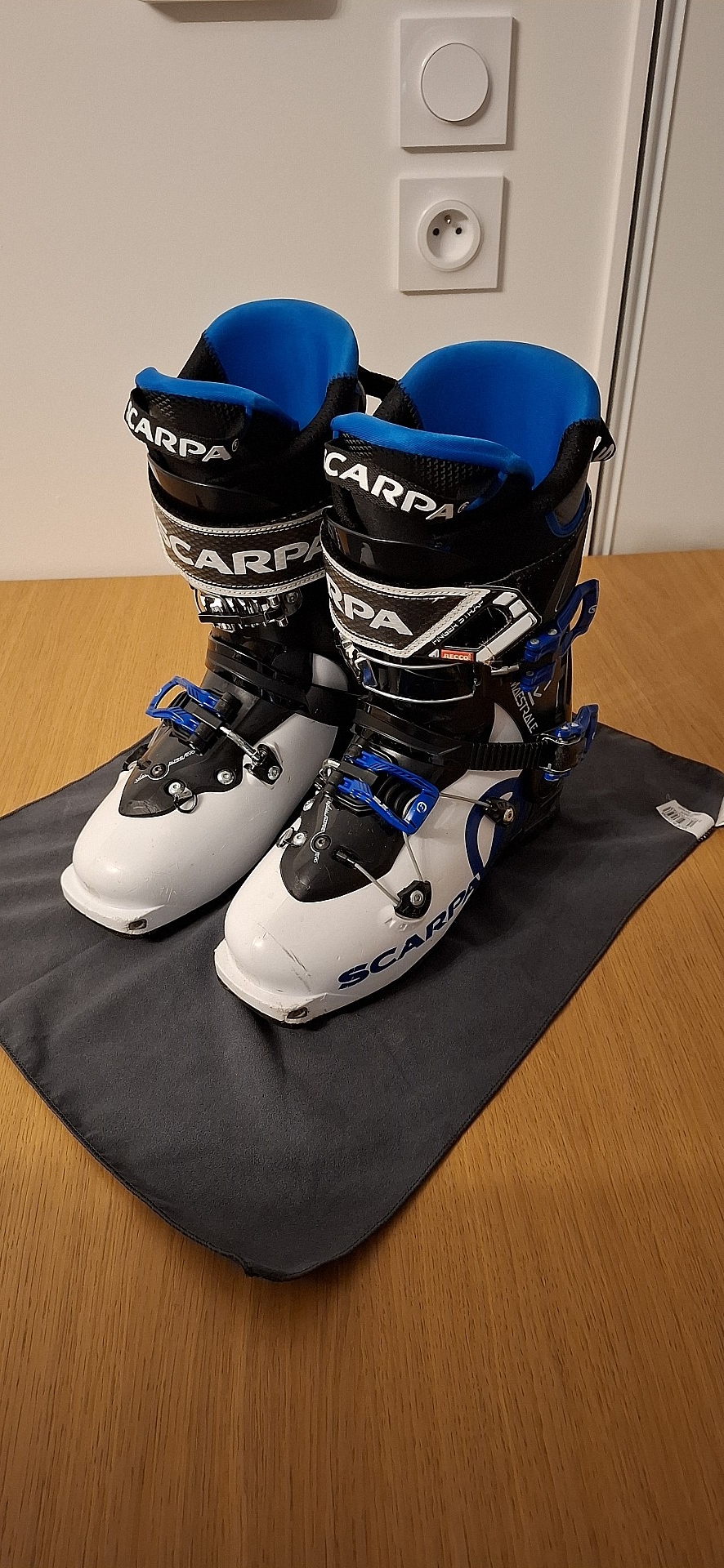 Je vends une paire de Scarpa Maestrale RS (taille 26.5, 297 mm) achetées en 2021. Elles ont dans les 40 sorties, sont encore parfaitement fonctionnelles mais portent des traces d'usure sur les coques et les semelles (rayures, usure normale). J'ai remplacé les deux boucles permettant le passage du crochet en mode ski/marche car celles d'origine ont fini par lâcher. Je les remplace pour le même modèle, mais à la bonne pointure (achetées trop grandes à l'époque). Je fournis deux semelles de réhausse Sidas qui ne me serviront plus avec. Si besoin de précisions, n'hésitez pas !