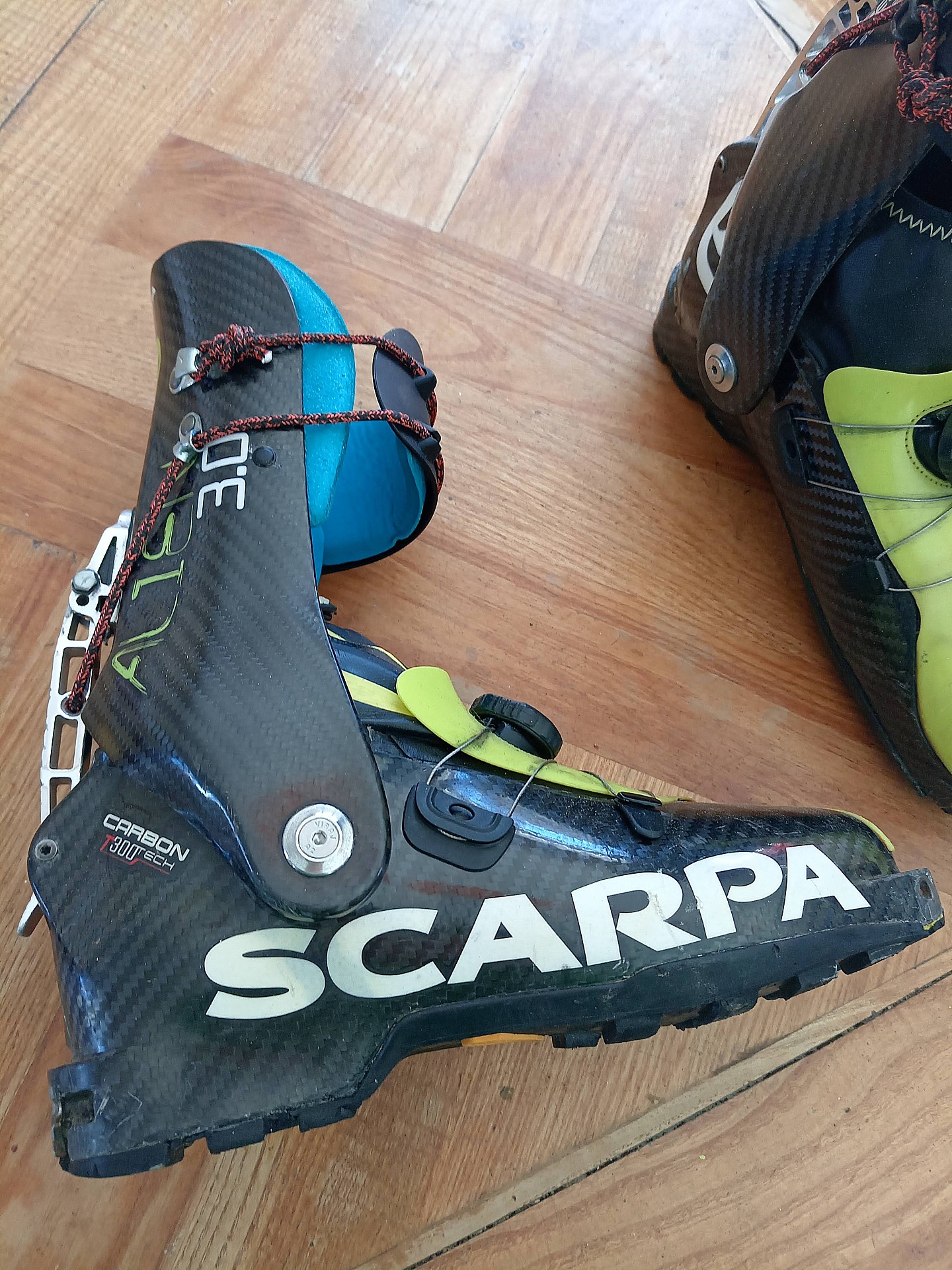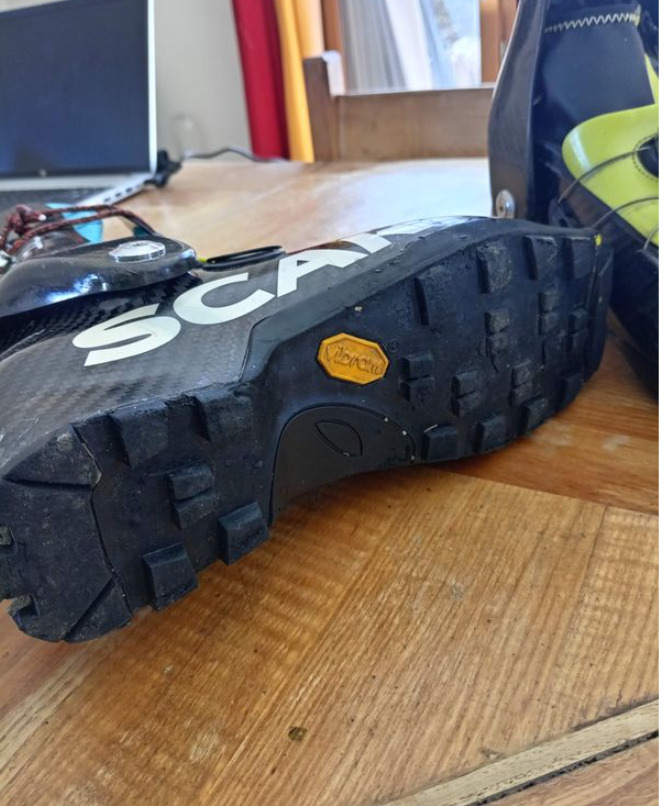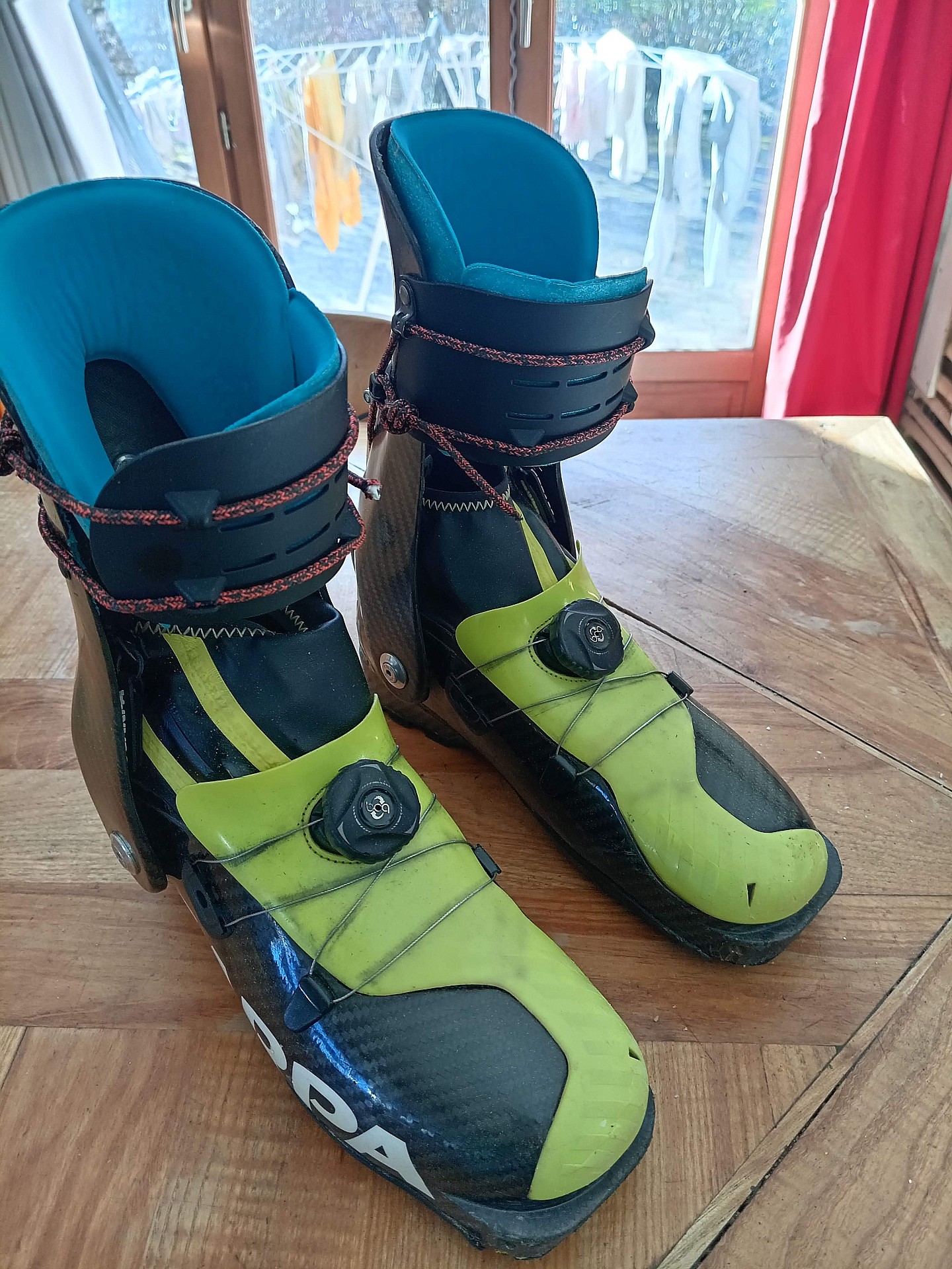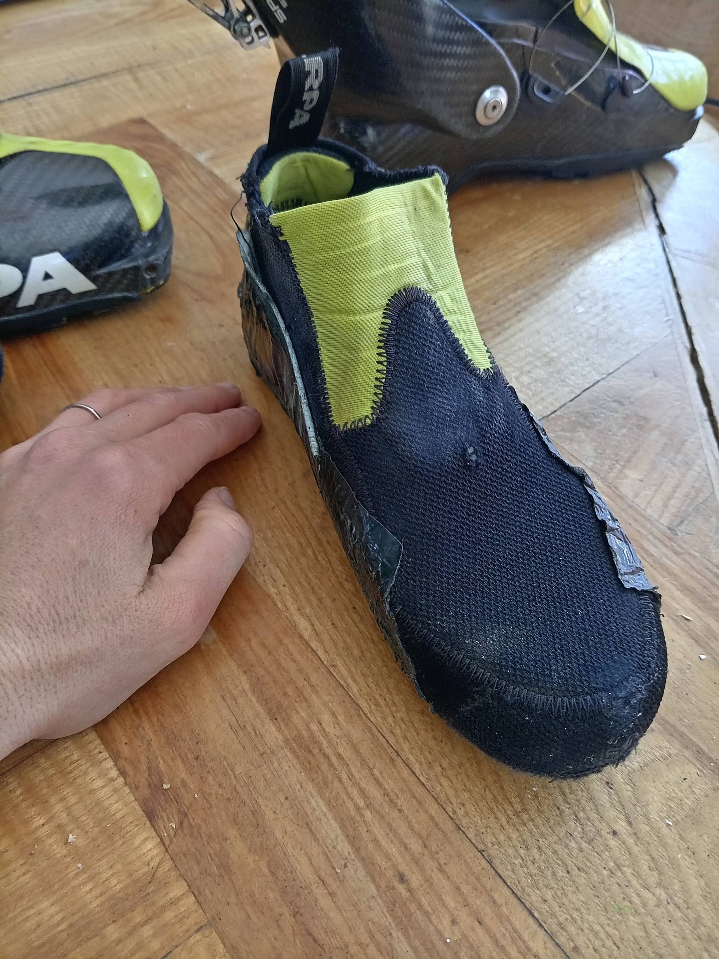 Révision et rajout guêtres en 2023, chaussures révisées en 2025 (cf compte rendu). Les chaussons sont entourés de scotch pour les faire durer, mais il sont toujours utilisables. De supers chaussures de course... ou de balade tout confort!