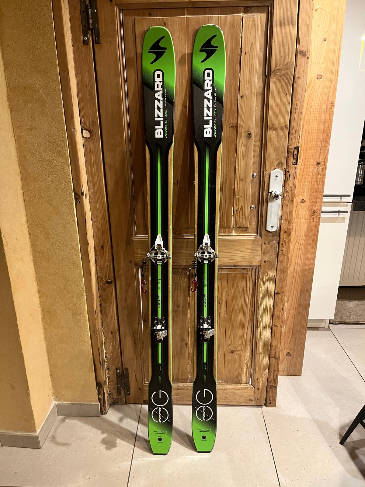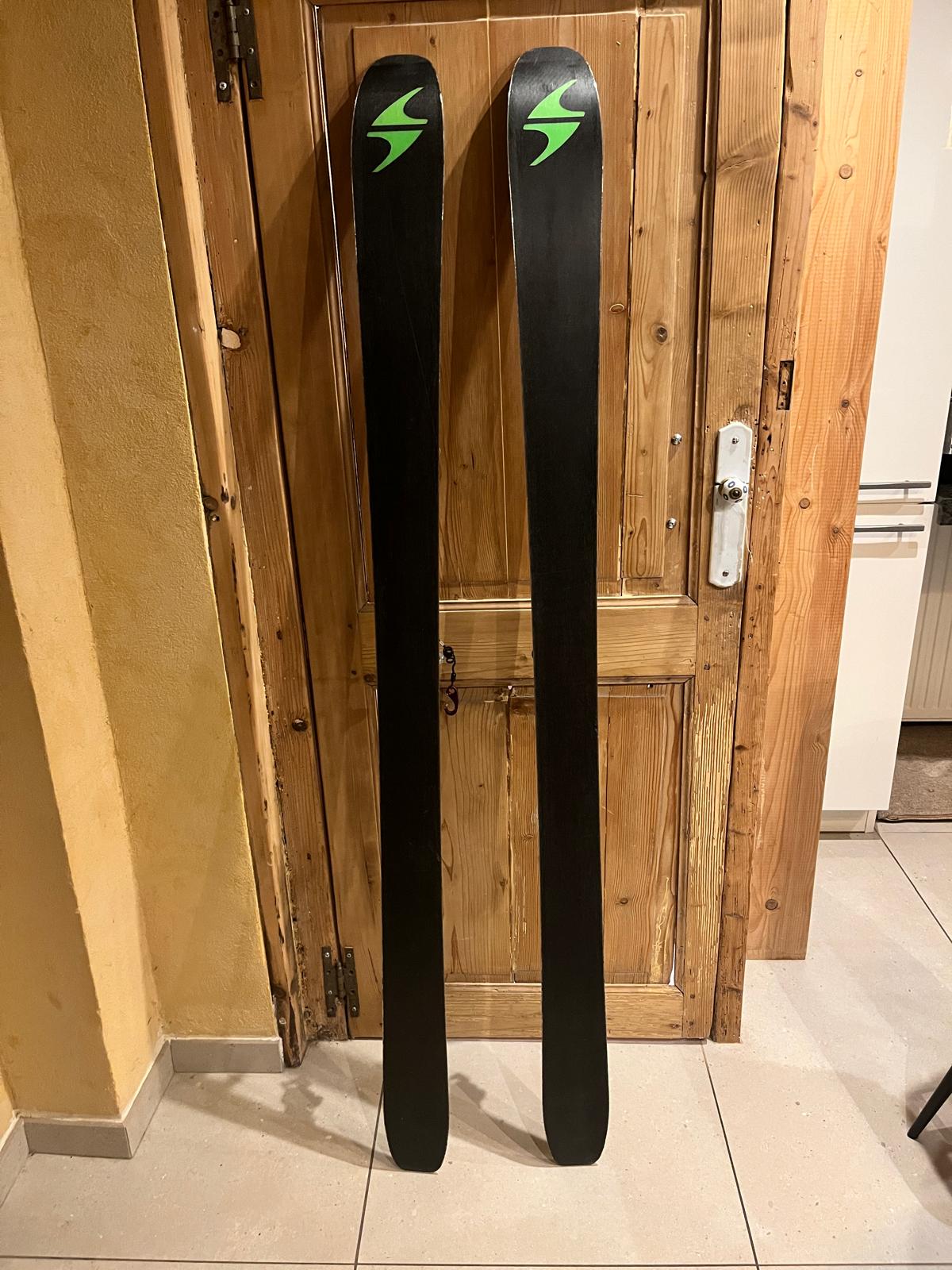 Bon etat. Accroc sur la spatule uniquement esthetique. Peu de sorties relativement a l'age (~ 60) et principalement en neige fraiche. Avec fixations Dynafit Speed turn (max semelle 306mm ; reglee actuellement pour semelles 294mm).