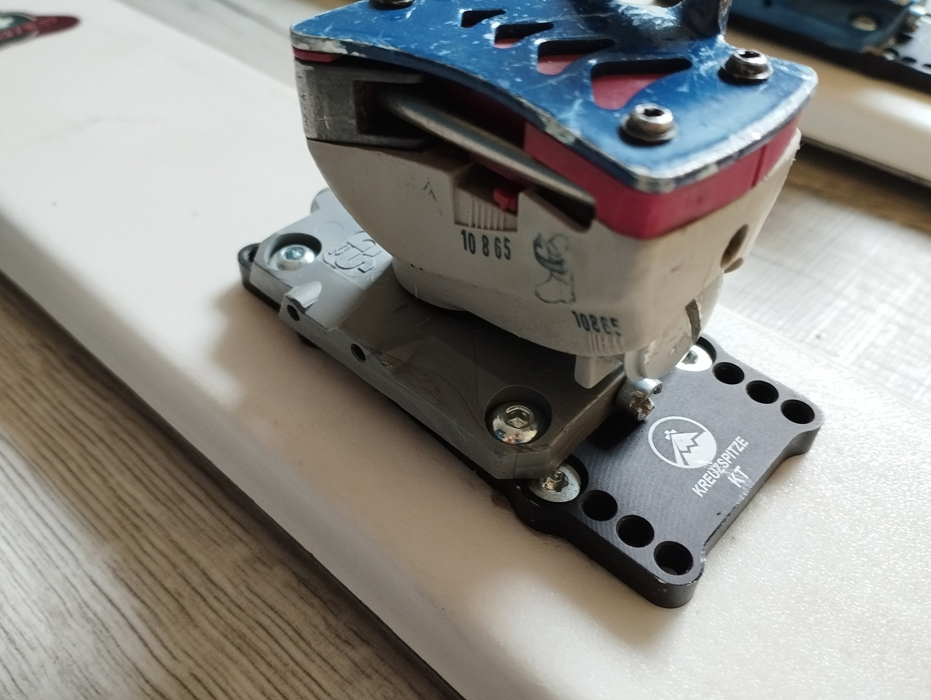Les fixations sont montées sur une plaque permettant de faire varier la longueur de semelle (système Kreuzspitze KT)