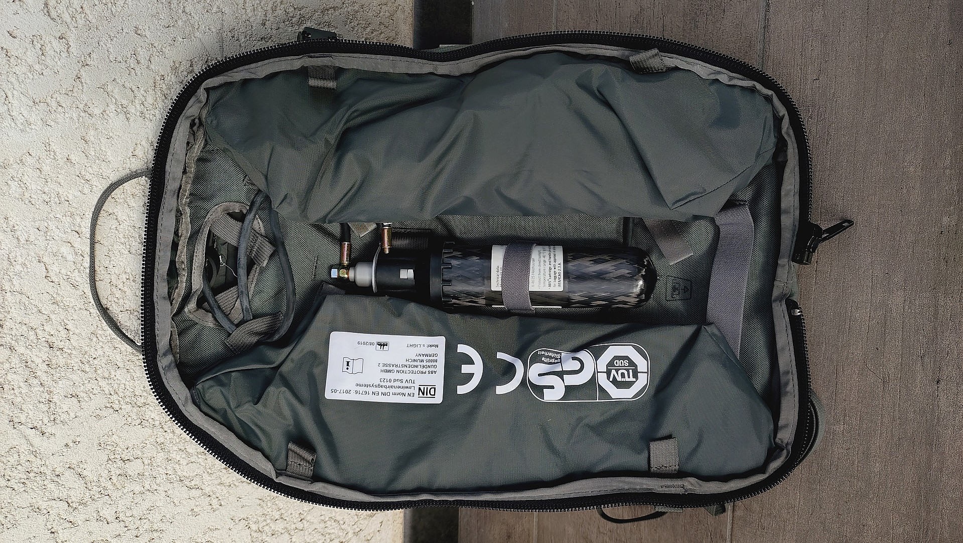 Sac jamais déclenché équipé d'une cartouche carbone pesée, vérifiée et d'une poignée de déclenchement pyrotechnique neuve...