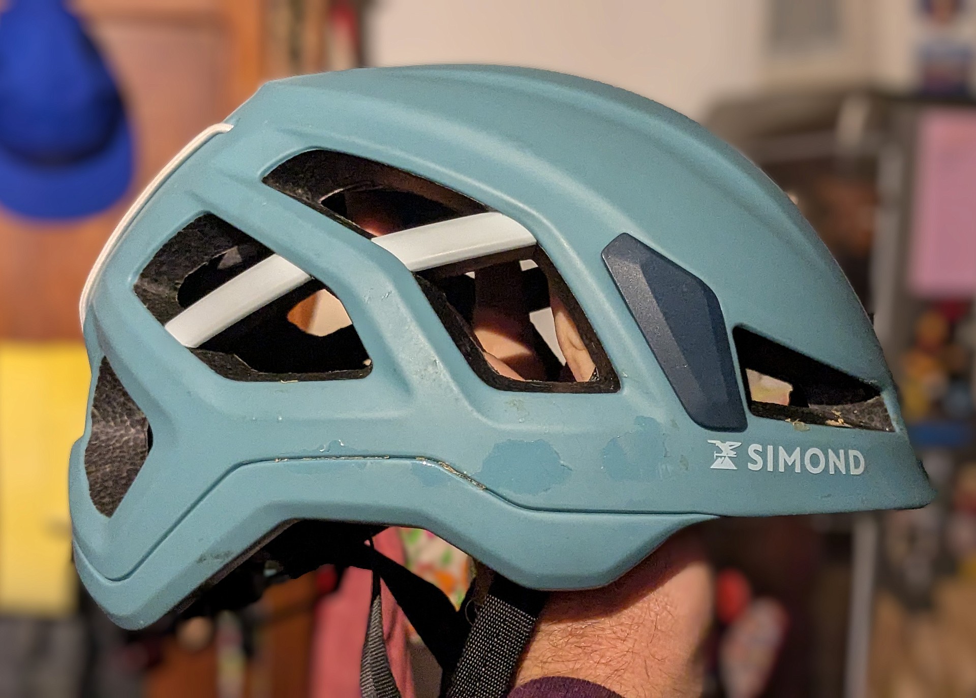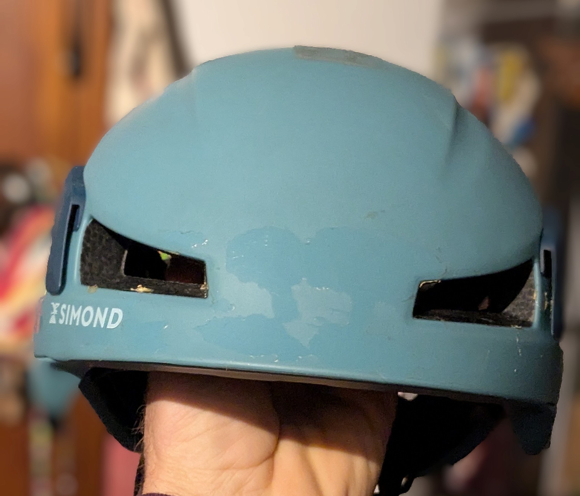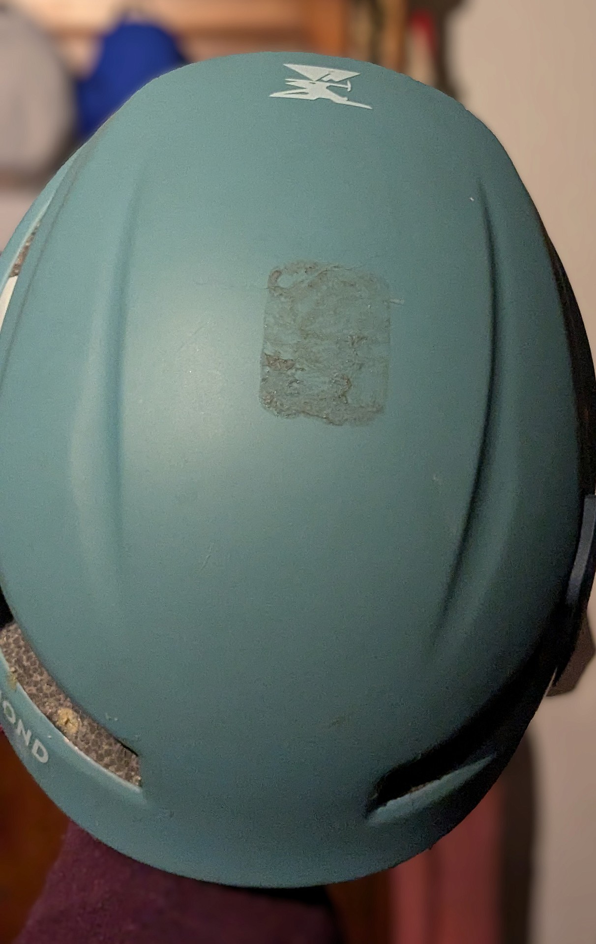 Vends casque escalade/ski de rando . Un résidu de colle de qui peut se nettoyer et des bouts de film mâte qui se sont décollés. C'est uniquement esthétique,tout est ok sur le casque, aucune chute. Acheté au printemps 2025.