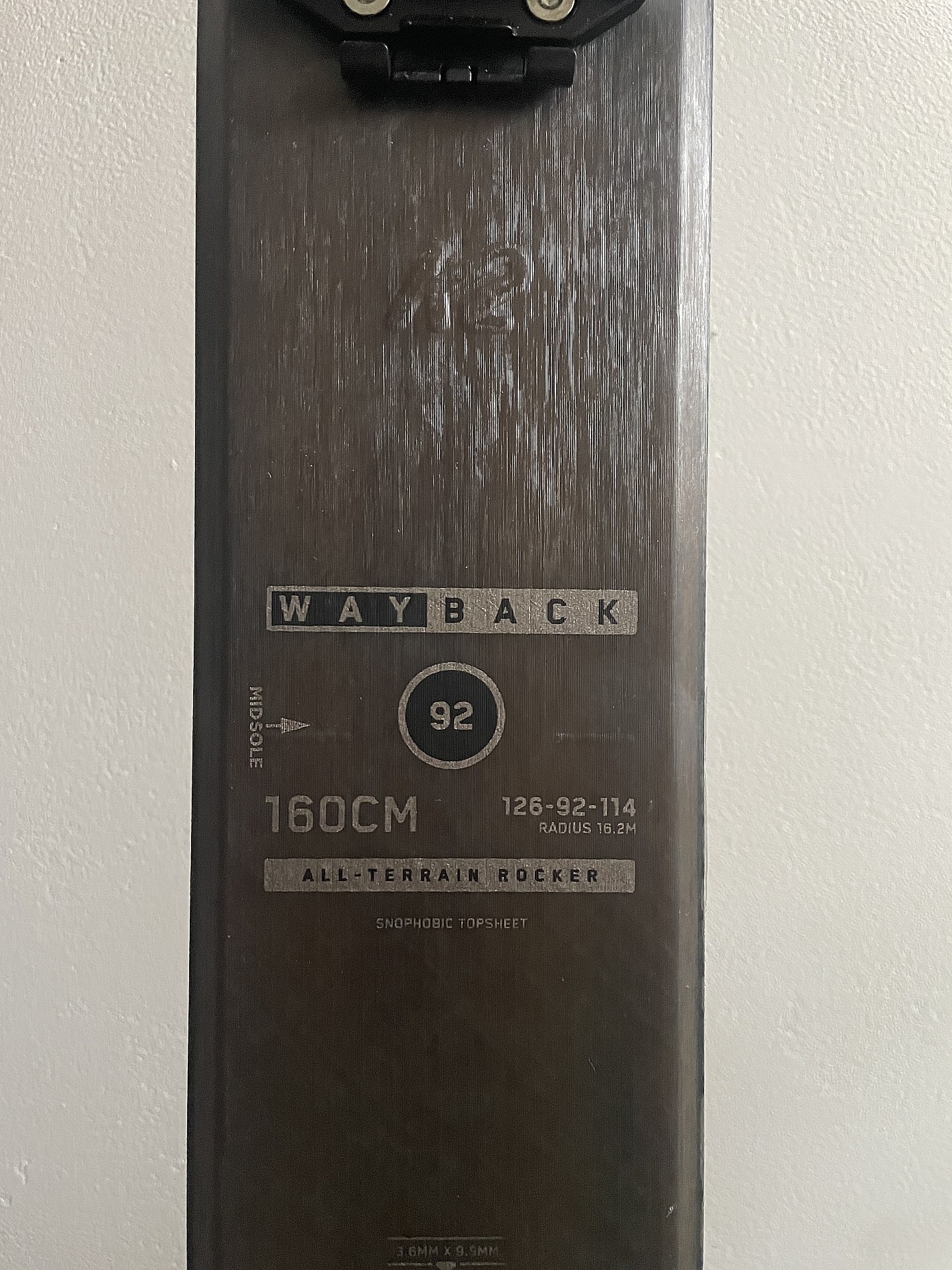 Ski K2 wayback 2026 92mm au patin, 160cm de longueur. Percés pour aller sur des semelles de 290mm à 320mm.