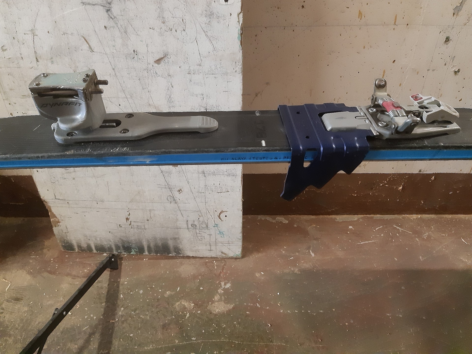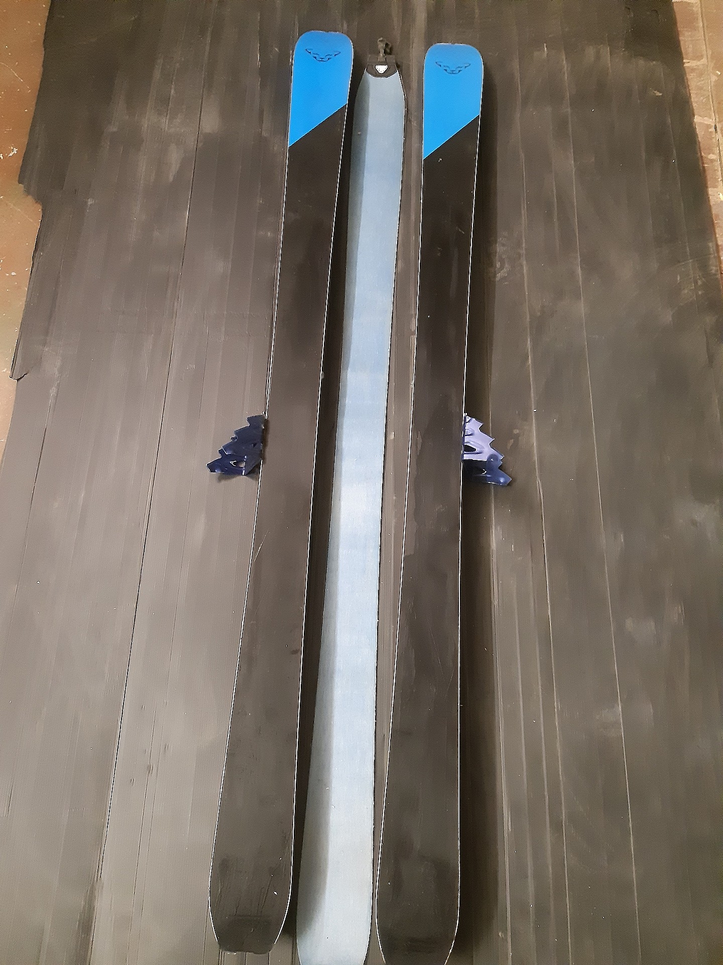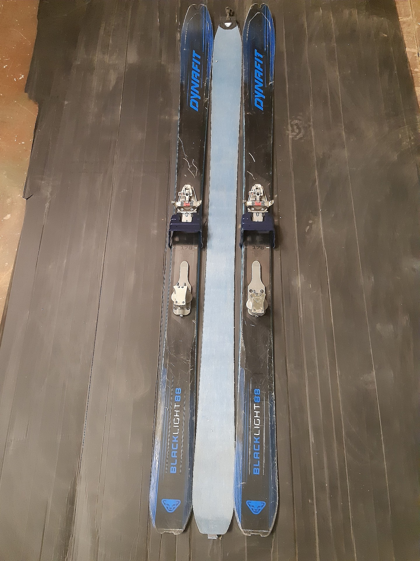 Dynafit Black Ligth 88 en 178 avec peaux et couteaux. Les fixations ont été changées. Seed Radicale Blue à l'origine , aujourd'hui montées avec des TLT Confort (elles ont une grande possibilité de réglage). Seuls 4 trous sur 8 ont pu être réutilisés .Il y a donc 2 trous à l'avant et à l'arrière qui ont été rebouchés .La longueur varie de 28.3 à 30.8 de l'axe de l'insert à l' arrière de la chaussure. Le tout en très bon état
