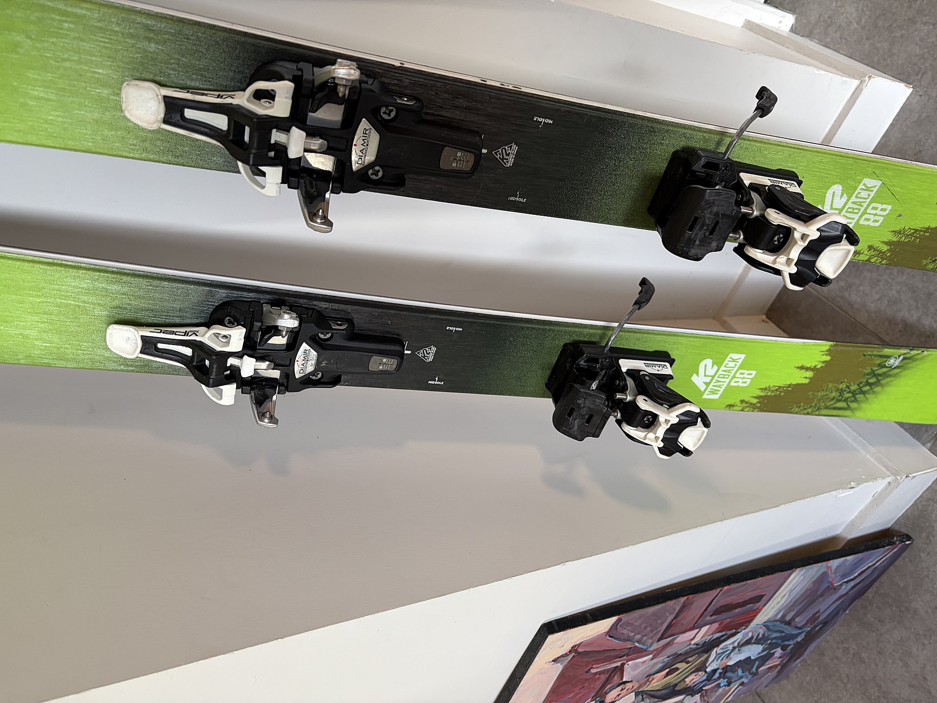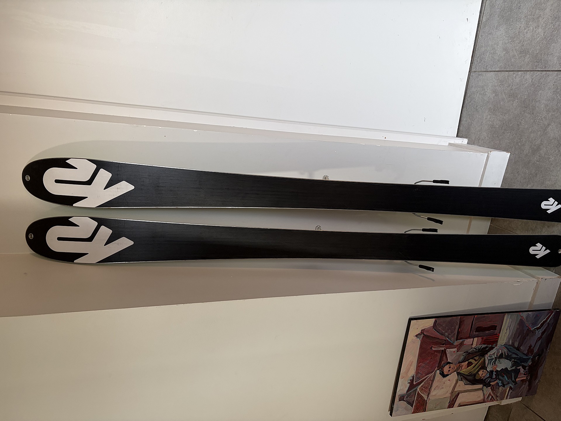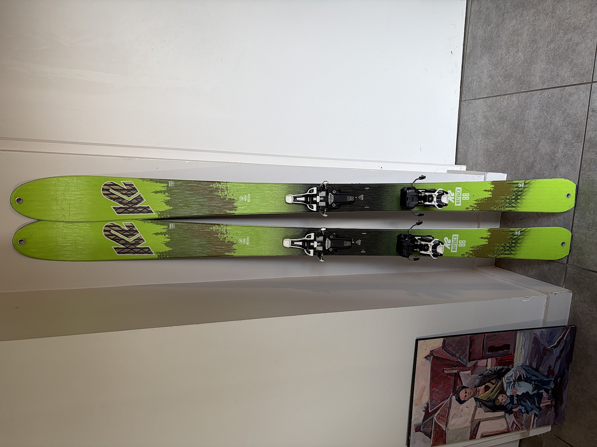 K2 wayback en parfait état avec les peaux de la marque (POMOCA). Semelle impeccable et carres affûtées par moi même. Je farte à chaud toutes les 3 ou 4 sorties. Couteaux. Les fixations sont le top pour la sécurité.