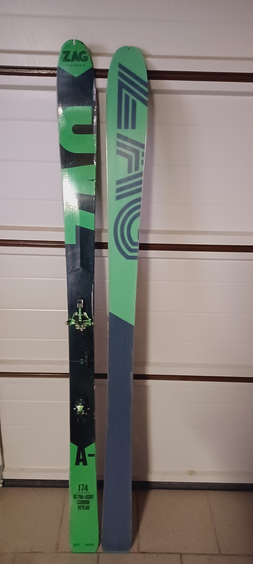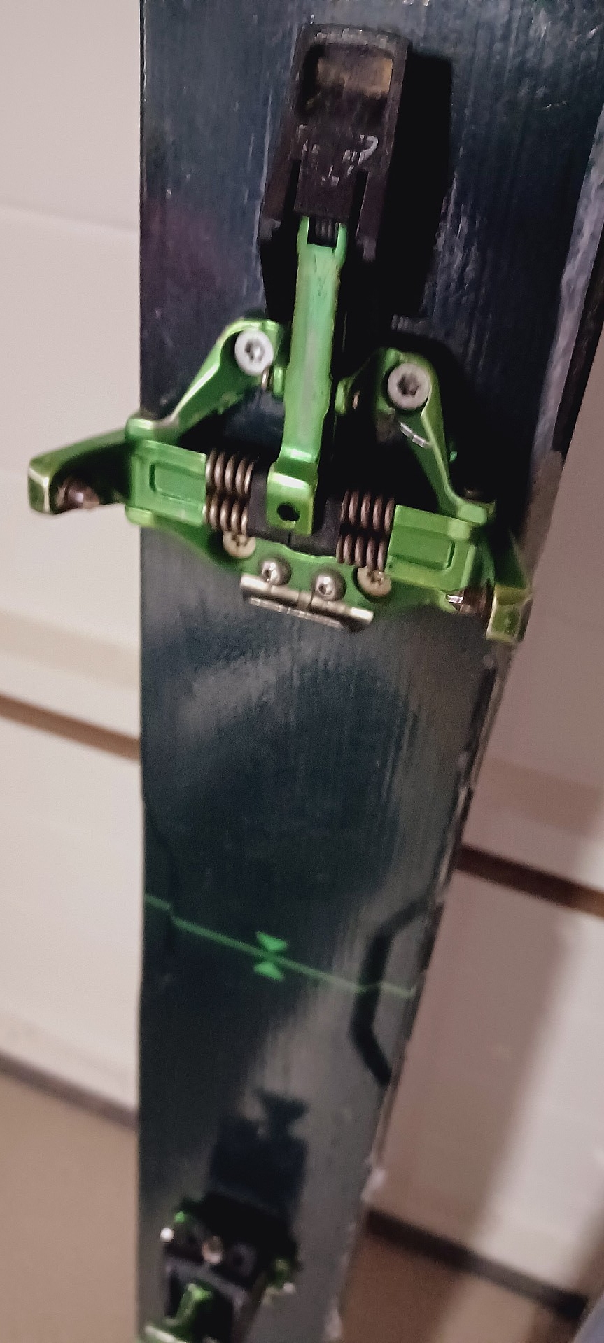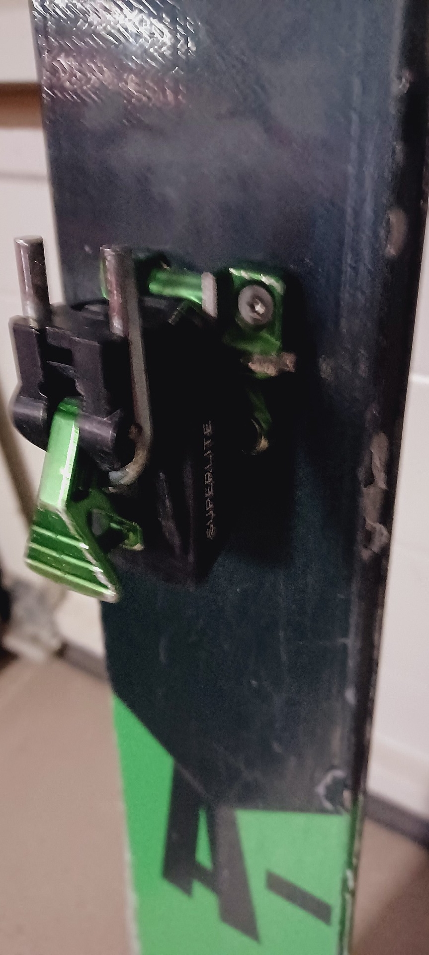 Semelles en bon état c'est le topsheet du ski qui a vécu. Fixations Dynafit superlite 175 pour chaussures 28 28.5 en 308 mm. Visible sur Quintal.