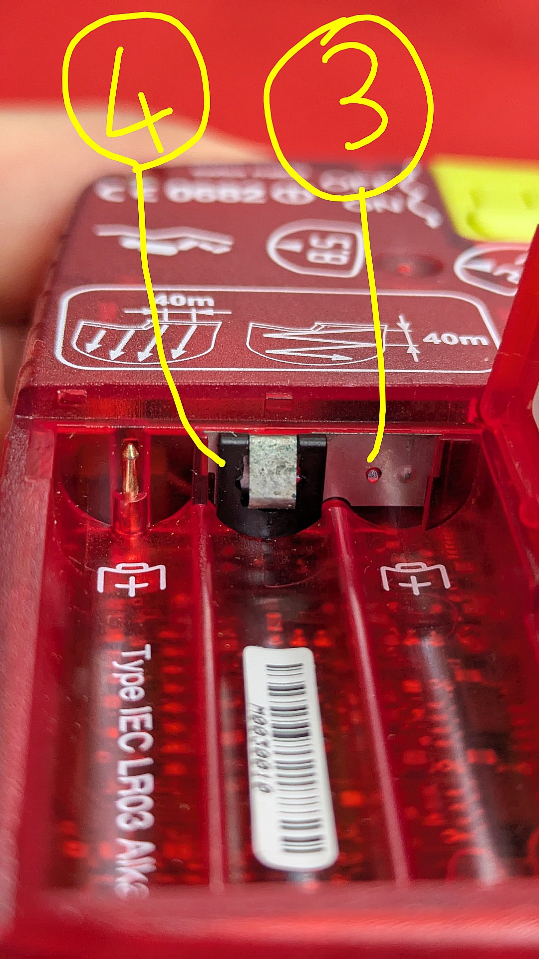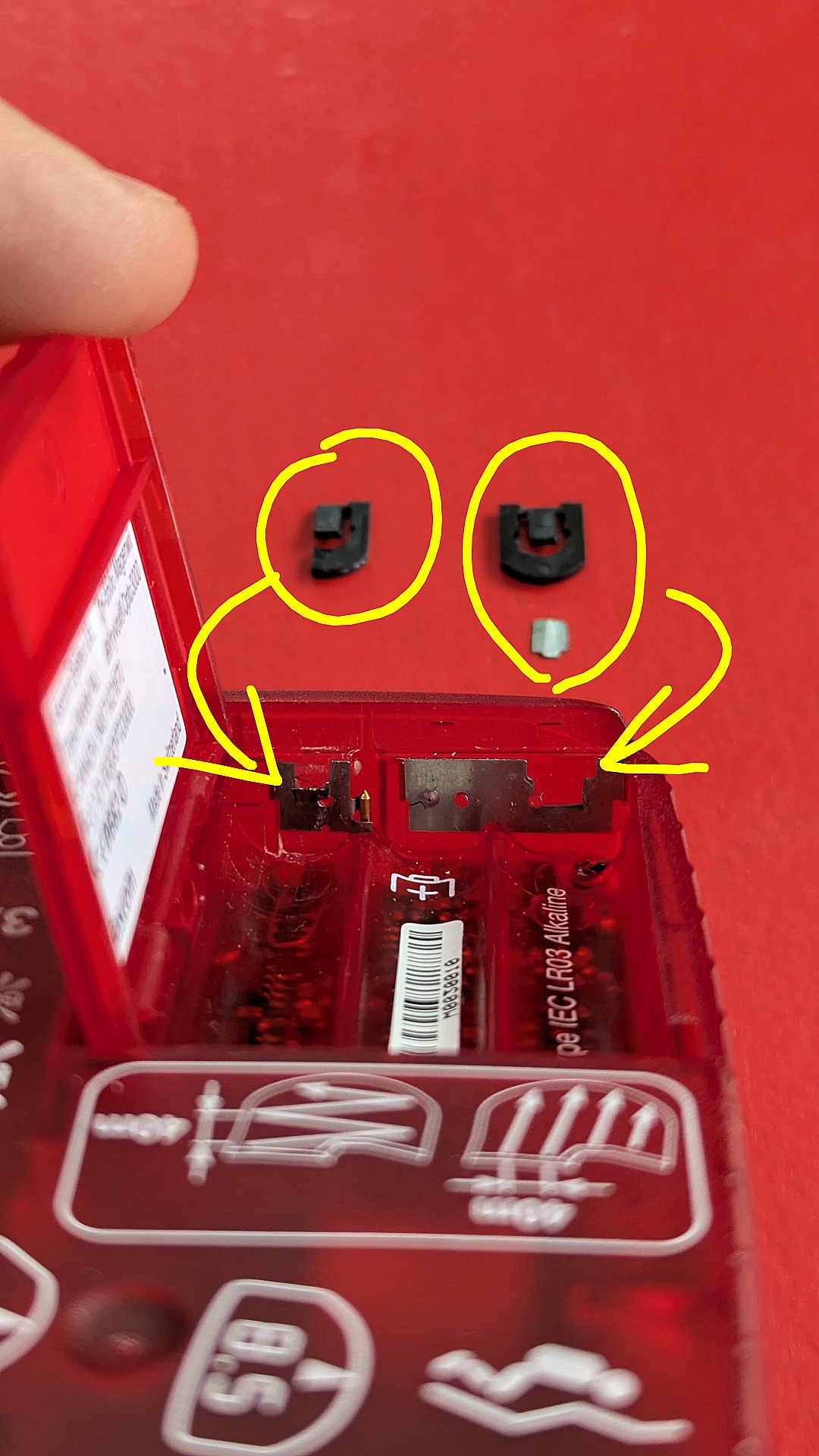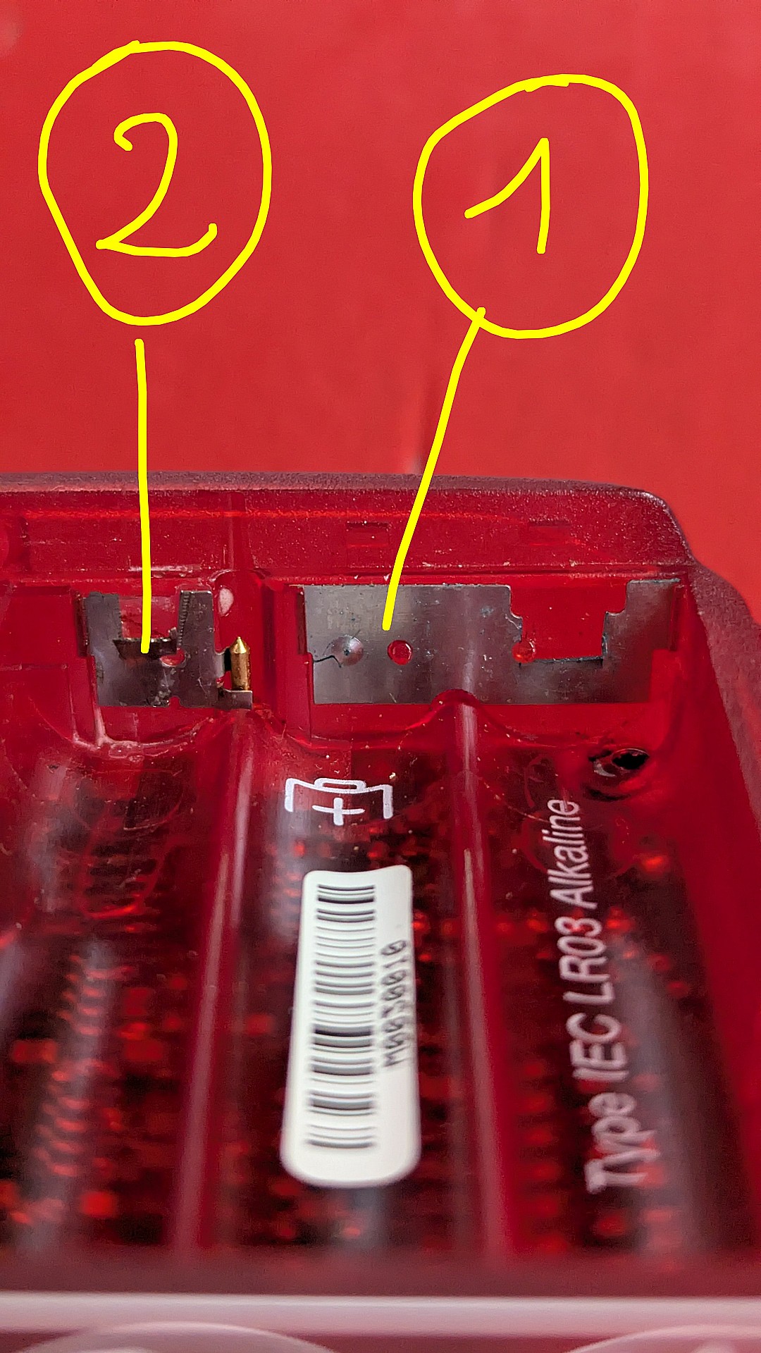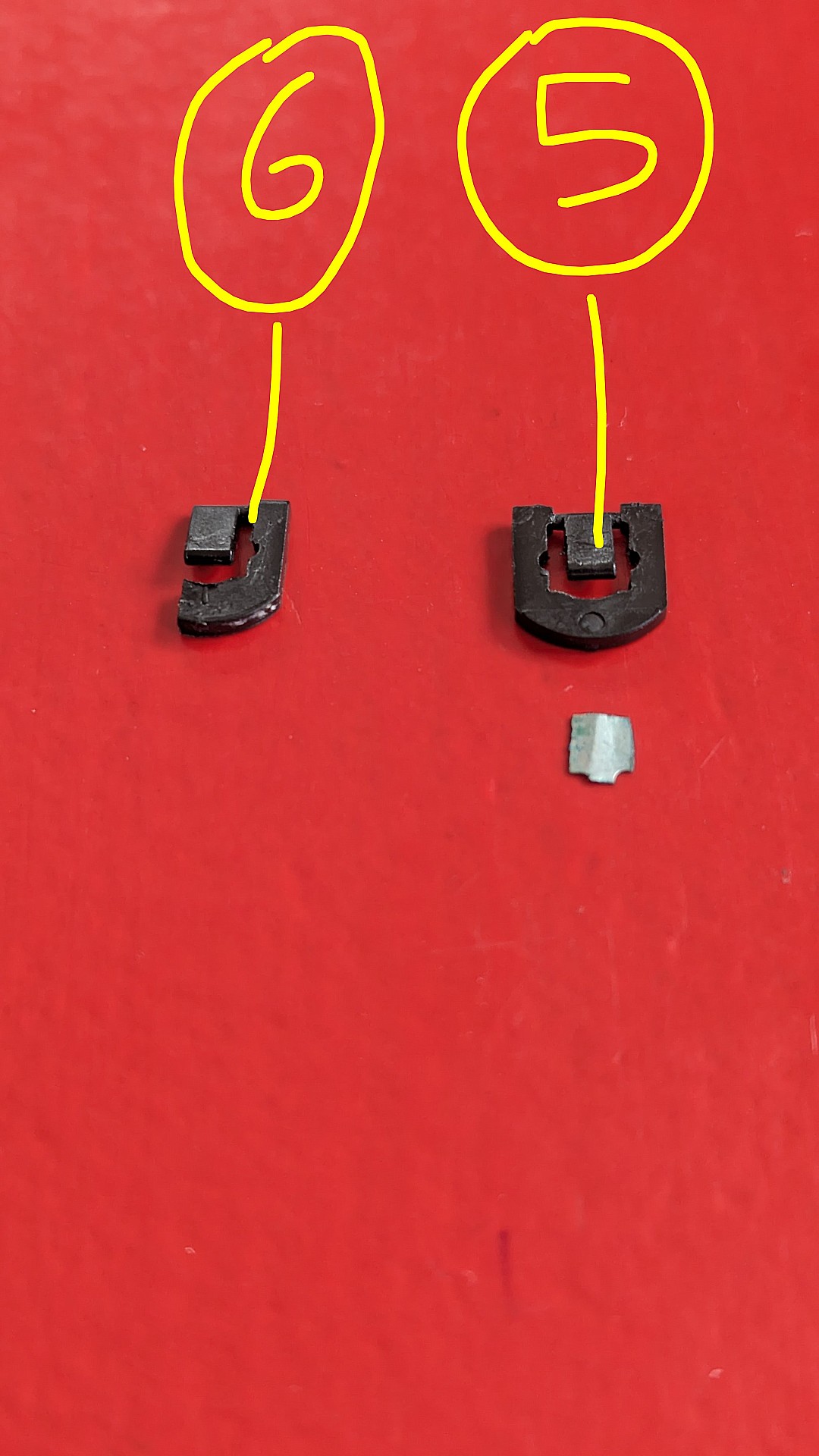 Recherche conducteurs métalliques (pièces 1+2+3) + "pastilles" plastiques (pièces 4+5+6), pour le logement des piles de mon DVA Mammut Barryvox Opto3000.