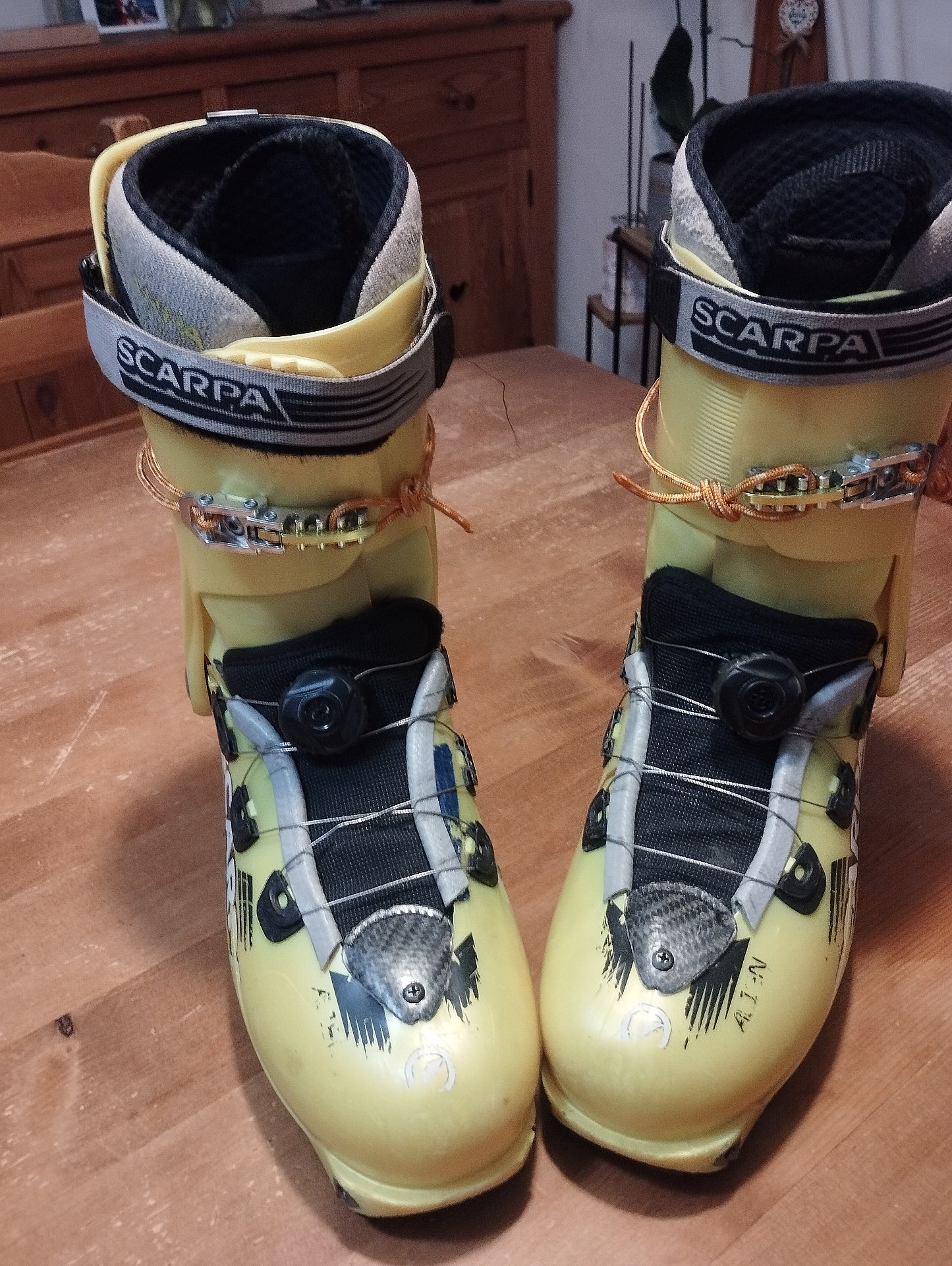 Chaussures scarpa Alien. Peut encore faire des sorties où pour pièces. Chansons corrects,la coque bien fatiguée.