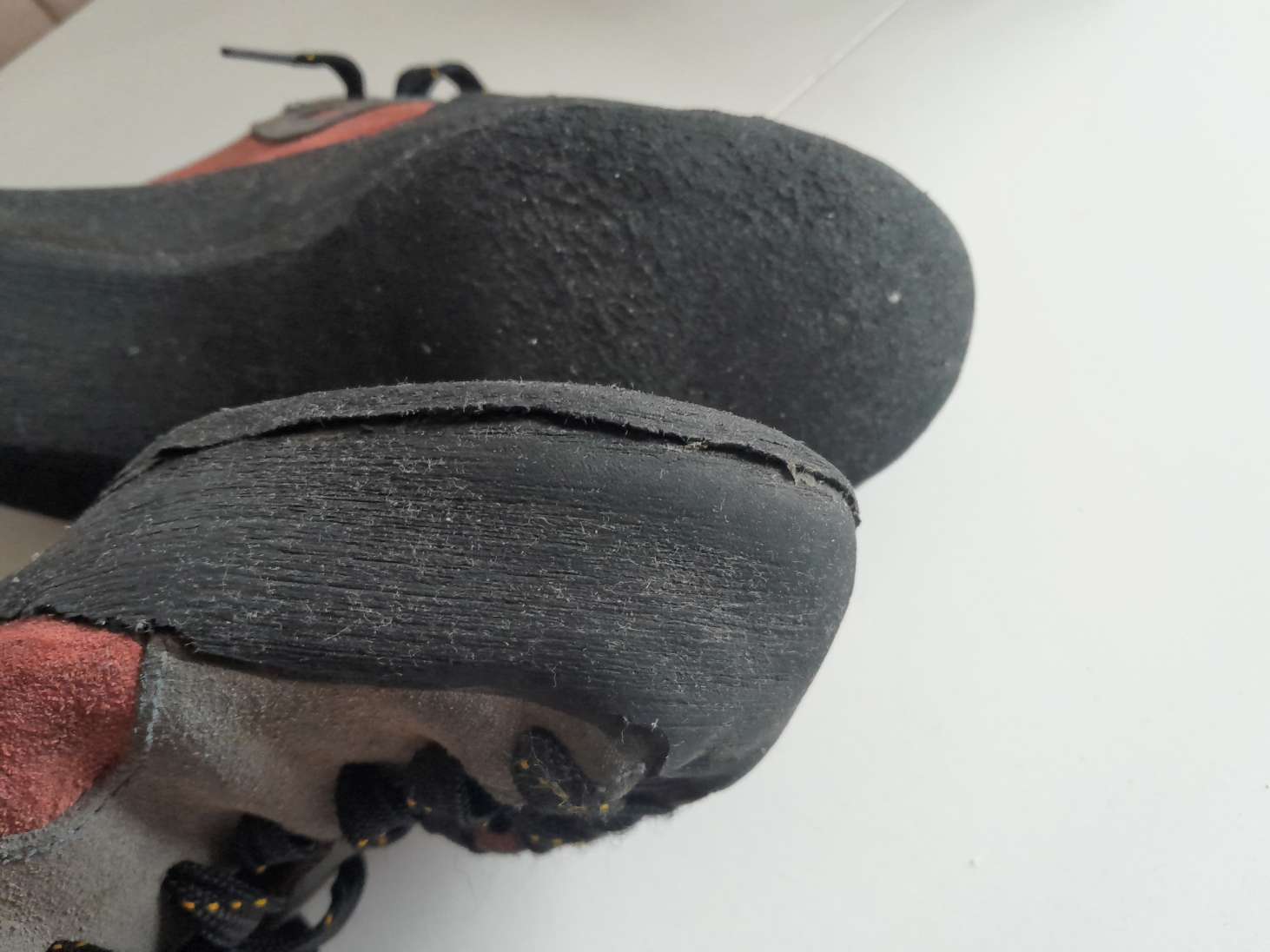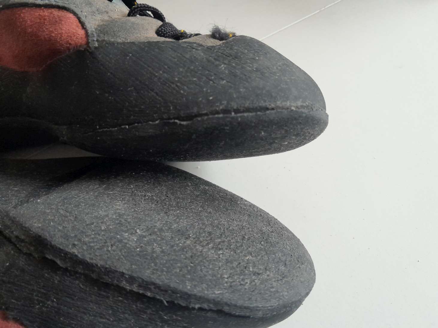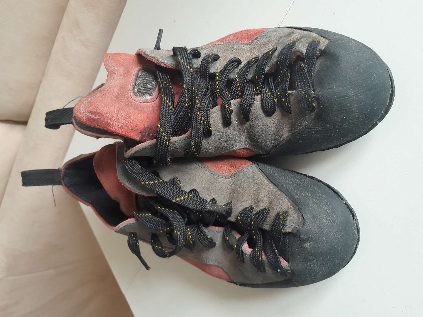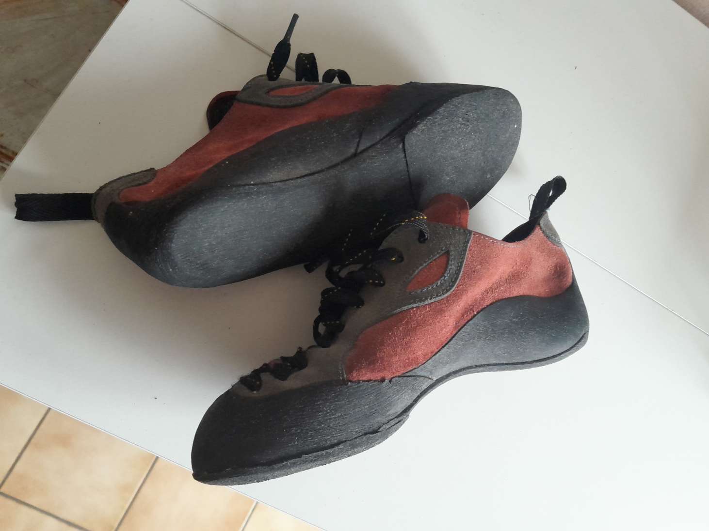 Usagés mais fonctionnels. Ressemelés 1 fois. P42/ 27,5. Pas d'étiquette. Poudrés régulièrement contre les mycoses. Cambrés mais confortables en raison d'un talon peu puissant. Plutôt typés débutant ou grande voie.