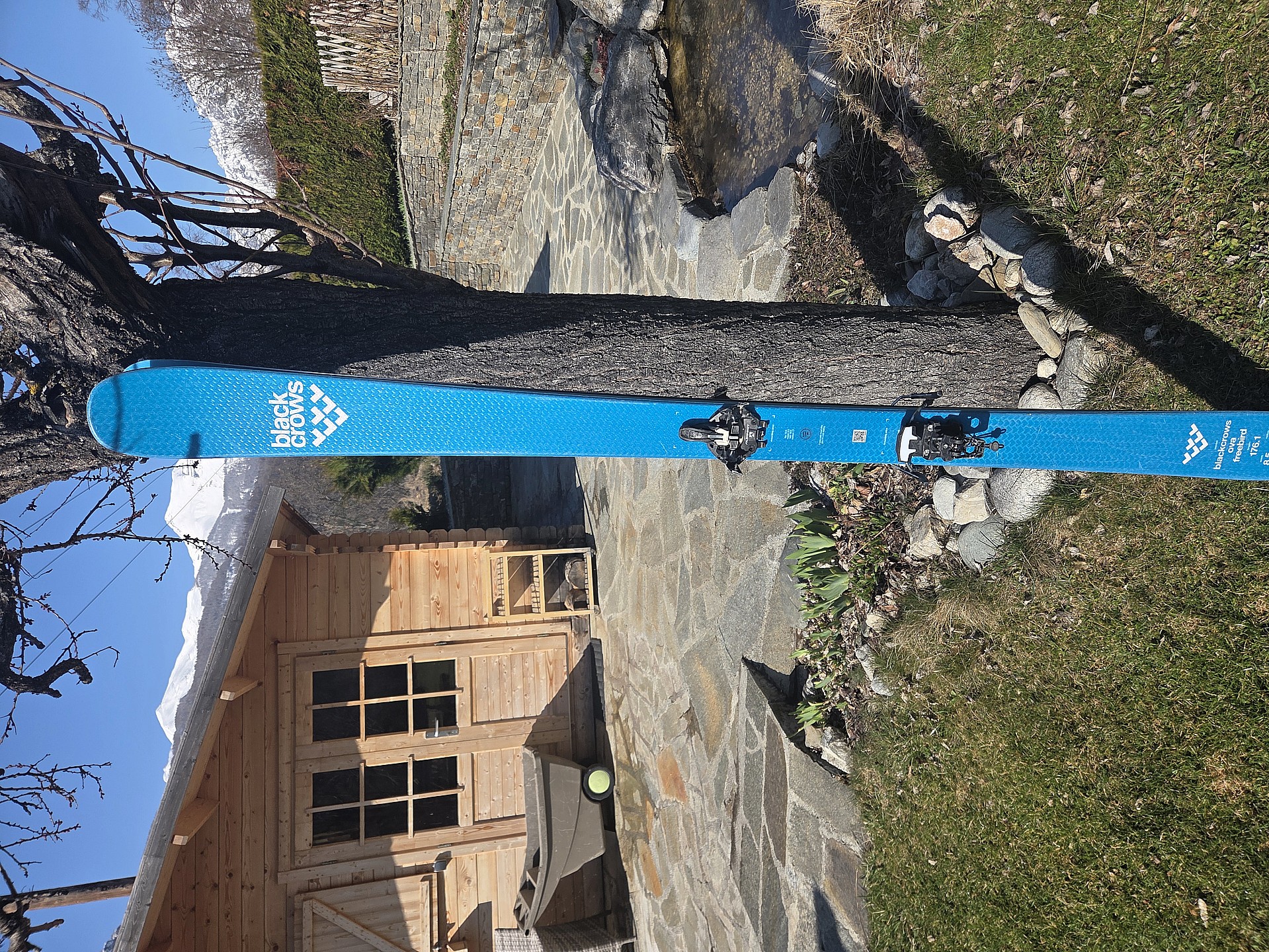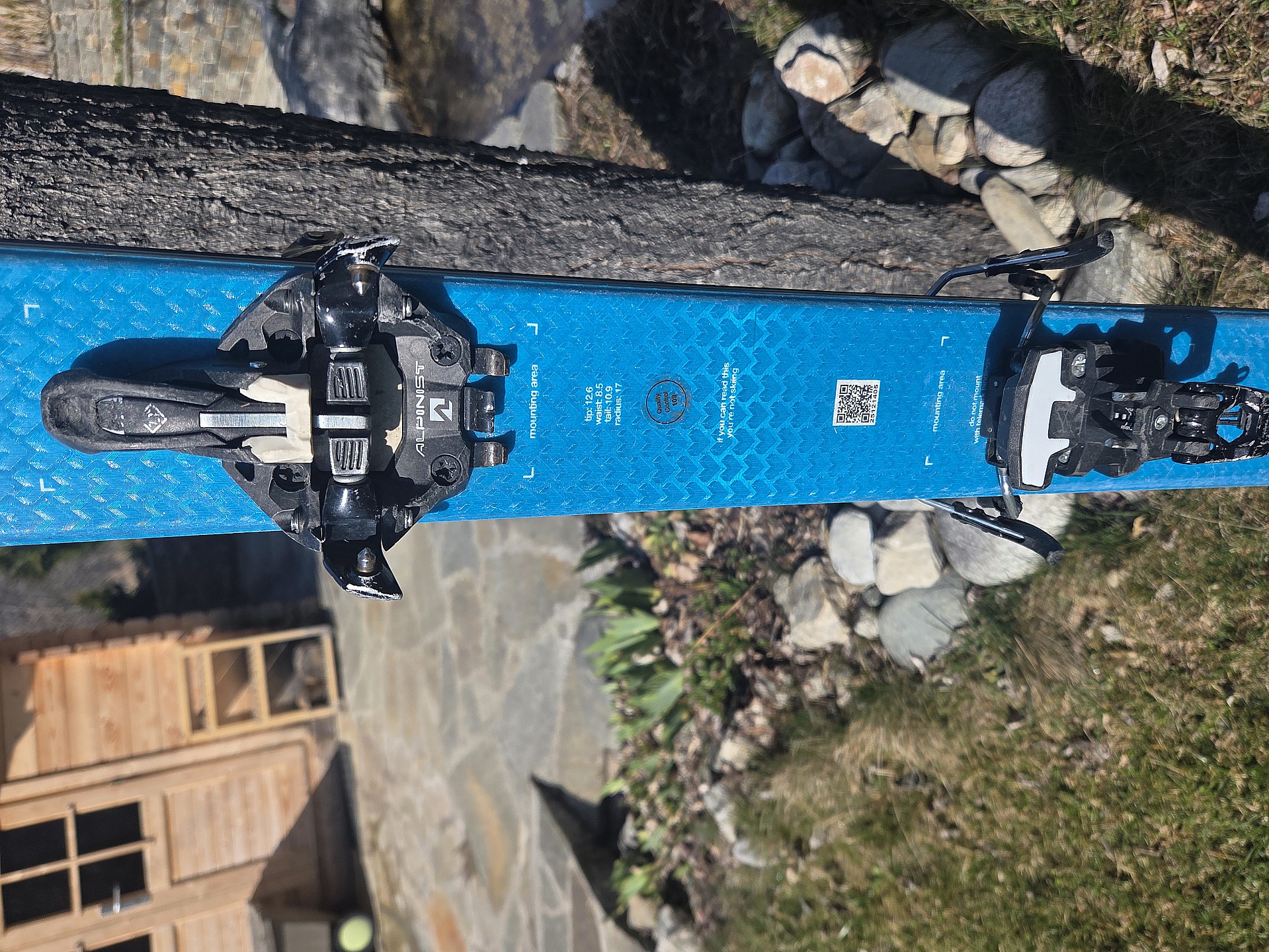 Ski de randonnée Black Crow de 176 cm et 85 au patin avec fixation Alpinist et stop skis monté pour des chaussures de 297 de longueur mais légèrement réglable.