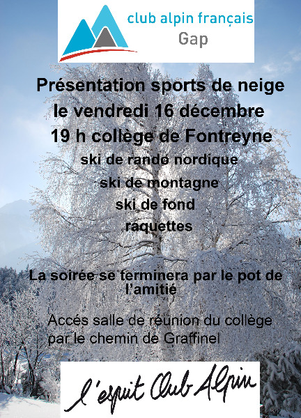 La soirée de présentation ski de rando et autres sports de neige du CAF de Gap saison 2016/2017 aura lieu le 16 décembre.
