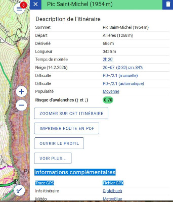 J'allais dire.. oui je sais le faire pour les itinéraires pré-établis — "itinéraires de randonnée hivernale"="petzl"="oranges ign"="traces hivernales de geoportail". Mais quand je trace moi-même sur skitourenguru, je n'ai pas la fonction "Informations complémentaires -> Trace GPS Fichier GPX" . Par exemple [img]