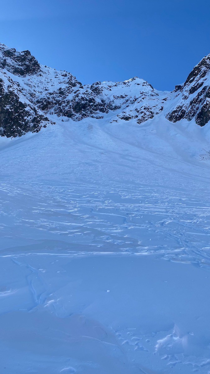 Direction le Col du Moretan (loupé l'an dernier), neige dure le temps de traverser à gauche mais ça passe sans couteau, je le mets au pieds du grand couloir (j'ai les crampons dans le sac au cas où). Je suis plus ou moins des traces de la veille mais effacées par le vent, faut faire gaffe pendant les conversions mais ça passe bien. Sortie directe par la petite arête au-dessus. Pas mal de vent bien frisquet dans la dernière petite combe qui monte au col, ambiance arctique même avec les galops de poudre balayés par Éole. Col, hop hop hop, je traîne pas, descente bien pourrie dans une neige irrégulière. Descente par la pente de droite, je recroiserai de loin le groupe de 4 d'hier soir qui passe par le col pour aller sur Puy Gris. A priori ils mettent les crampons, un autre gars seul garde les skis.