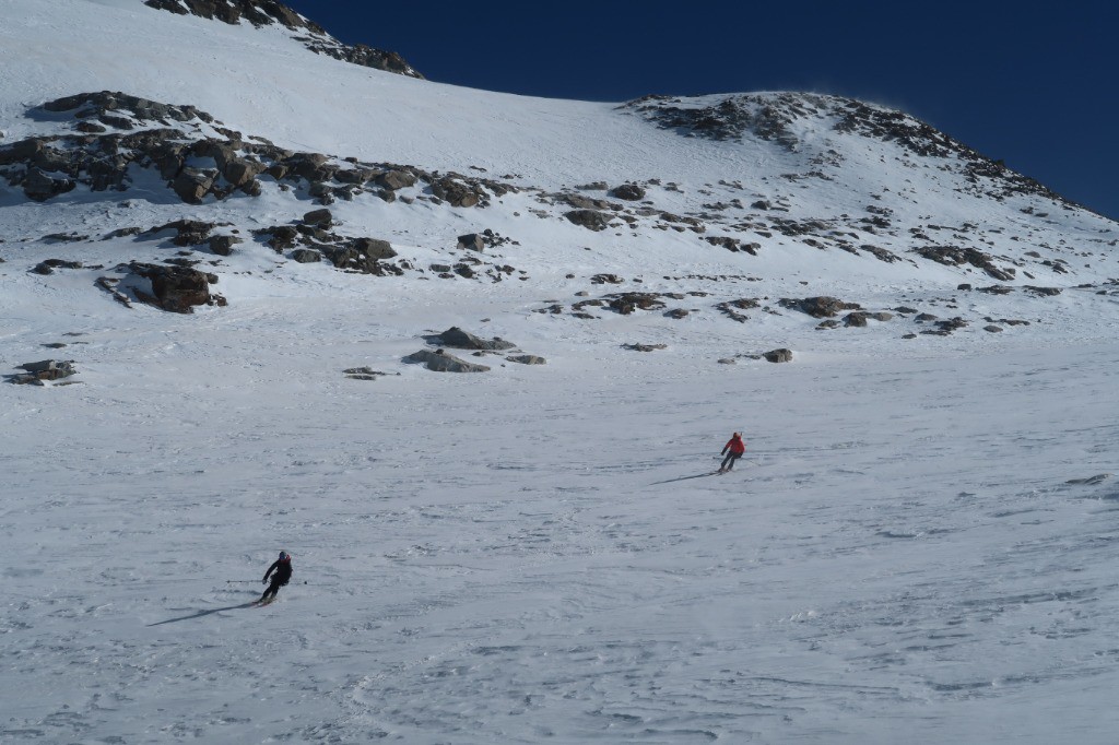 La descente est pas si mal si on enlève les pentes gelée sous le sommet. C'est plutôt bon dans la combe jusqu'au refuge et ensuite juste revenue nickel. On finira en ski jusqu'à la voiture.