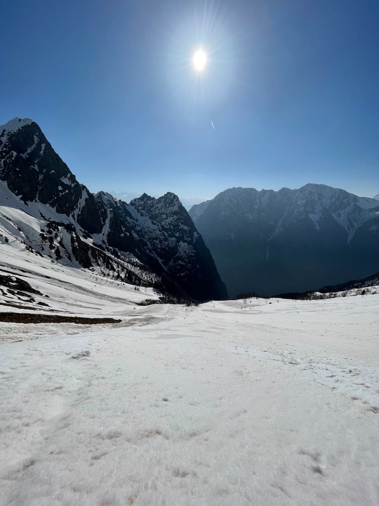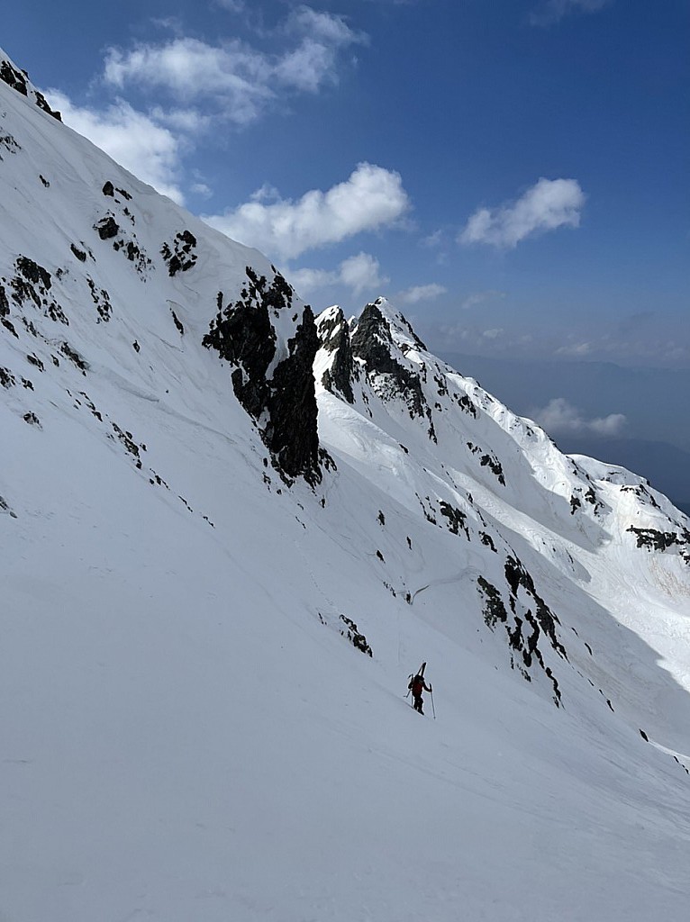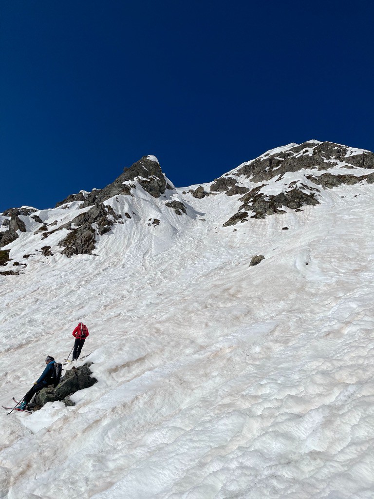La remontée vers le col de la Passure est, comme prévu, un four. Paradoxalement cette partie sud de la combe est moins ravagée par les avalanches et il y a de belles portions en moquette. Je me ferais un petit À/R de 250m pour en profiter. Sinon belle ambiance, les chamois nous toisent au loin, la vue sur le Sorbier et le couloir skié est superbe. Il faut cramponner 150m pour passer le col.