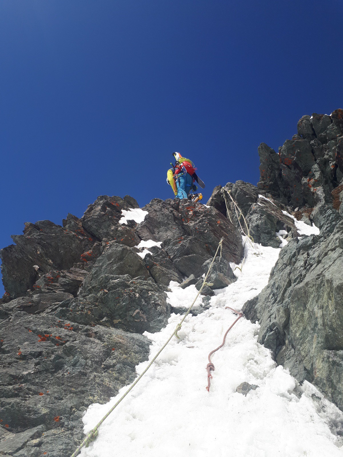 L'arrivée au Col des Roches et sa vue sur les pentes sommitales nous rassure et nous redonne de l'énergie. Le glacier est bien bouché. Le passage du col se fait très bien grâce aux équipements en place. Court passage sur les rochers puis descente dans la neige pour rejoindre le glacier du Geay.