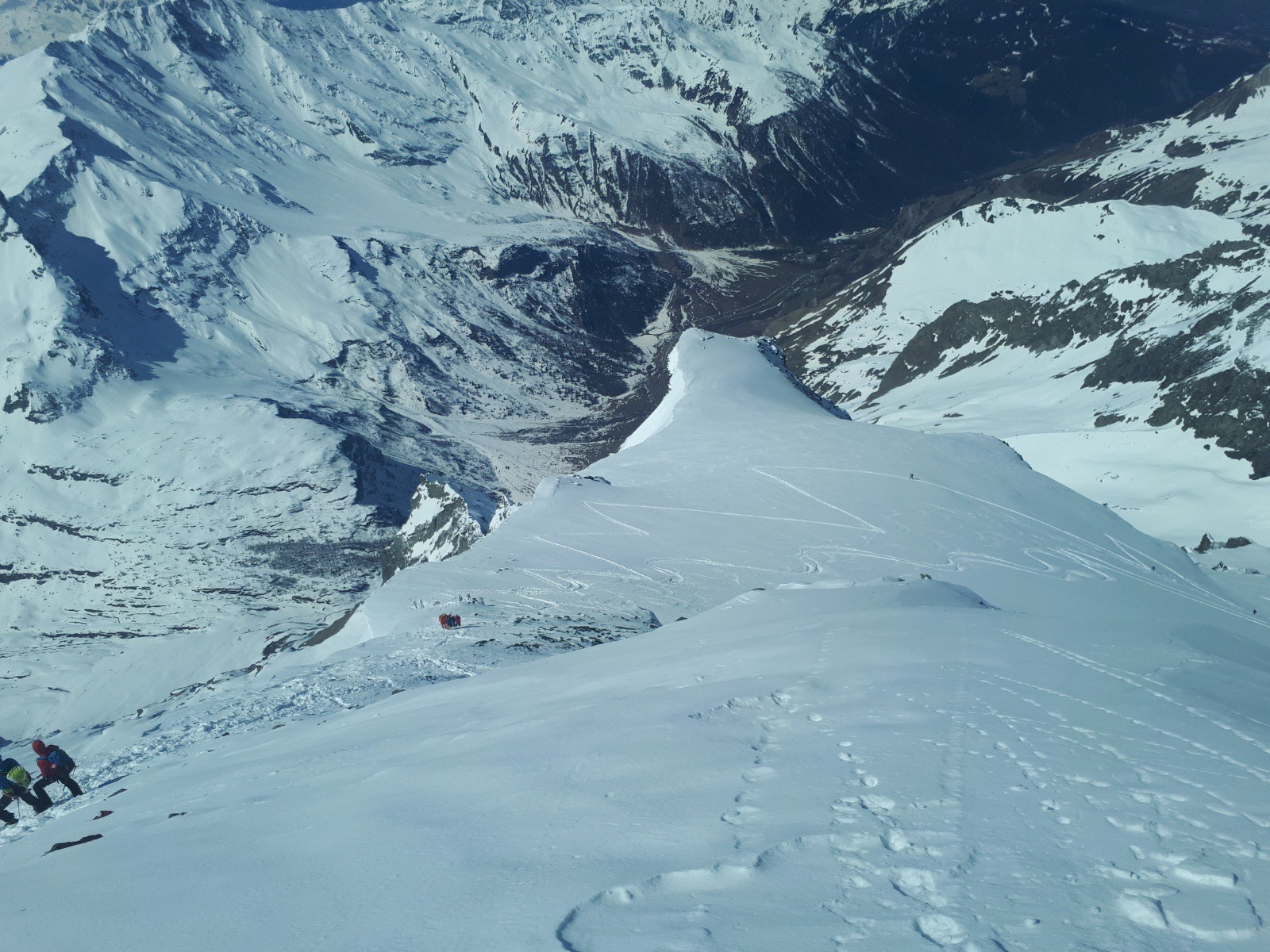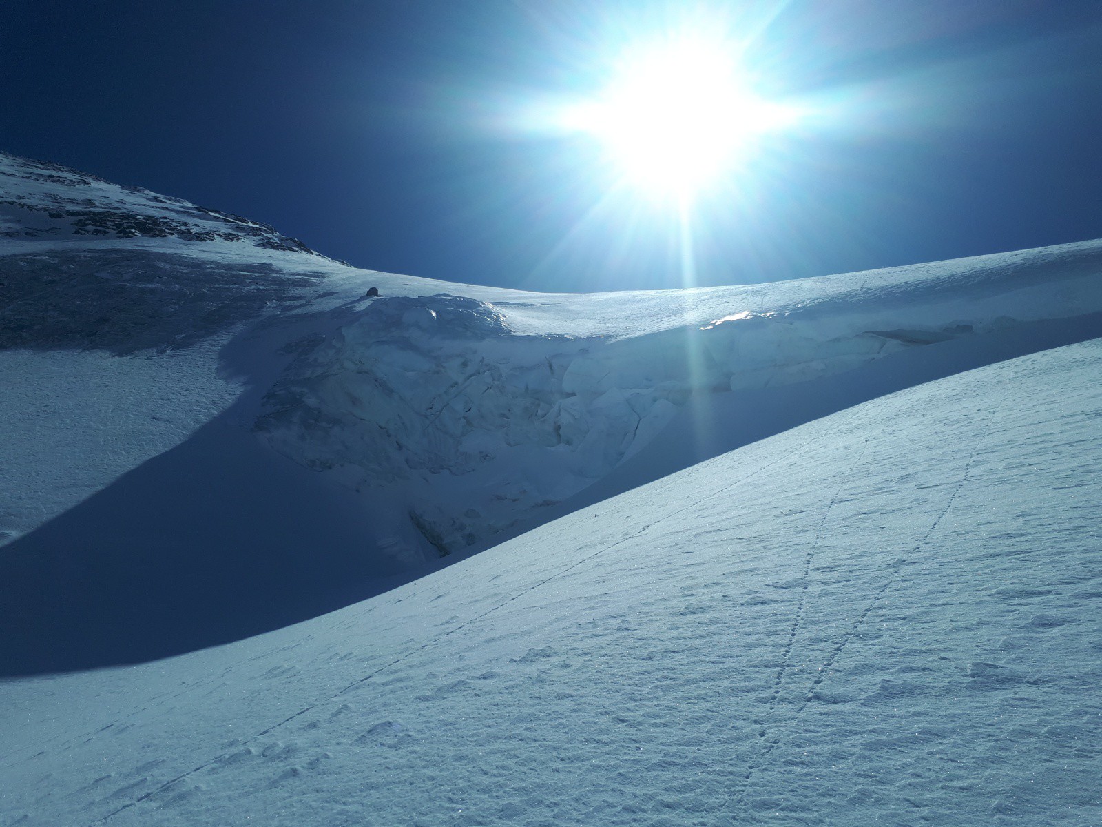 La rimaye est bien bouchée. On retrouve la "trace à deux étages" qui ajoute aux difficultés liées à l'altitude. Toutes les cordées ralentissent quelque peu mais les sourires les relient toutes.
