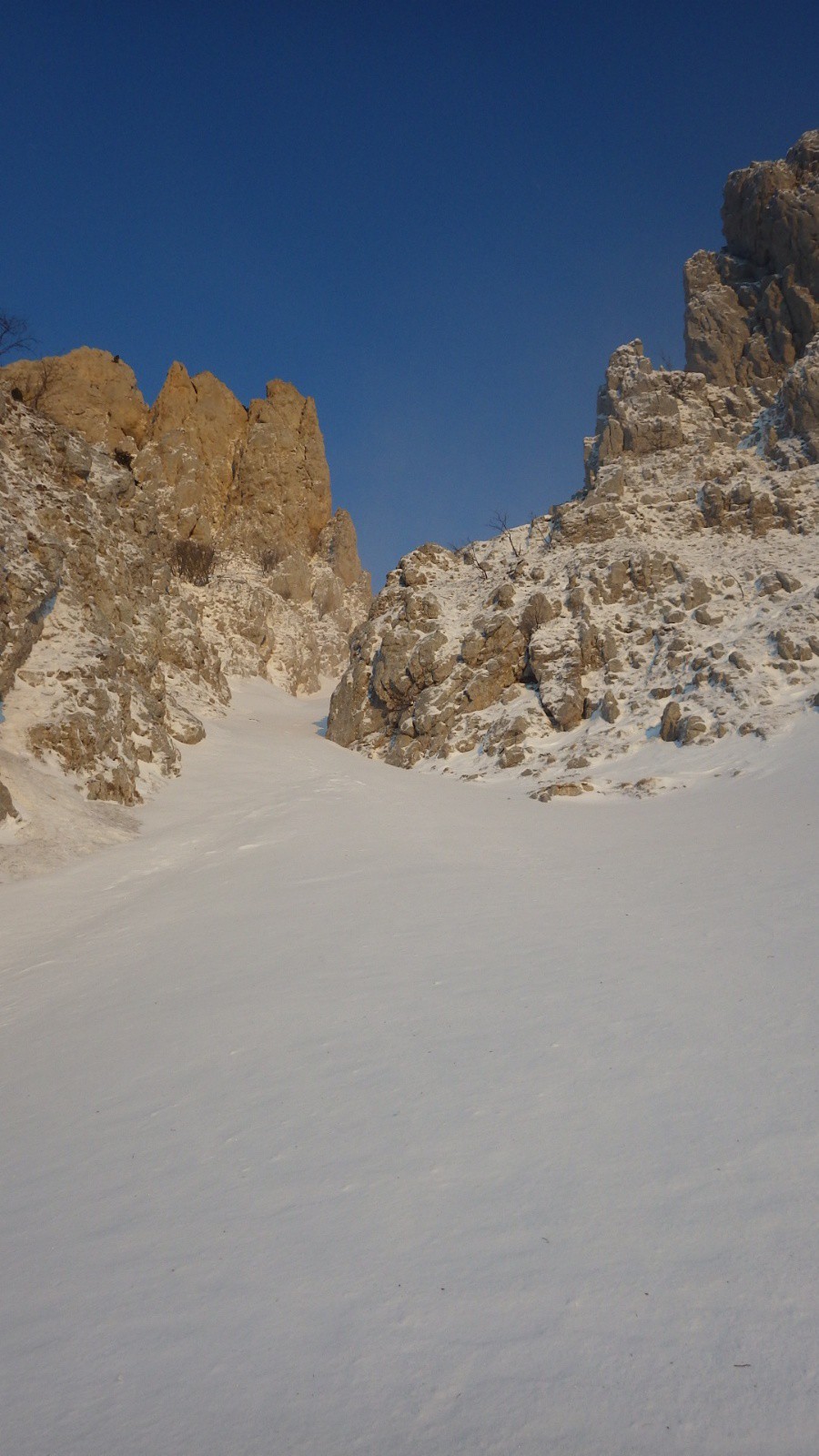 Je poursuis, en me rappelant le nombre de fois où je suis venu ici, et où les doutes s’étaient envolés dès l’étroiture passée. La neige descendue des rochers et pentes latérales s’accumule ici, et 30m plus haut, la situation nivologique devenait plus saine (selon nos (ou mon) jugements),