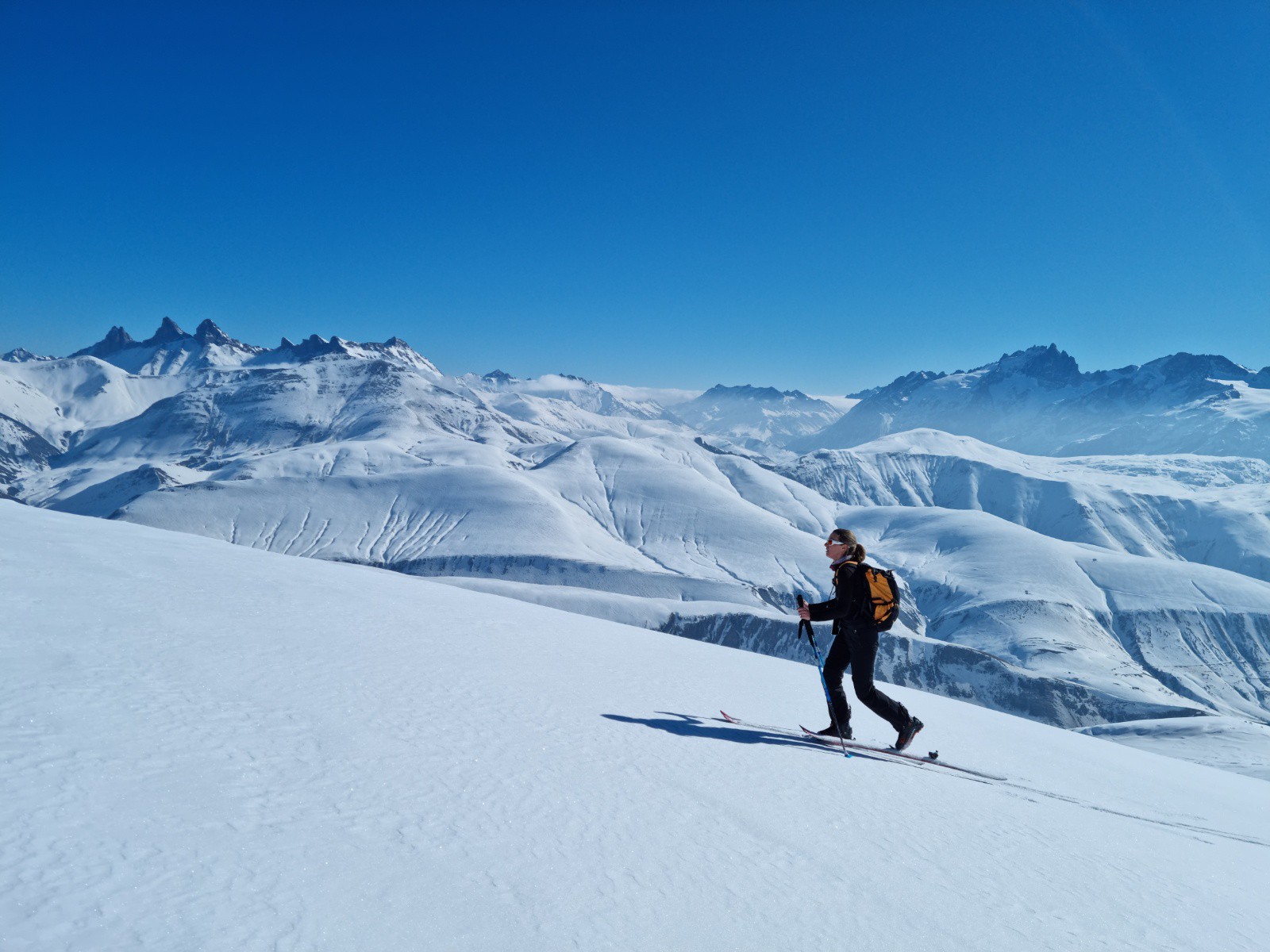 Itinéraire suivi :départ de l'Alpe d'Huez - remontée mécanique jusqu'au 3ème tronçon au sommet du Pic Blanc (3323) puis début de la descente par le glacier du Grand SABLAT - on met les peaux au Clot du Boeuf (2500) à main gauche de la descente, jusqu'au Râteau des ROUSSES (2888) - descente selon le relief et l'inspiration pour récupérer l'itinéraire du hors piste en direction du lieudit Le Perron au dessus de Clavans Le Haut - on remet les peaux sur la route menant au col de Sarenne d'où on se laisse glisser jusqu'aux remontées menant à la station.