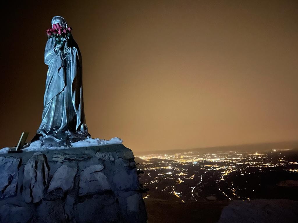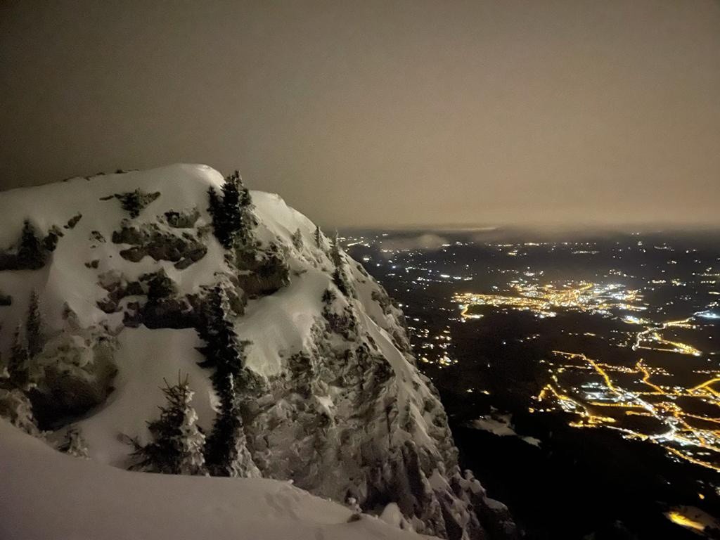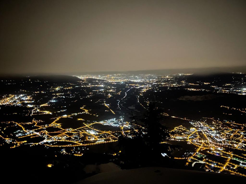 Montée pendant laquelle on aura pu apercevoir quelques étoiles malgré un ciel bien plus chargé qu'on ne l'aurait cru, profiter du spectacle des lumières dans la vallée et donc croiser de près ou de loin quelques frontales. Y a vraiment du monde à toute heure, à Andey!! 😁