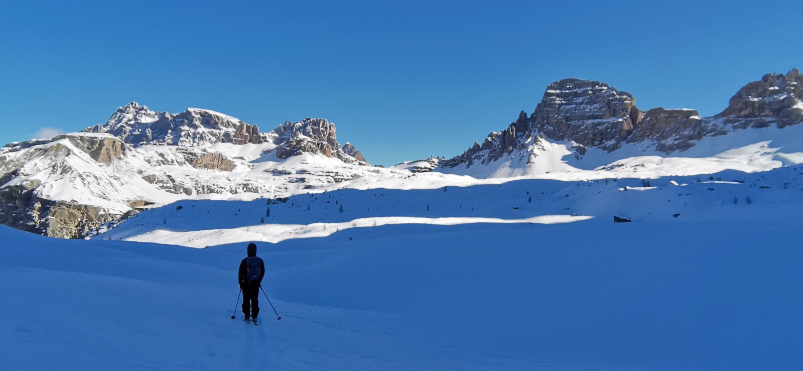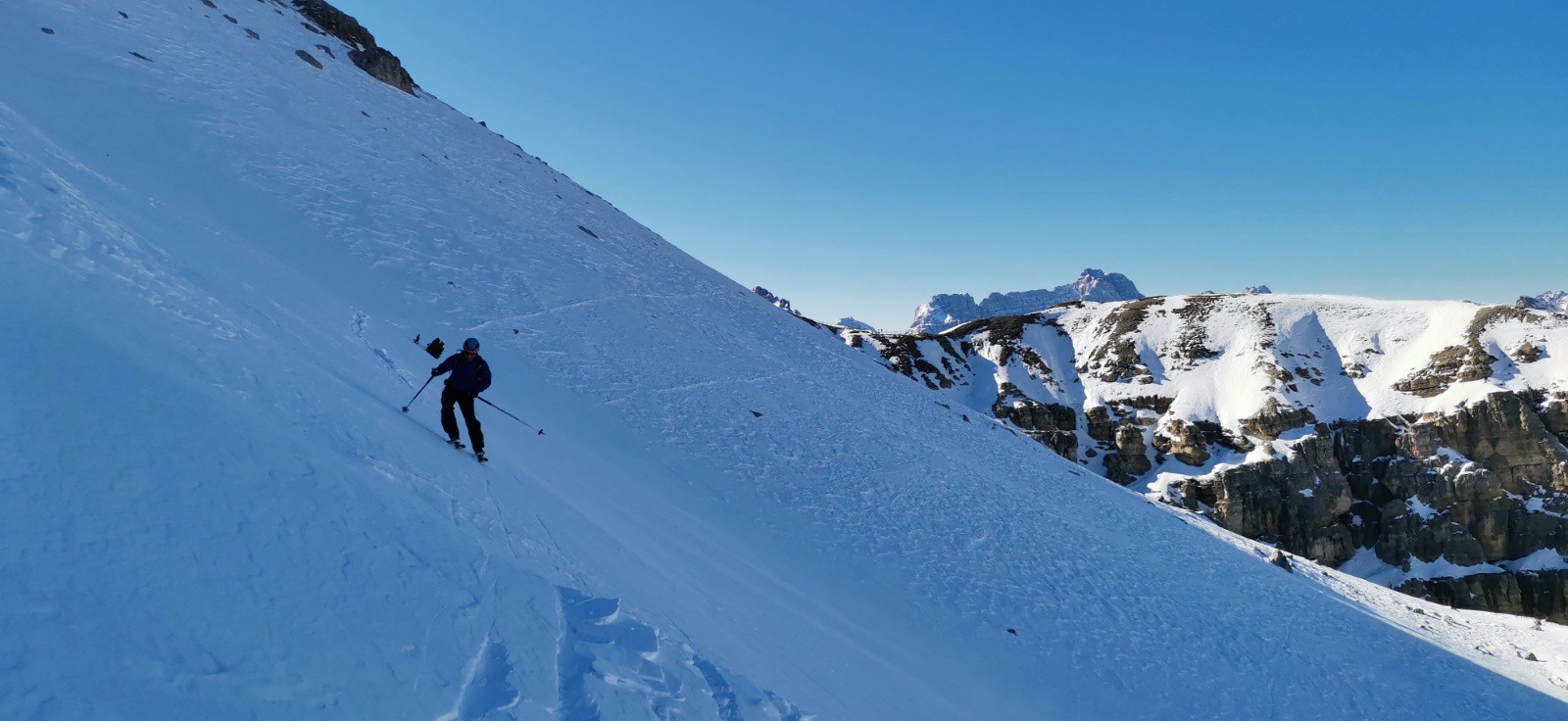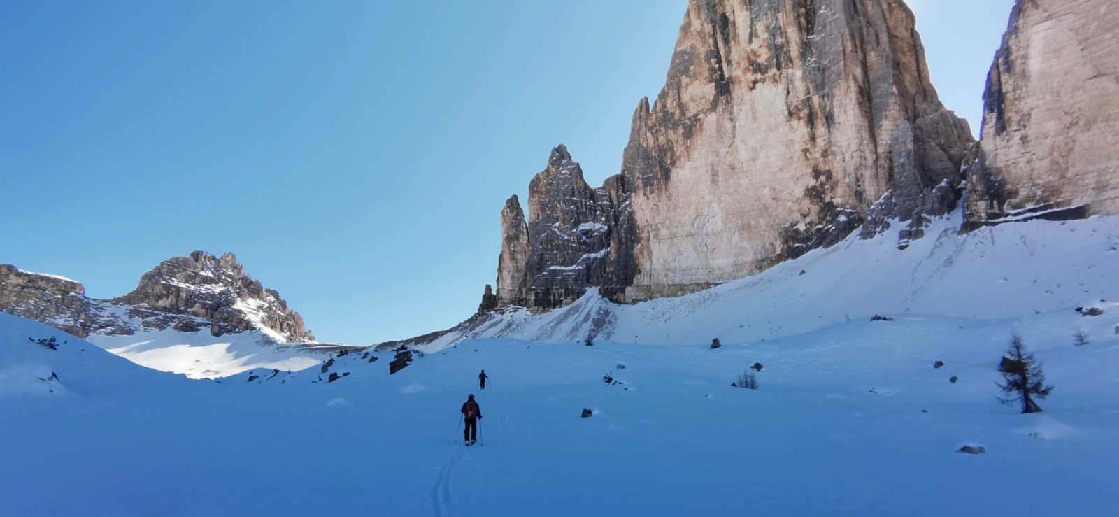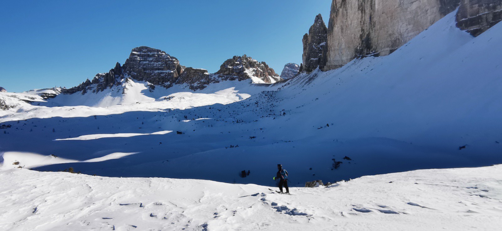 Au col, enlever les peaux pour une traversée descendante exposée jusqu'au plateau, remettre les peaux au refuge pour gagner Forcella Lavaredo.