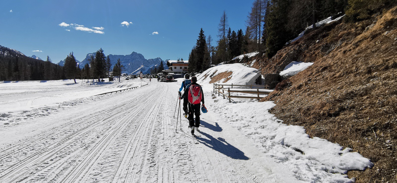 Conditions pour le ski : chemin dans la forêt en neige dure(prendre le chemin 101 pour éviter la piste qui monte au refuge d'Auronzo et le balai des motoneiges qui transporte les touristes.