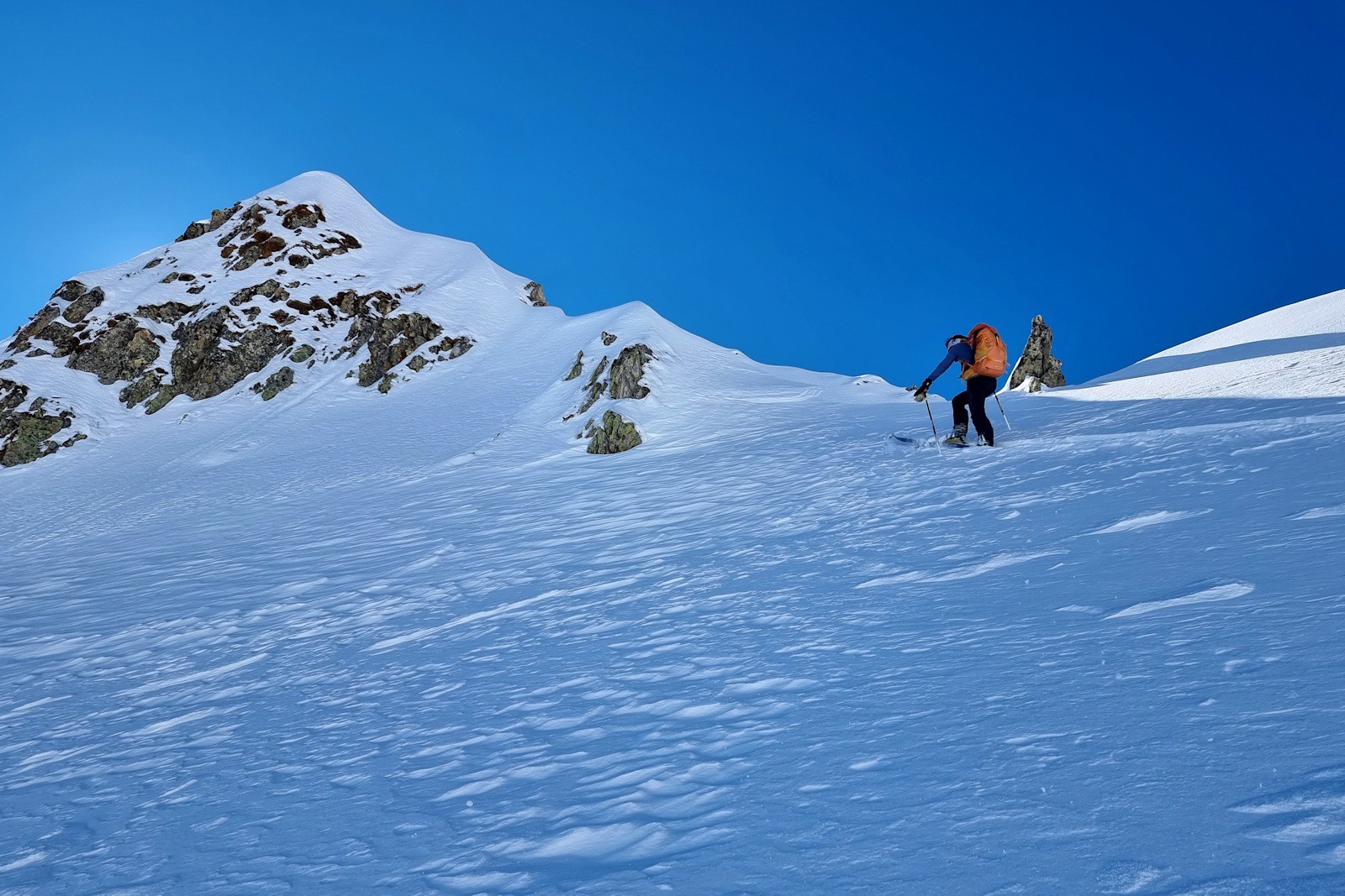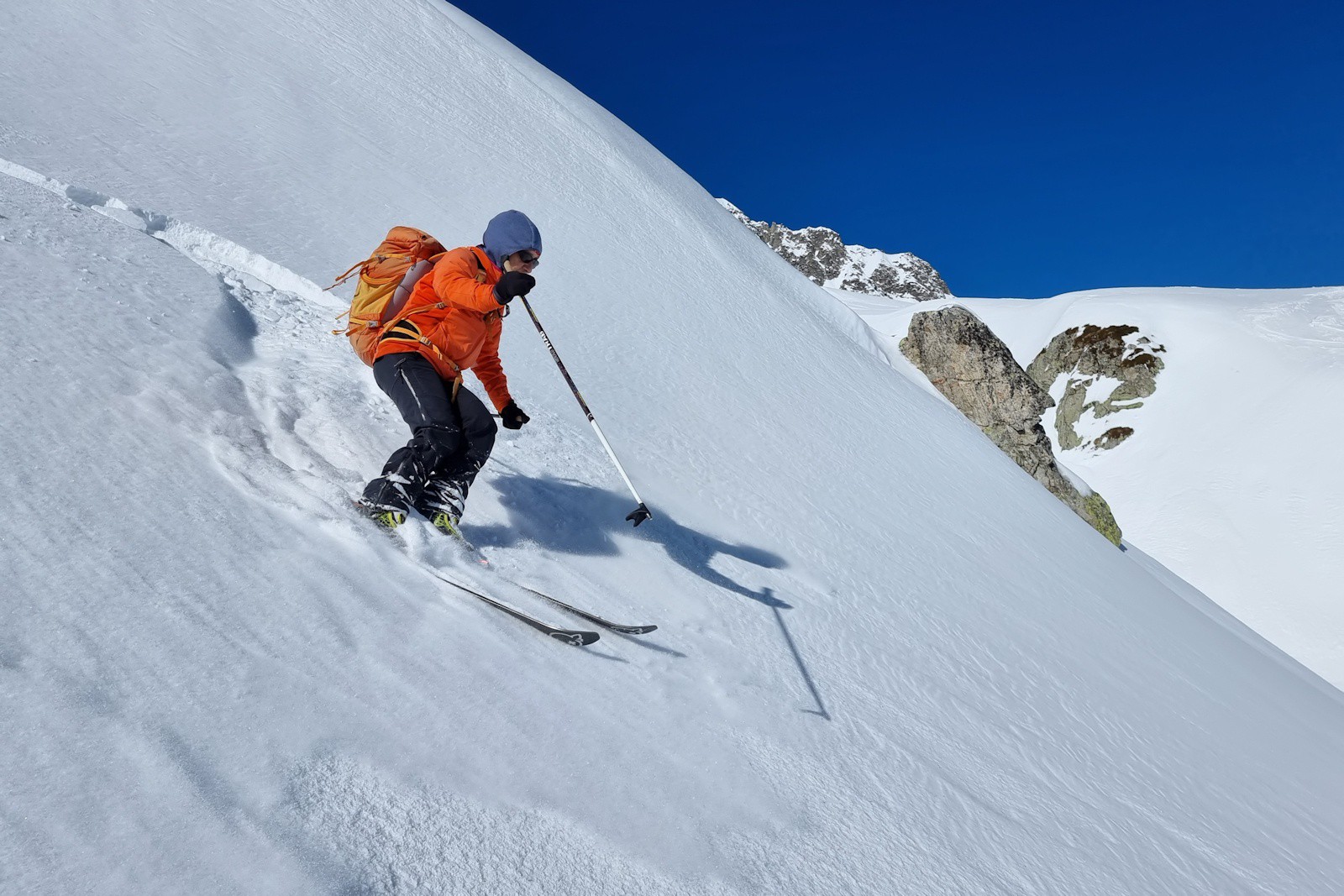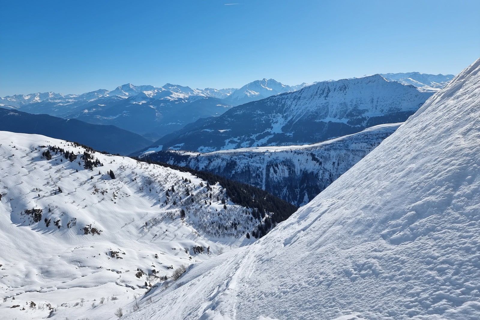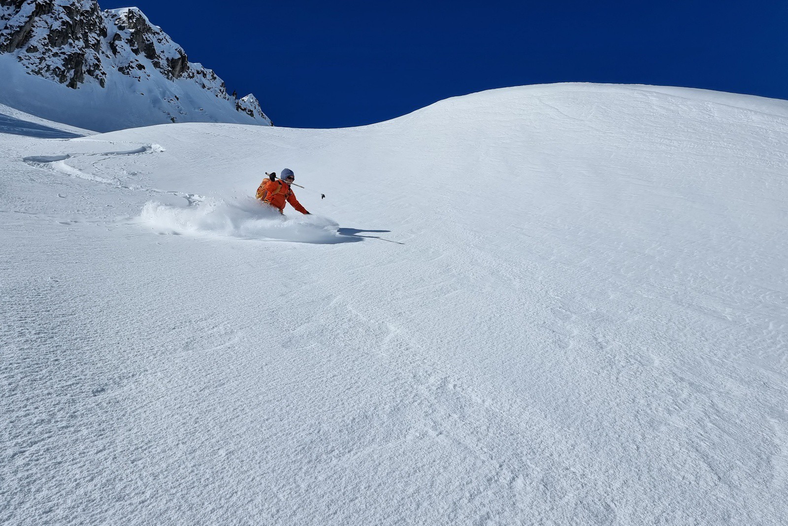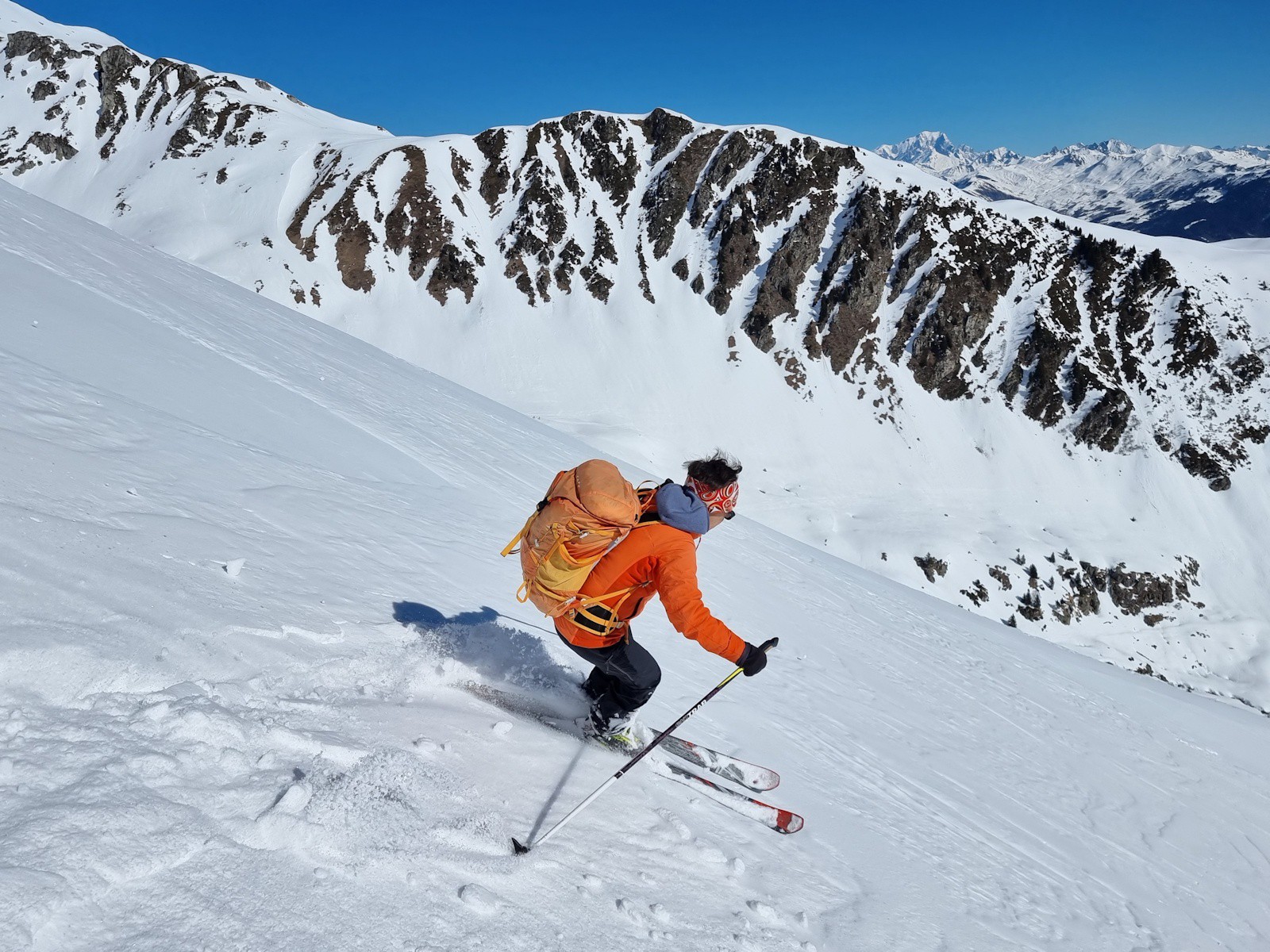 Pente NE entre 2340 m et 1700 m : neige froide meuble sans cohésion. Quelques passages en poudre tassée. Eviter les revers nord-ouest durcis par le vent et potentiellement plaqués. En partie basses, présence de quelques boules glacées cachées sous la poudre. En tout cas du bon, voire très bon ski.