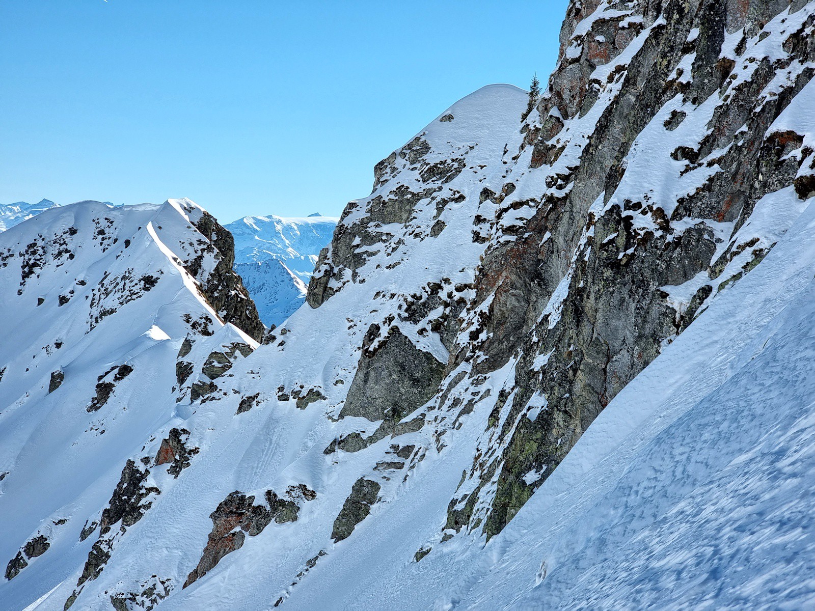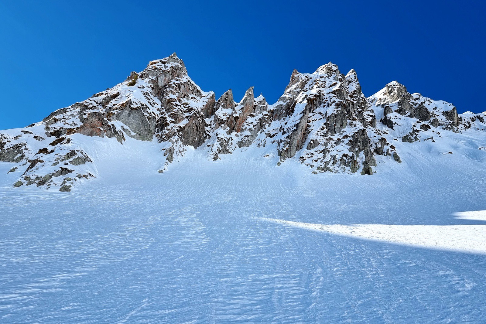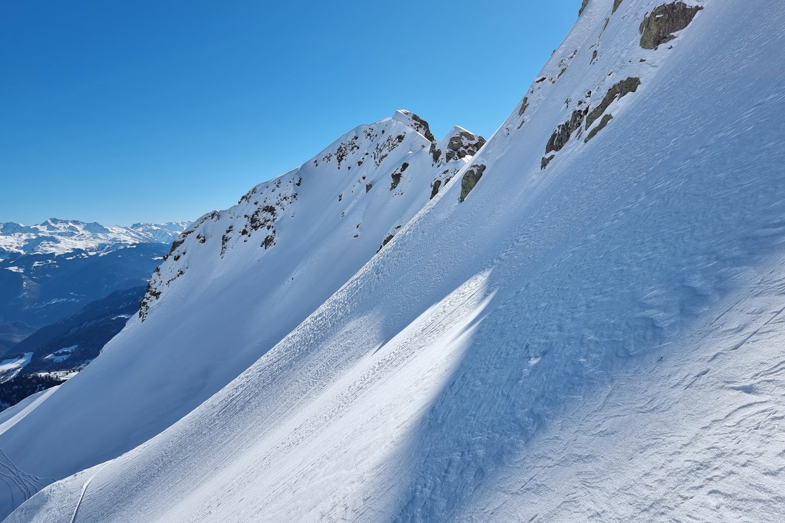Combe de Bridan sous 1700 m : beaucoup de traces. Neige froide en rive droite. Rares passages transfo en revers Est suffisamment raide. Un passage un peu dégradé par les purges sous le couloir Est de la montagne des Plans