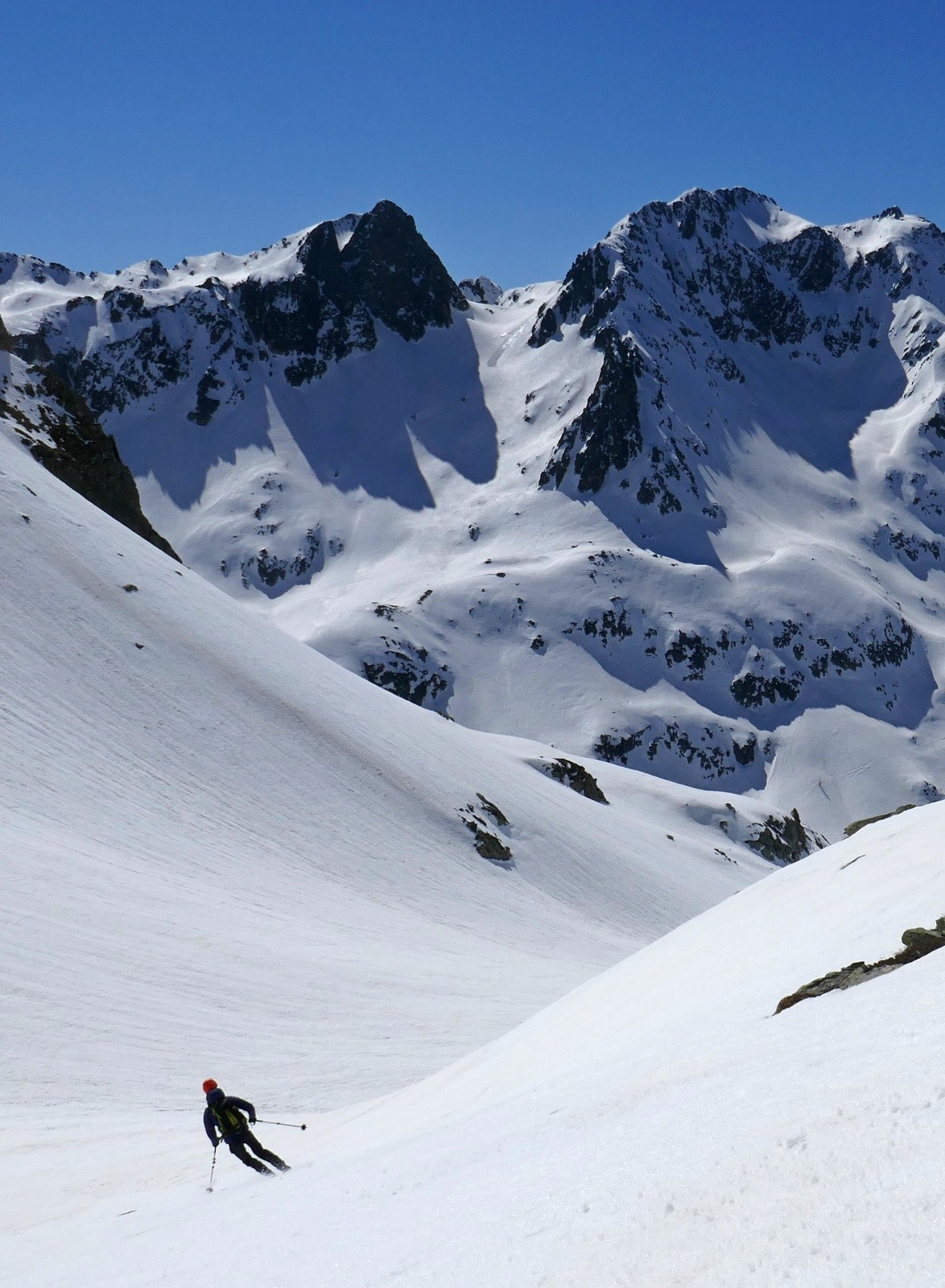 Nous n'avions jamais fait la Pointe du Dard. On est monté dans le lit du ruisseau du Grand Mont et ce n'était pas le bon plan. On aurait mieux de regarder le topo un peu plus en détail avant de partir ! Neige bien dure notamment dans le ressaut lissé, voir glacé par les passages et le manque de neige à cet endroit. On a mis les crampons pour passer le vérou, c'est dire. La suite se passe mieux mais on a trouvé l'itinéraire trop en longueur, un peu monotone. Descente versant S par le passage du Dard très agréable et en bonne neige. On a été bien aidé par les passages précédents pour l'itinéraire sur la partie car avec le bombé de la pente et l'enneigement pas exceptionnel, ce n'est pas si trivial car on ne connait pas. On aurait bien aimé descendre car le Col à l'Ouest de la pointe de la Pointe du Dard et descendre jusque tout en bas de la combe mais peu info sur le bas de l'itinéraire (pas de visuel vu de dessus).