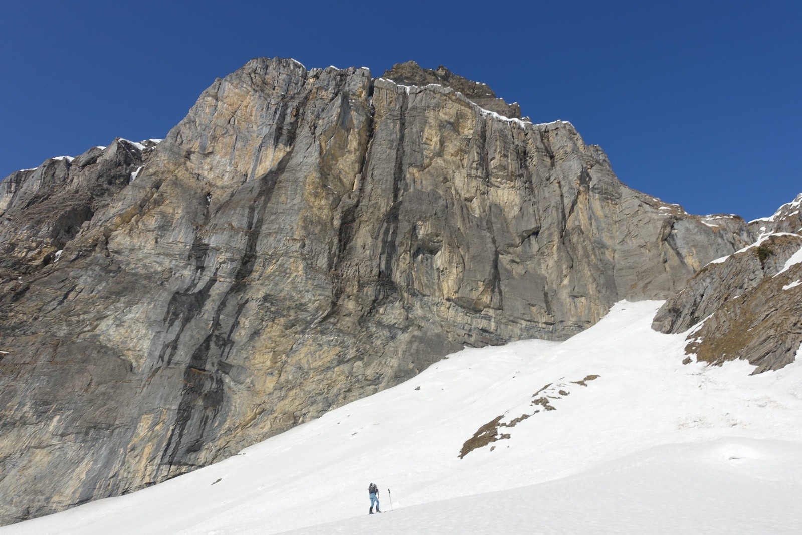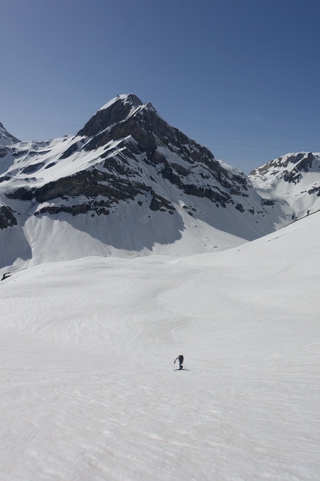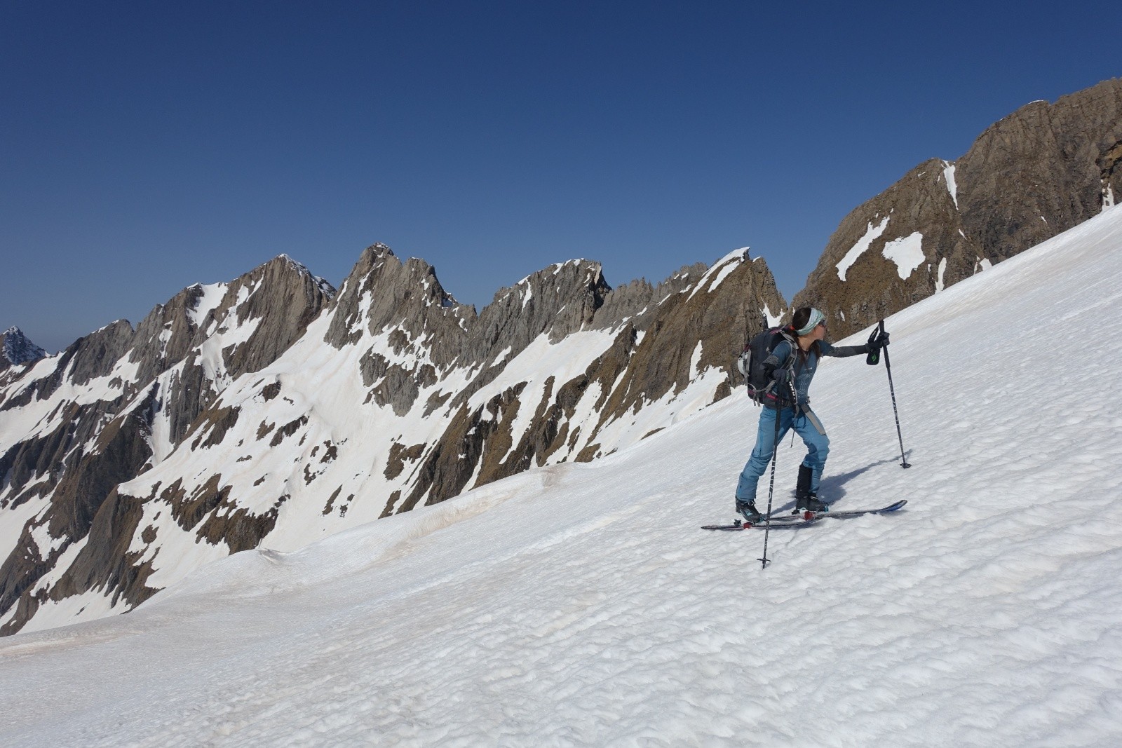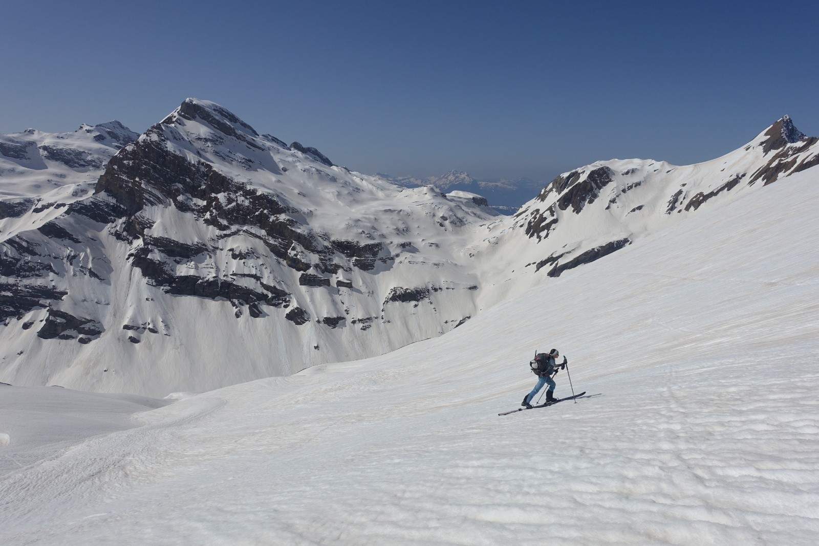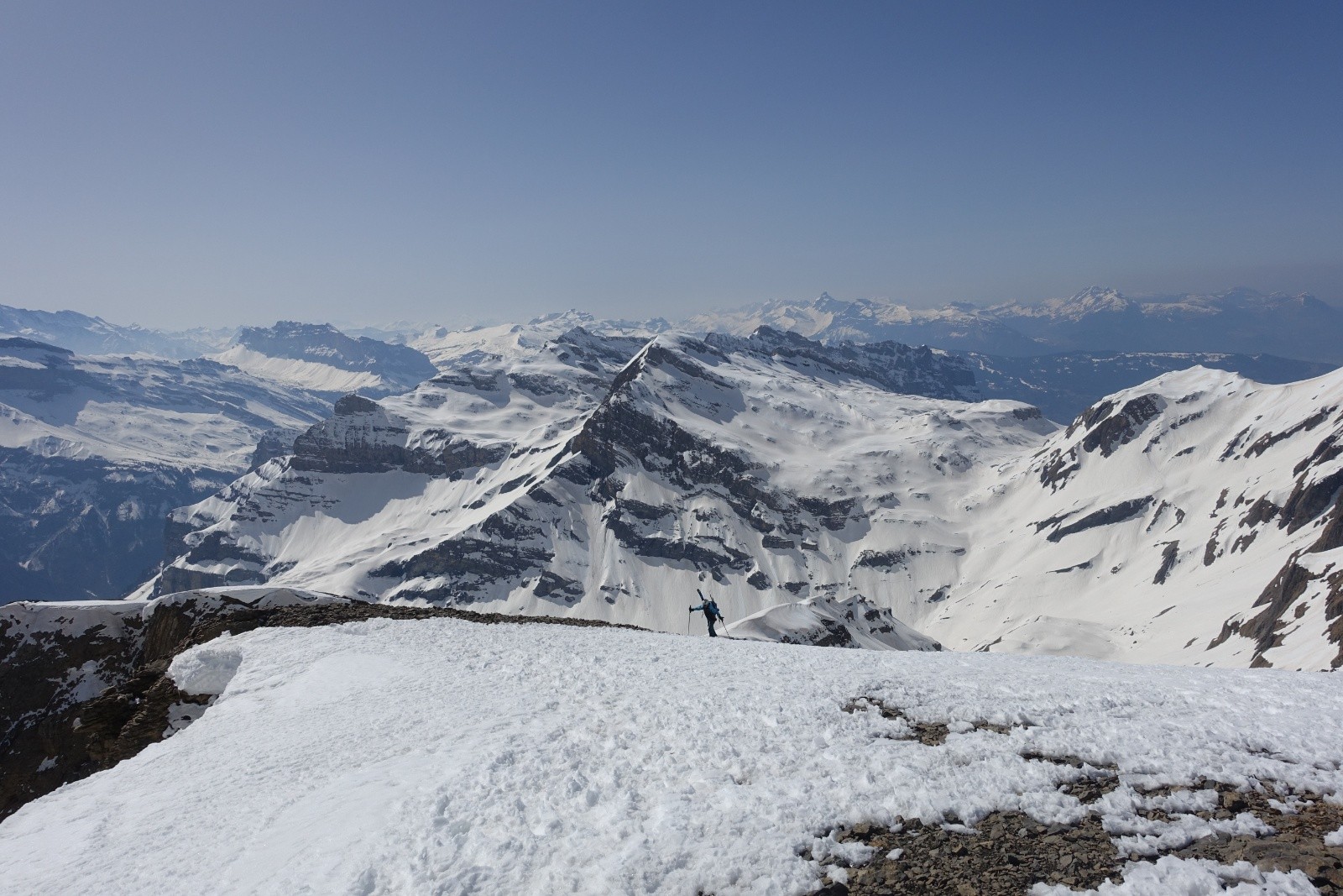 On remonte par la voie normale qui nous permet de rester en ski. Les derniers mètres se font à pied faute de neige. Là un sympathique solitaire morzinois nous rejoins, avec qui nous partagerons la pause sommitale bien méritée et la descente tout autant méritée. Il nous confirme d'ailleurs que le haut du couloir du Trou nécessite aujourd'hui quelque désescalade.