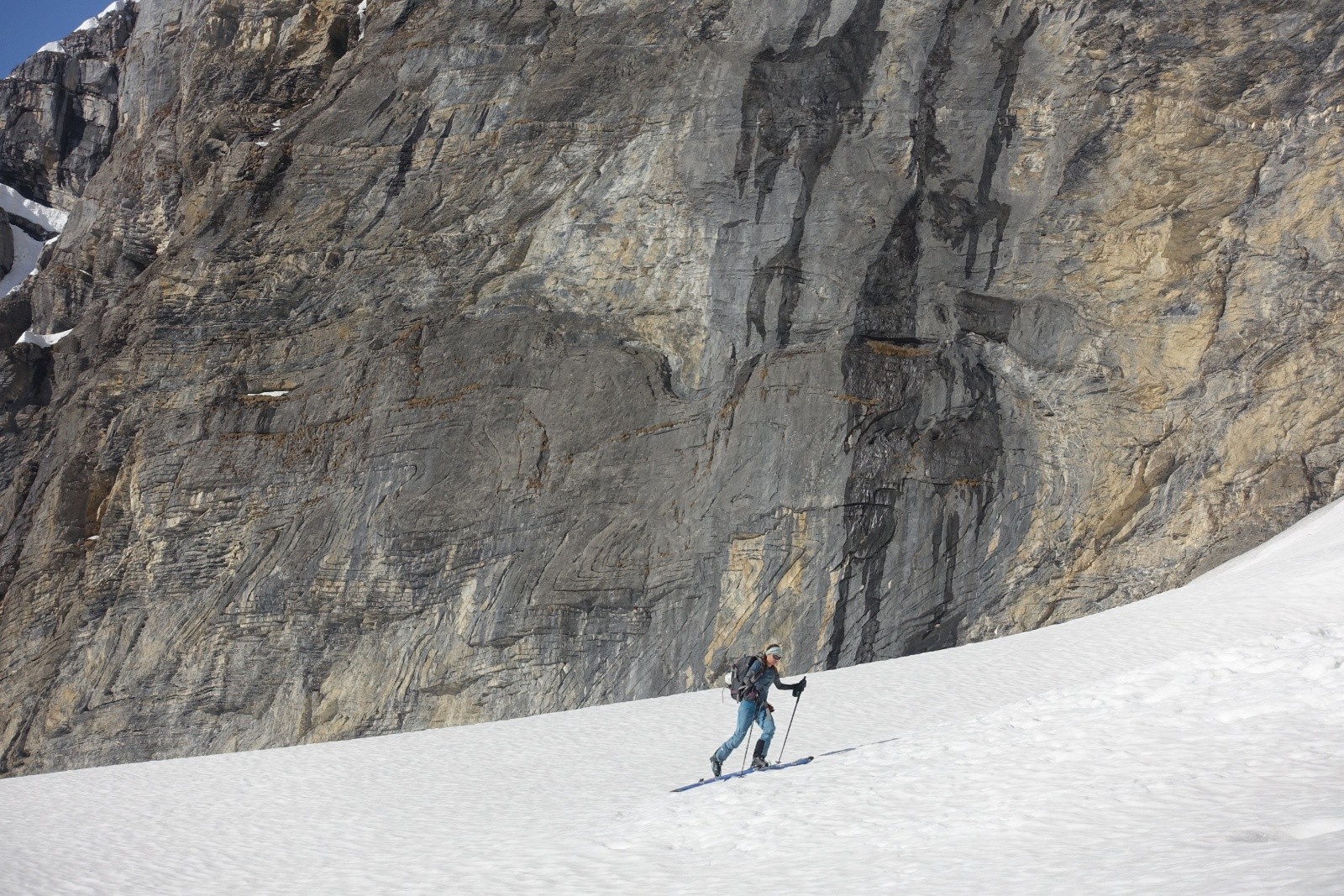 Emeric et son oeil de lynx nous trouve la sortie du couloir, plus étroite que ce qu'il semblait d'en bas. Depuis l'entrée de la face il faut bien tirer à droite en descendant pour sortir des barres. A 14h le décaillage est parfait. Outre quelque concentration pour passer l'étroiture la face est vite dévalée.