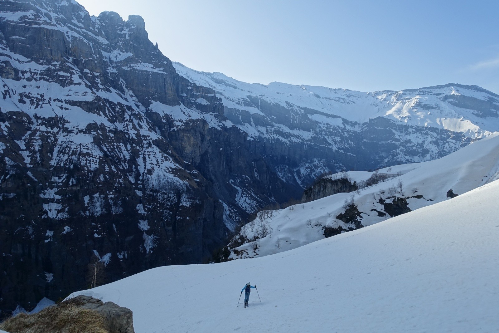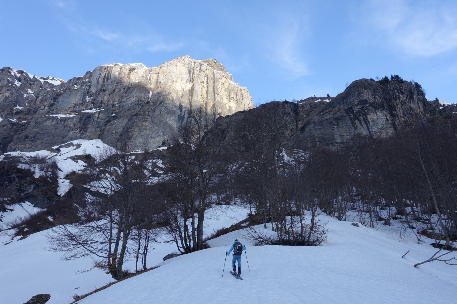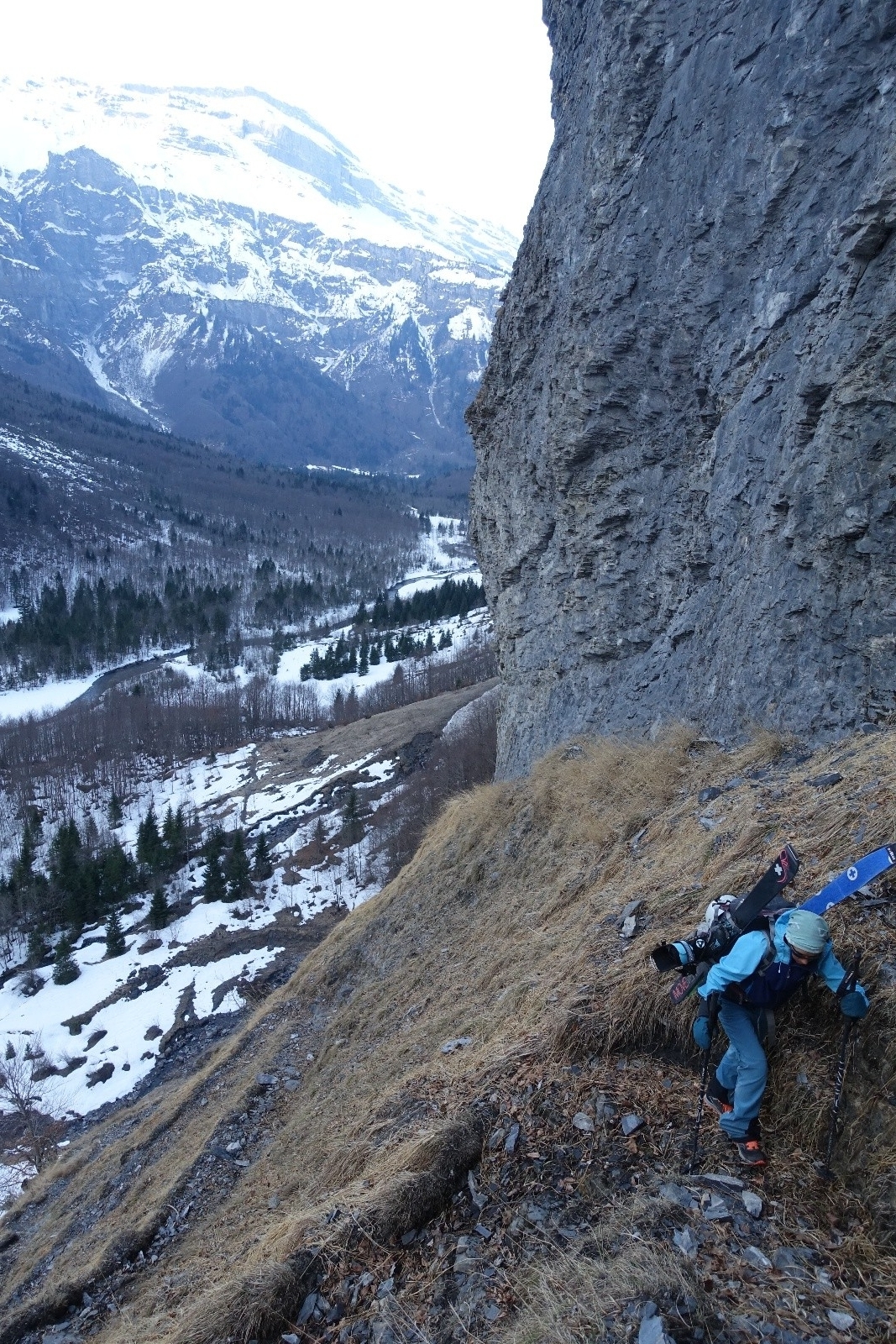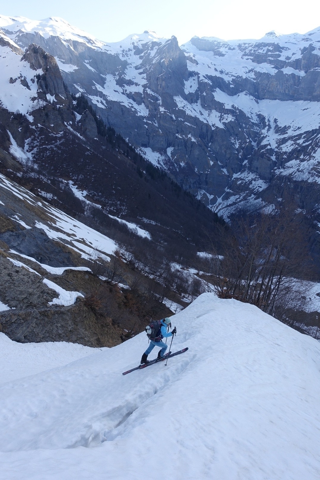 Un récent compte-rendu au couloir du Trou nous avait donnée l'envie d'aller explorer les Dents Blanches, et en particulier ce couloir. Stationnés pour quelques jour à Sixt-Fer-à-Cheval on part donc explorer ce chainon montagneux acéré. La veille, nous choisissons à l'issue d'un long conciliabule de partir du Cirque de Sixt-Fer-à-Cheval plutôt que des Allamands qui nous semble interminable. On sait qu'il y aura du portage, on s'arme de nos baskets. Après un cuisant échec de boulangerie fermée, on "remonte" à pied les pistes de ski nordique qu'on quitte enfin pour le Pas du Boret. Changement d'ambiance, ça grimpe sec et ça chauffe le long de la paroi contrairement au fond du vallon bien froid. On reste impressionné par la verticalité du cirque, c'est majestueux! La montée au Pas du Borêt est dépourvue de neige et glace, c'est confort. Et arrivé à sa sortie on a le plaisir de trouver la neige et de pouvoir chausser dès 1300m, en dessous des chalets.