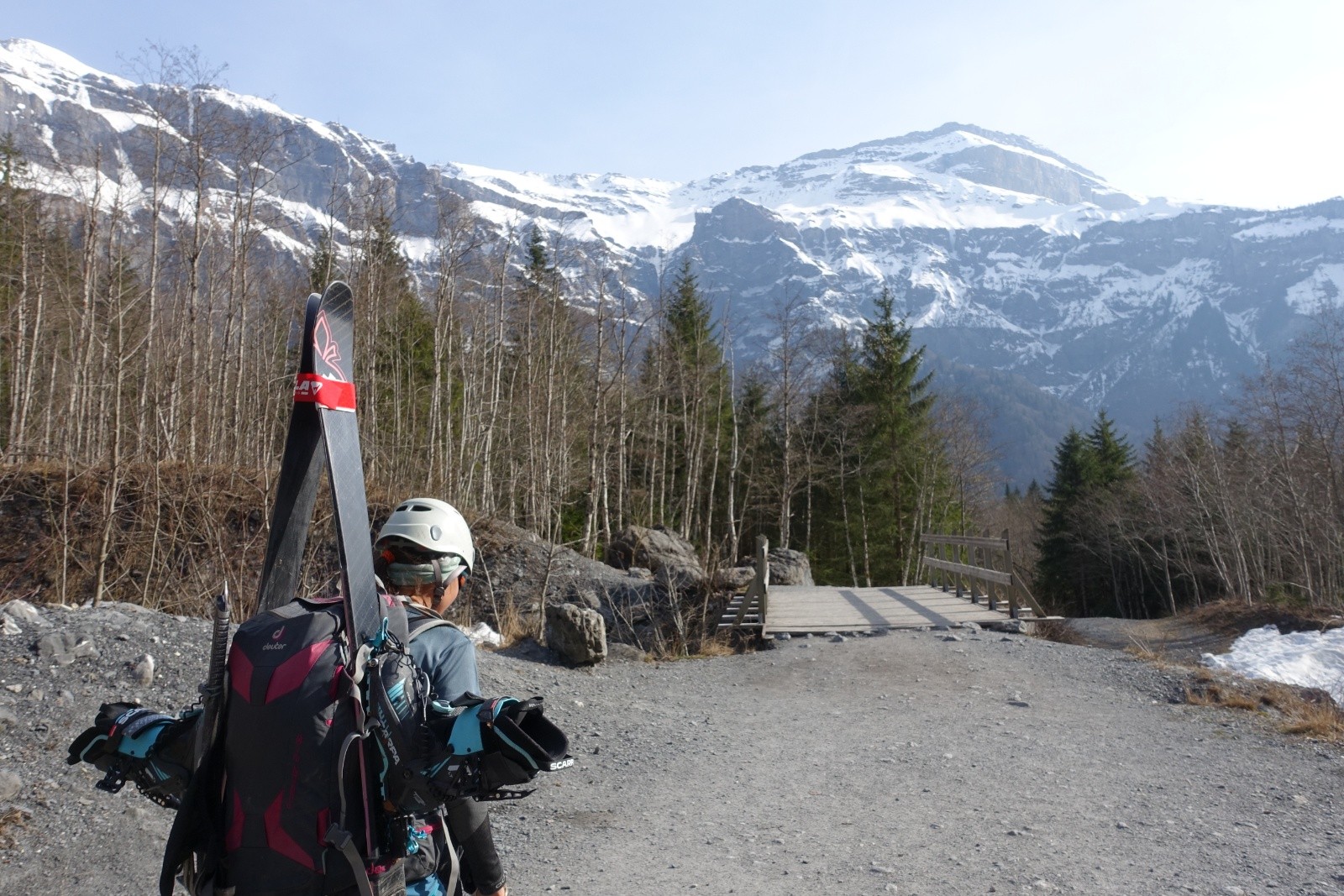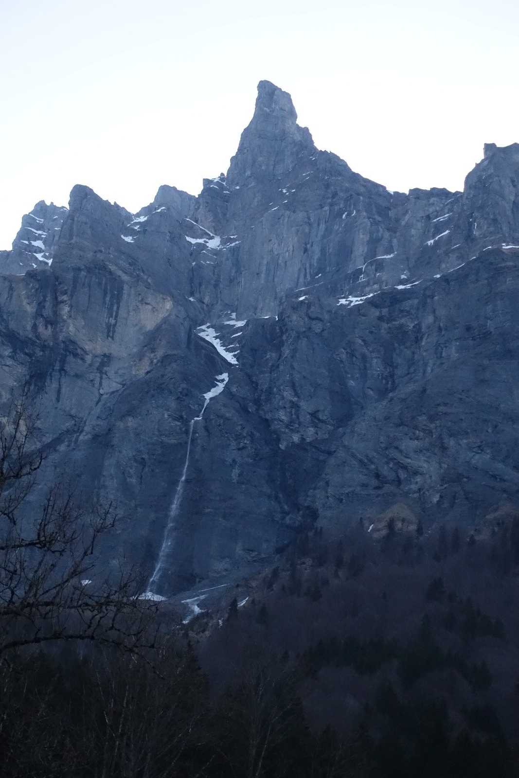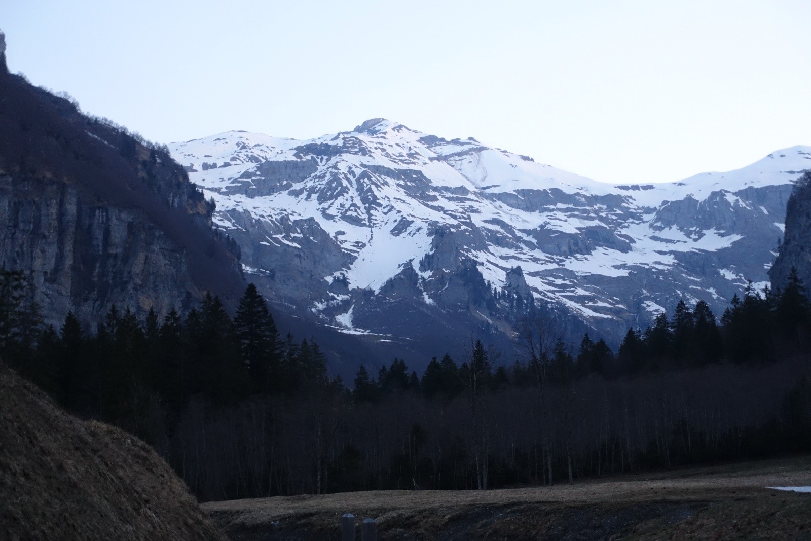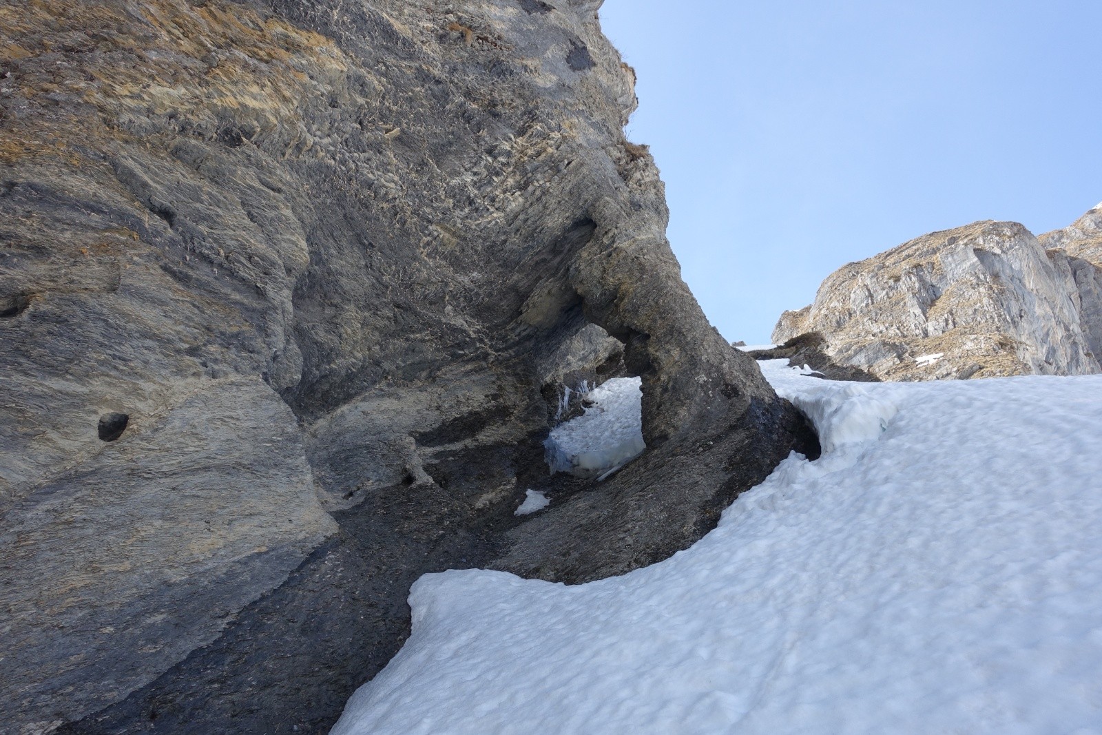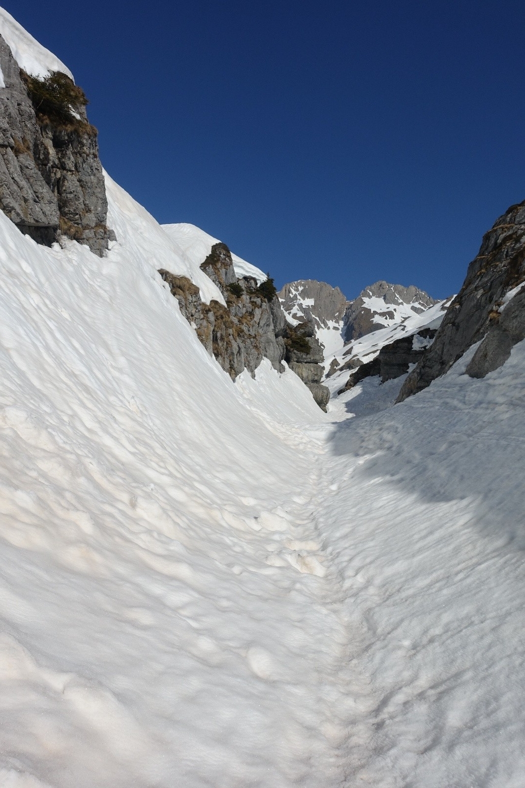 Un récent compte-rendu au couloir du Trou nous avait donnée l'envie d'aller explorer les Dents Blanches, et en particulier ce couloir. Stationnés pour quelques jour à Sixt-Fer-à-Cheval on part donc explorer ce chainon montagneux acéré. La veille, nous choisissons à l'issue d'un long conciliabule de partir du Cirque de Sixt-Fer-à-Cheval plutôt que des Allamands qui nous semble interminable. On sait qu'il y aura du portage, on s'arme de nos baskets. Après un cuisant échec de boulangerie fermée, on "remonte" à pied les pistes de ski nordique qu'on quitte enfin pour le Pas du Boret. Changement d'ambiance, ça grimpe sec et ça chauffe le long de la paroi contrairement au fond du vallon bien froid. On reste impressionné par la verticalité du cirque, c'est majestueux! La montée au Pas du Borêt est dépourvue de neige et glace, c'est confort. Et arrivé à sa sortie on a le plaisir de trouver la neige et de pouvoir chausser dès 1300m, en dessous des chalets.