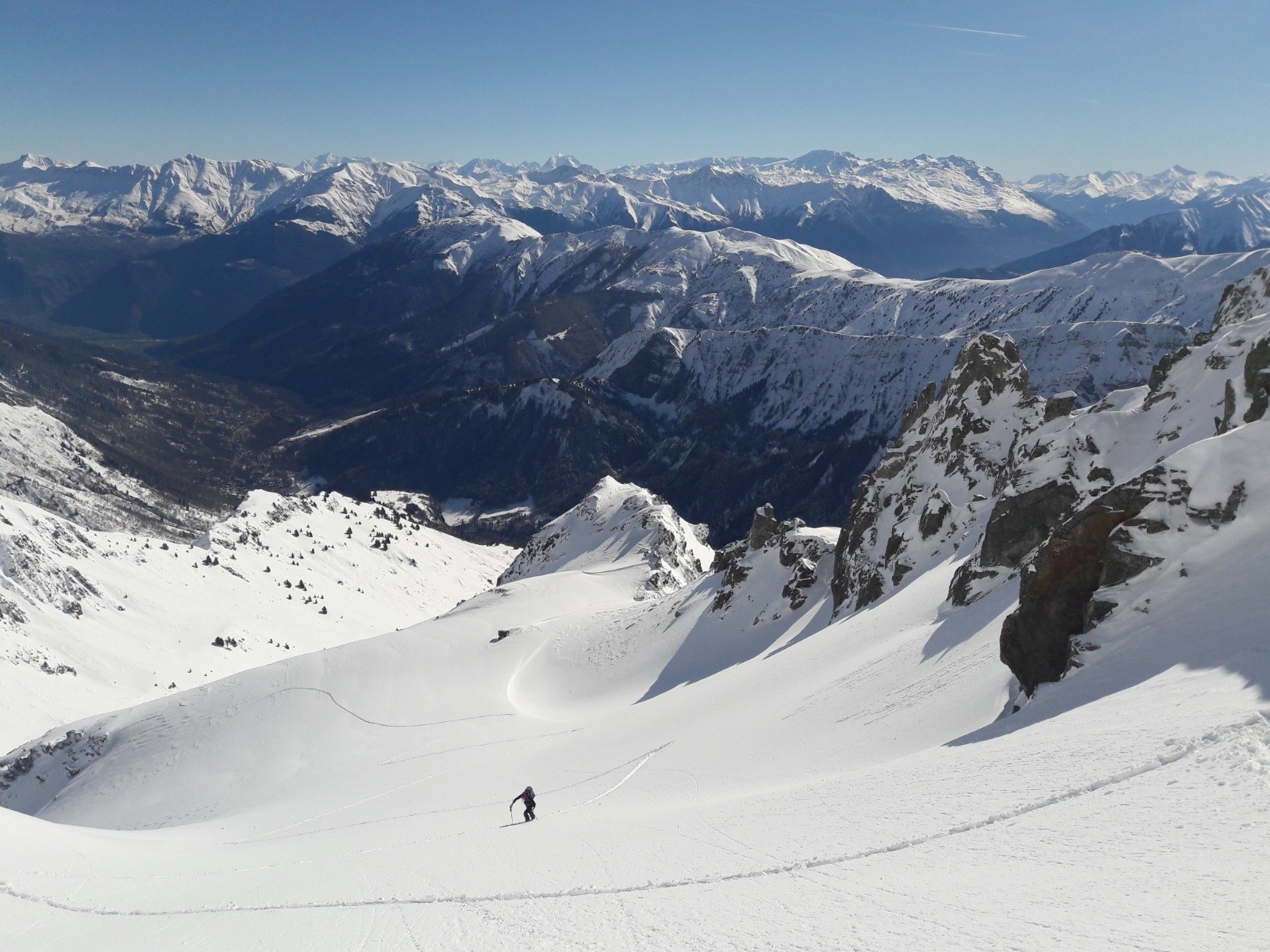 Est-ce qu'on bascule en face nord ? Non, trop sec, chutes de neige trop récentes et pas assez stabilisé, on redescend par le même itinéraire et on ira peut-être voir un des couloirs nord de la montagne du sambuis.
