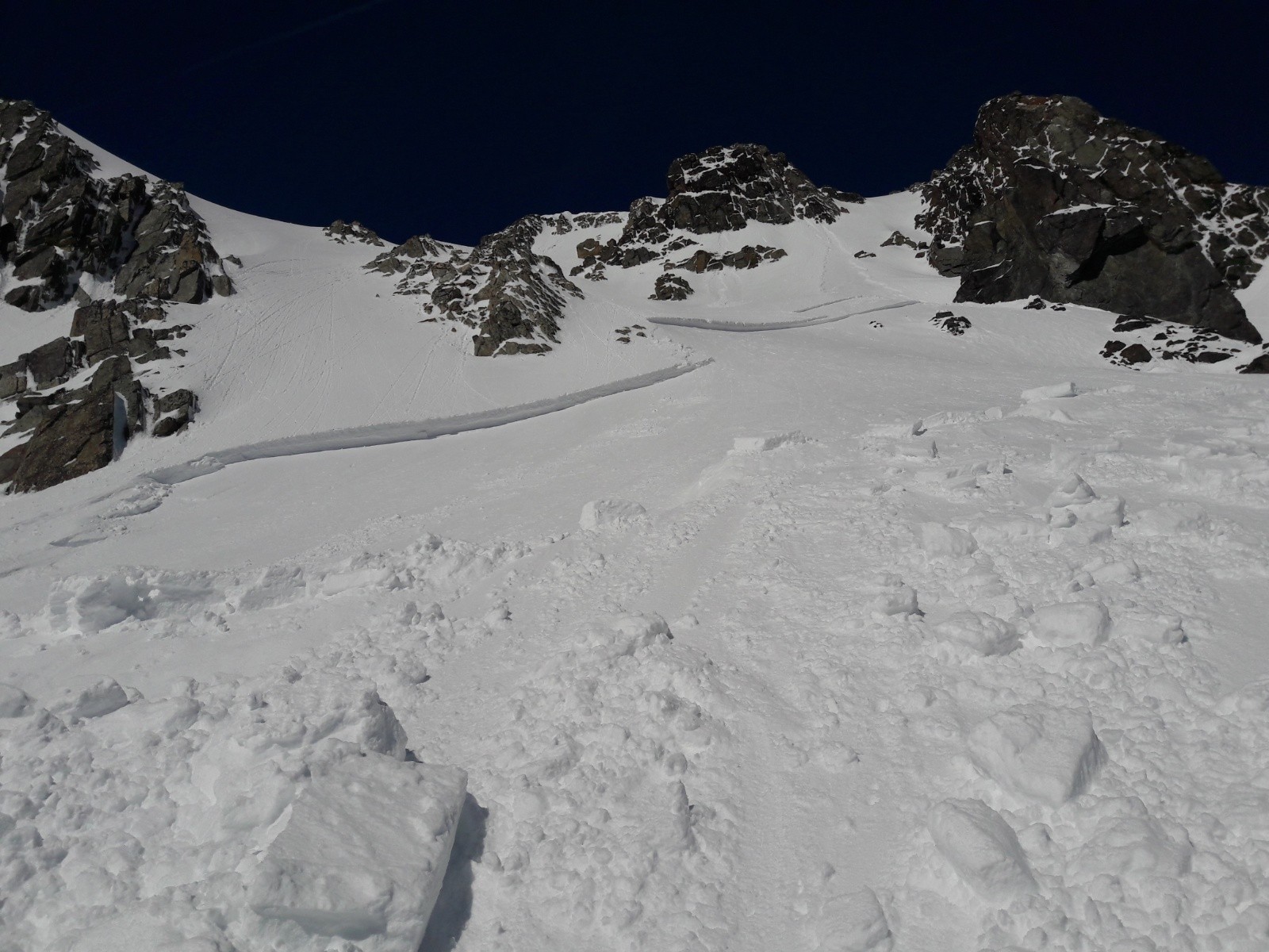 Arrivés en bordure de la-dite combe, on découvre qu'elle est intégralement partie, des cassures zébrant la face à 50m au-dessus de notre trace de montée. Au fur et à mesure de notre descente, nous sommes saisis d'effroi de découvrir que la quasi intégralité de notre trace de montée a été recouverte sur 400m.