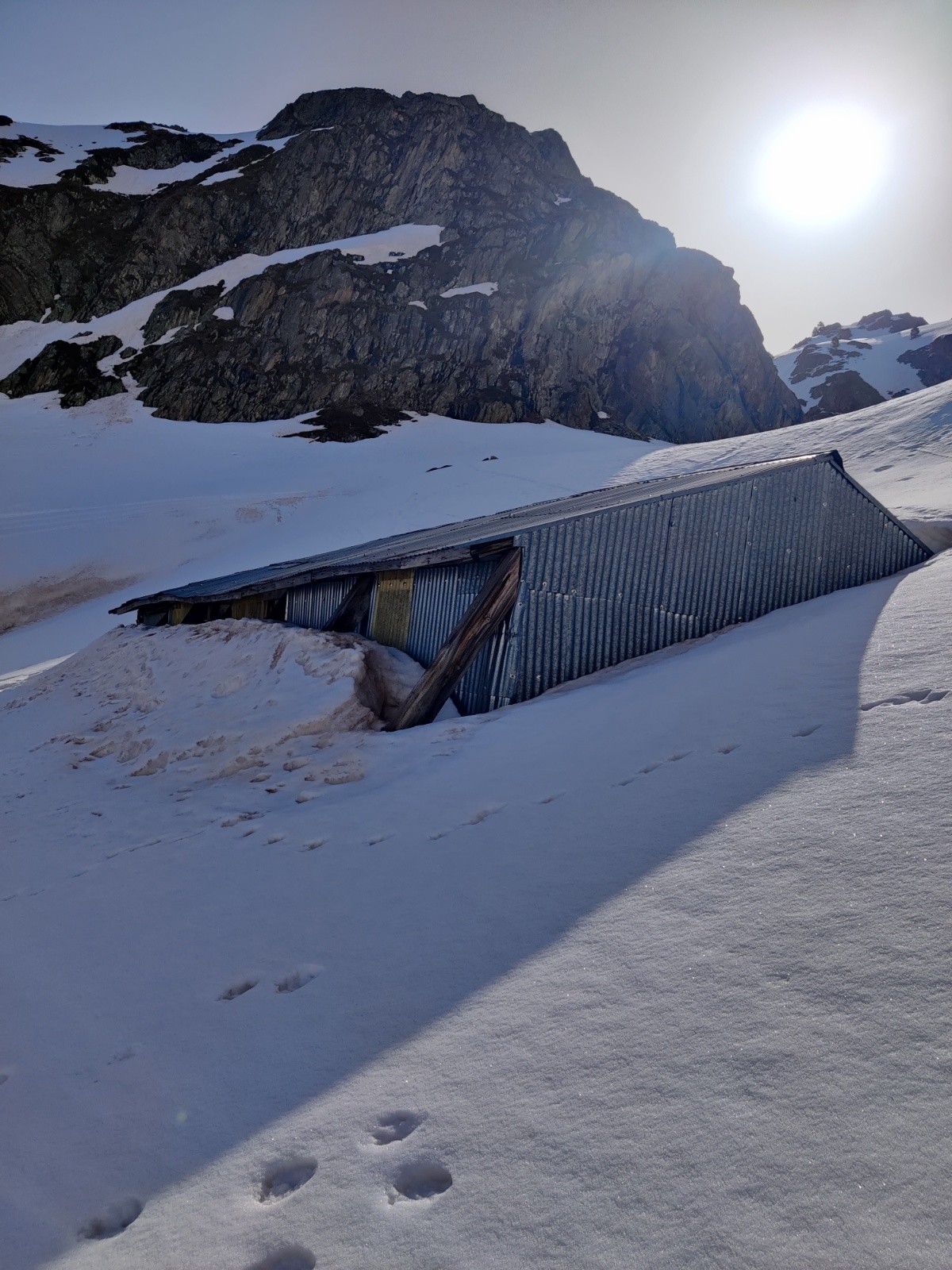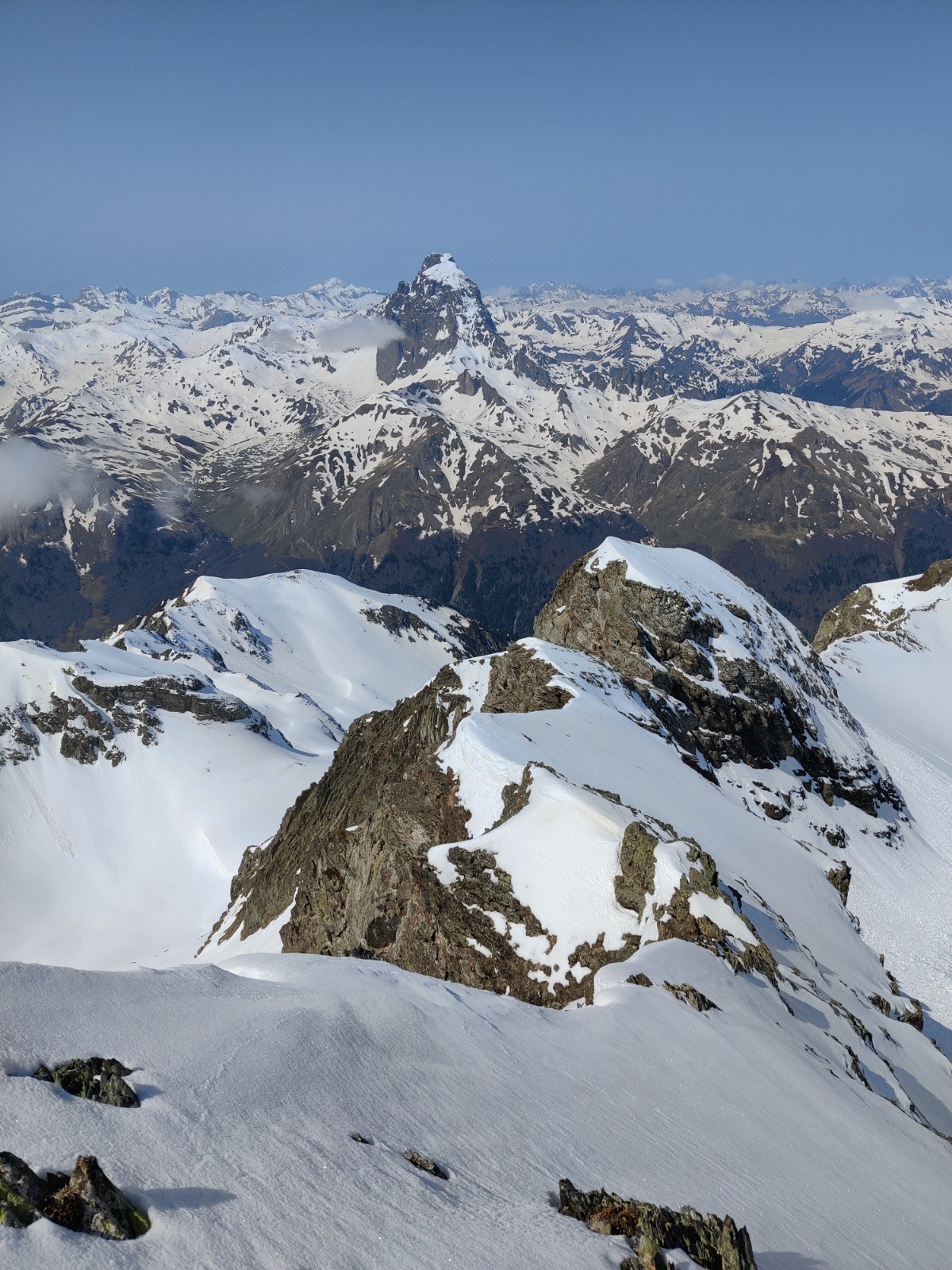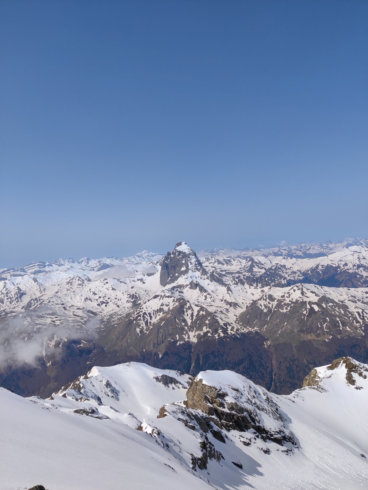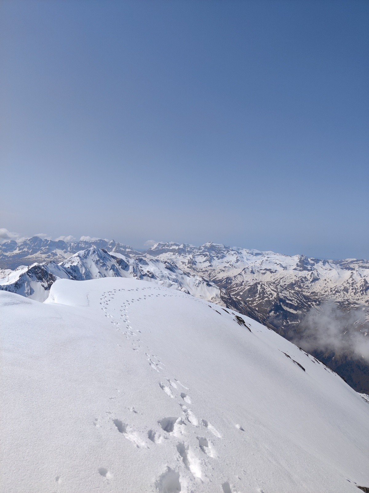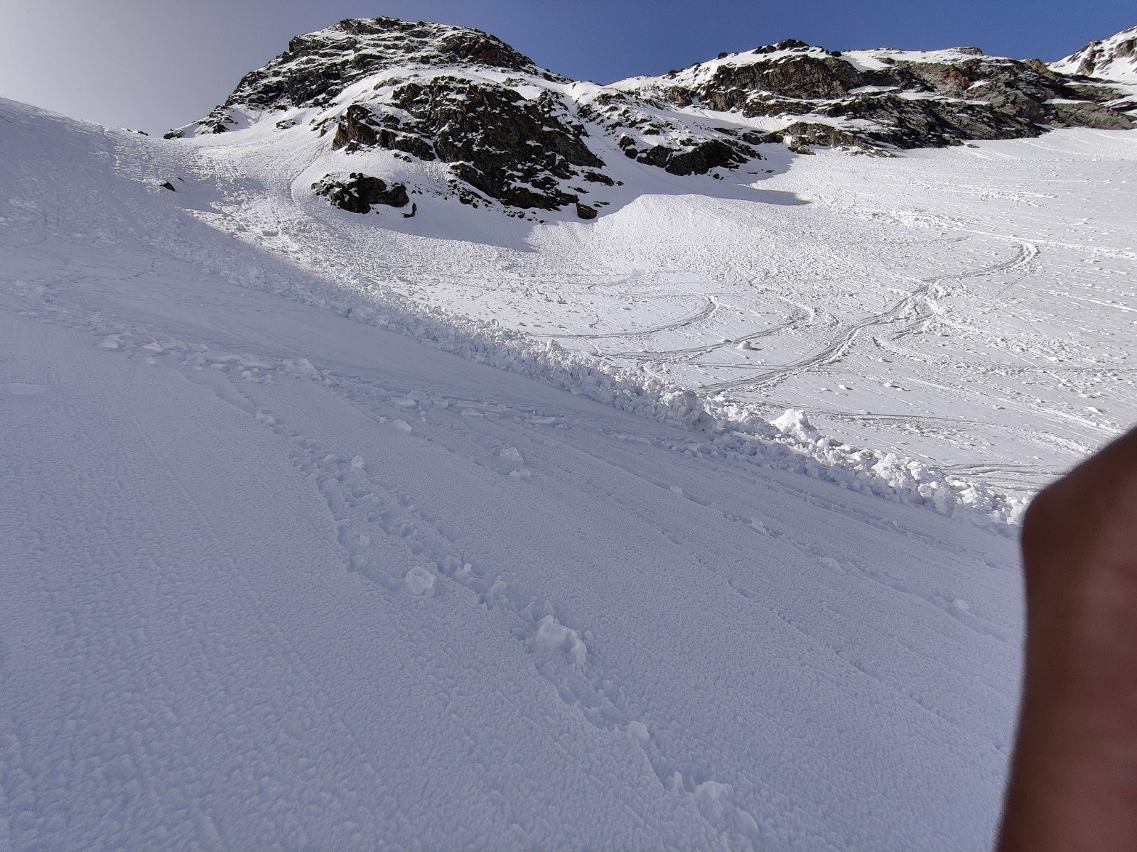 Descente 10m a l'ouest du sommet par une pente a 40° sur très bonne neige, puis 100m sur une mixte d'avalanche et des boules des corniches qui ont cédés la veille.