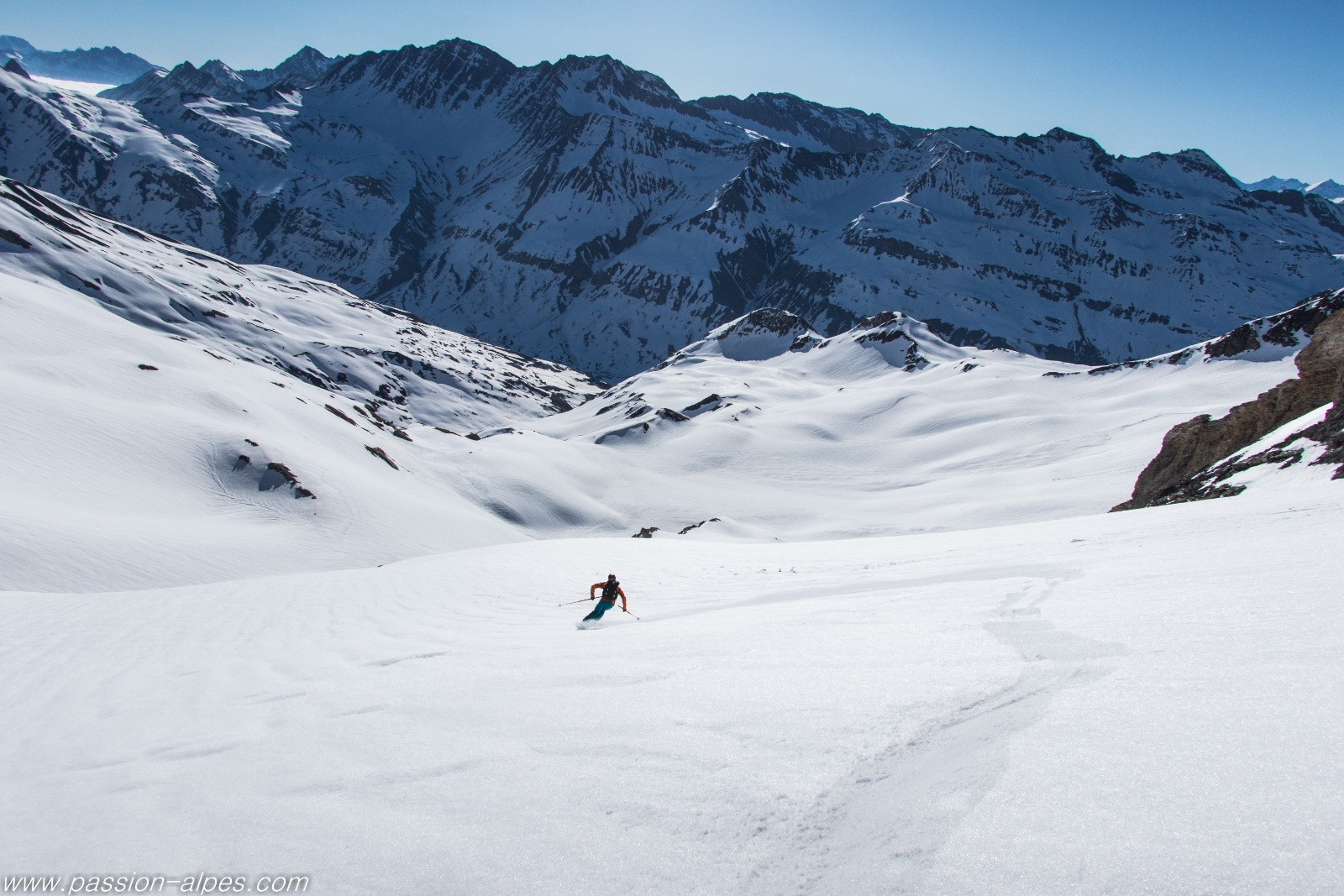 Notre dernière descente se fait par le rocher puis le col du bonhomme, sur une neige encore bien portante et très douce, on se régale à skier ! Quelle belle surprise que la qualité de ski sur l'ensemble de cette journée, alors que le regel ne s'est fait que sur une croûte de 10cm... Nous avons su bien gérer le timing et les orientations de descente