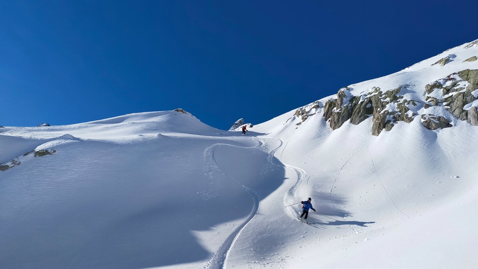 A la descente les traces étaient regroupées à proximité de la trace de montée rive droite, on a pris plein axe et on a eu le vallon pour nous avec une excellente neige quasiment jusqu'au replat où l'on repeaute pour récupérer le versant de la station.
