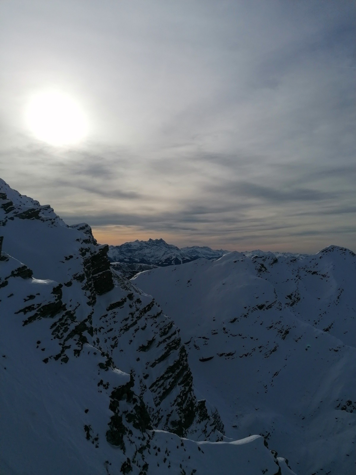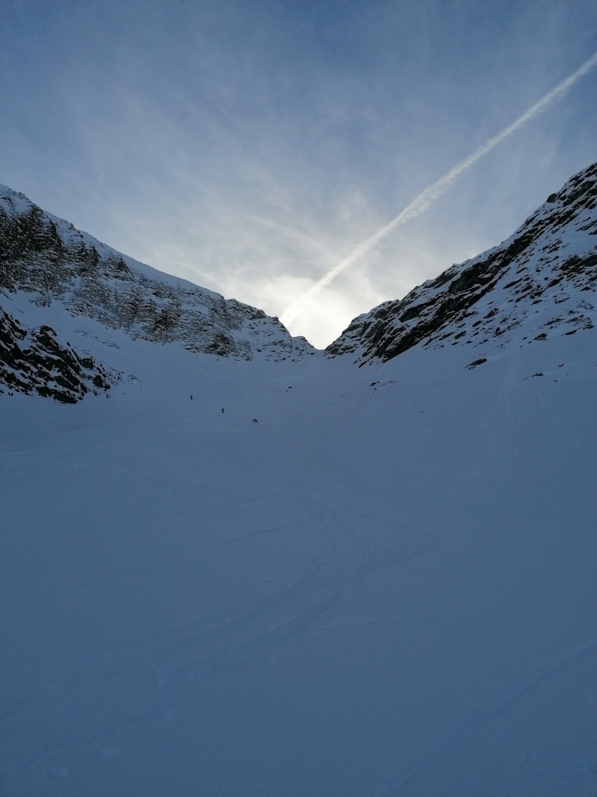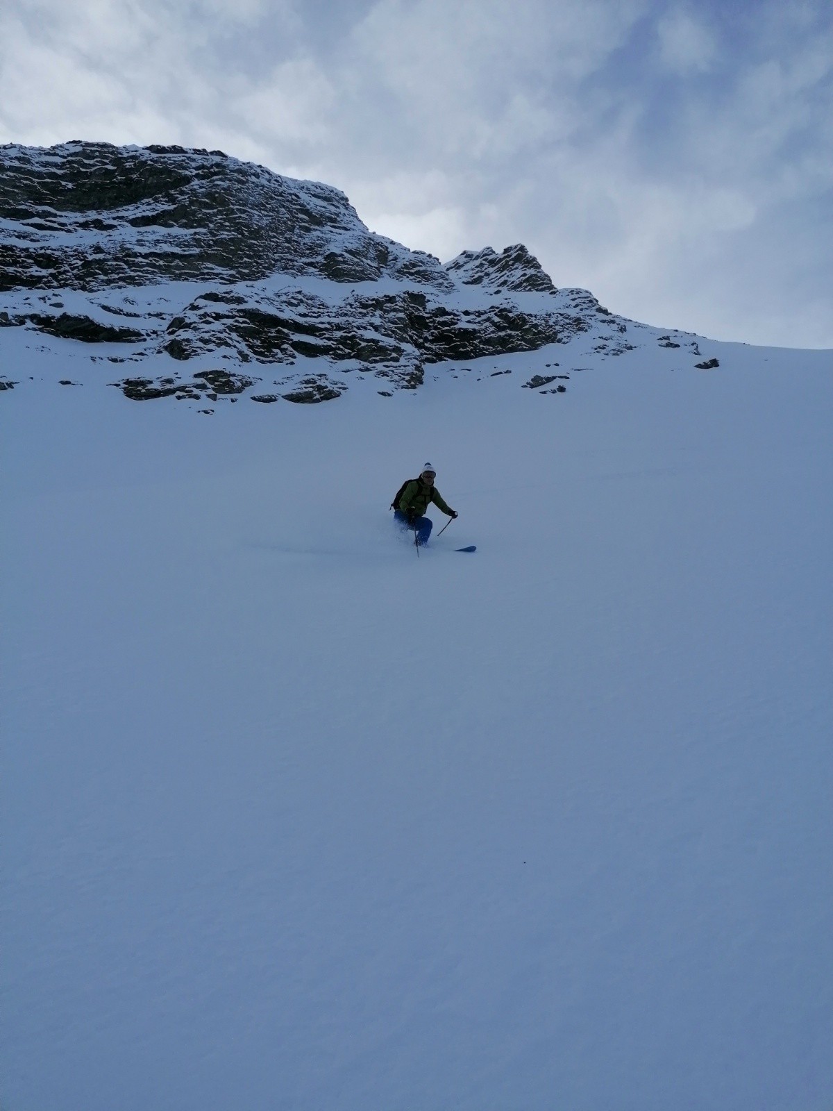 Conditions pour le ski : neige assez lourde ou croûtée mais en allant chercher la bonne orientation, il y a moyen de se faire plaisir, même si c'est bien physique à skier.