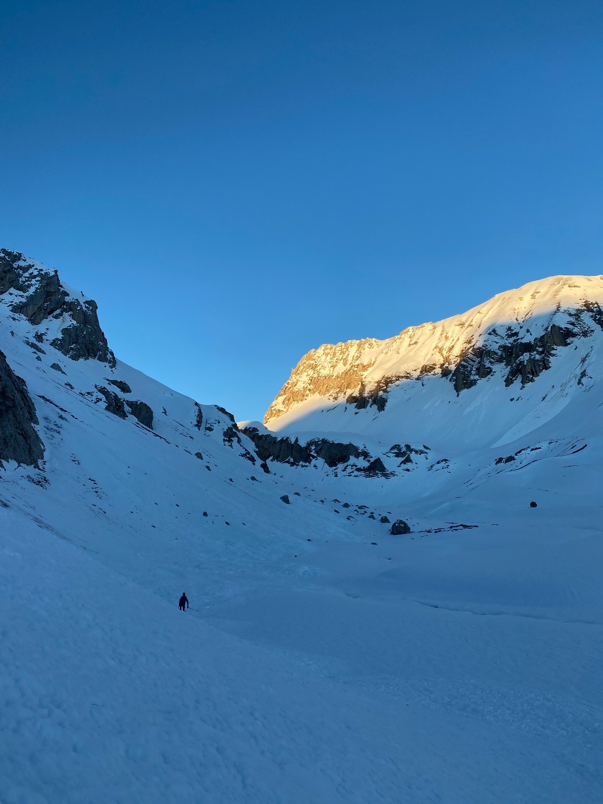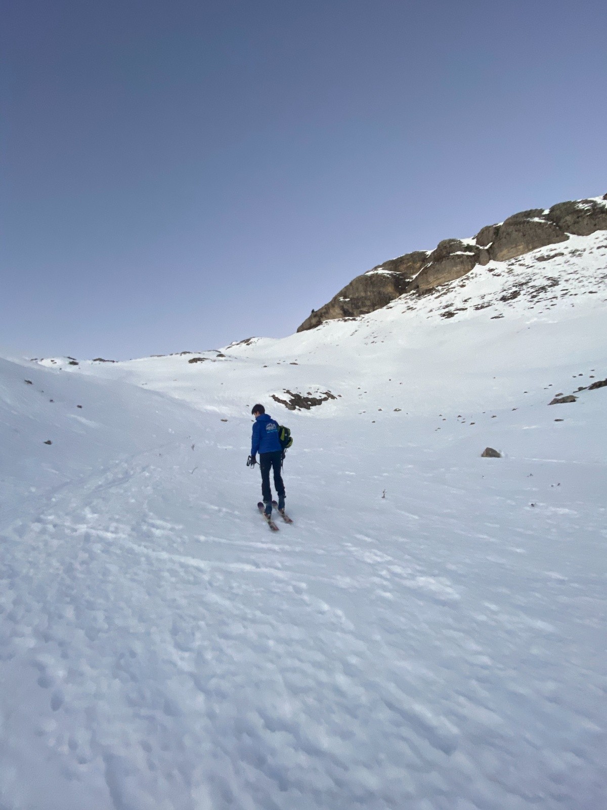 Parti assez tot du col du festre, on retrouve une neige béton sur toute l'approche du vallon des aiguilles (dieu merci le regel...). Au pied de la tête de vachères, on se rend compte que le seul couloir en neige sera la pente centrale du sommet E. on arrive au pied de celui-ci 30 min après qu'il ait pris le soleil et il fait déja giga chaud. 1h de gros brassage assez désagréable plus tard, on est au sommet. La descente a pas l'air trop mauvaise. Raphael attaque les premiers virages et c'est excellent; neige et ambiance de rêve... J'ai finalement que très peu de souvenirs de la descente par cause de joie excessive et bonheur intense. (petit ressaut en cailloux dans le bas donc mini passage de dry ski).