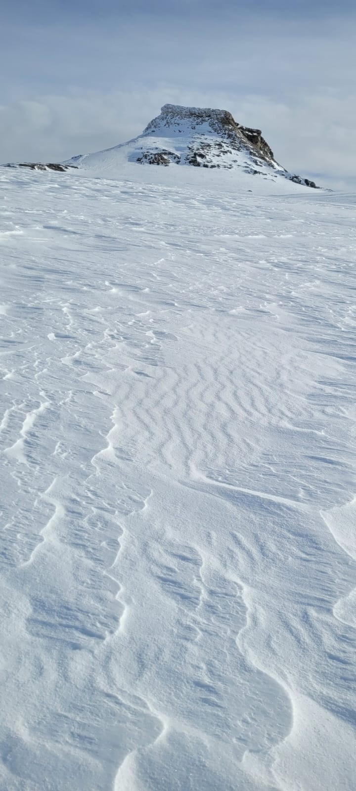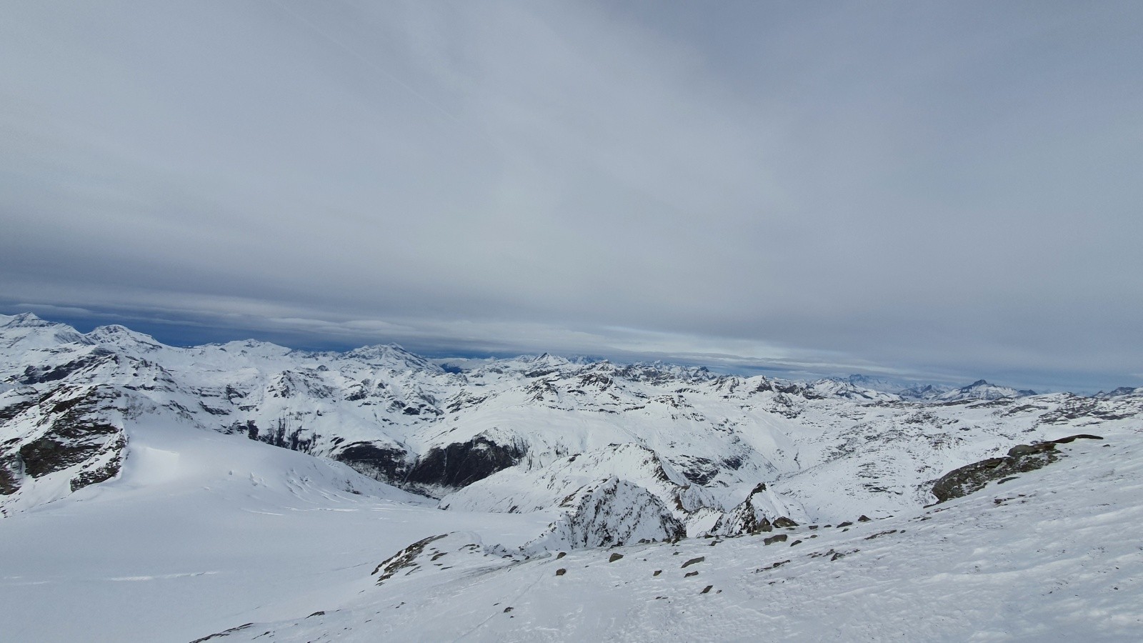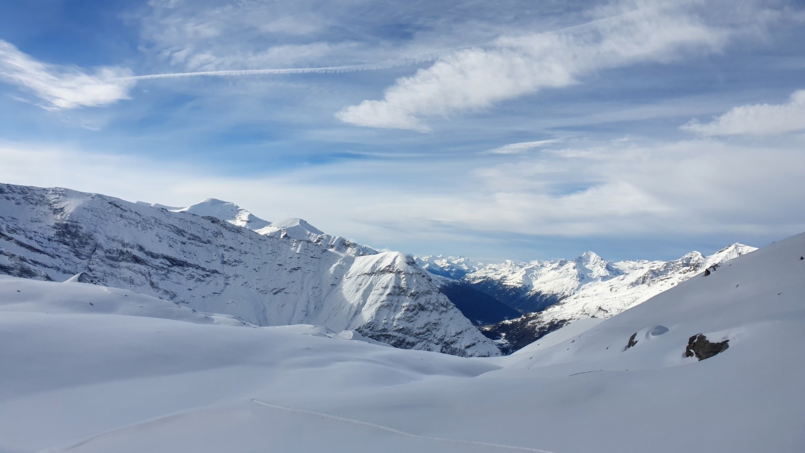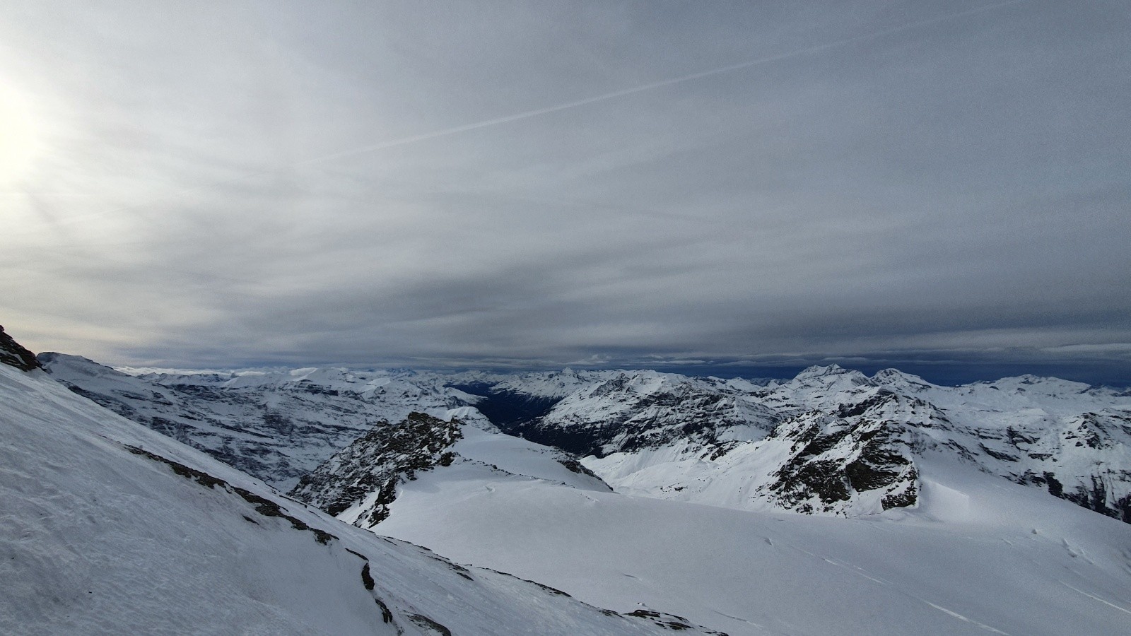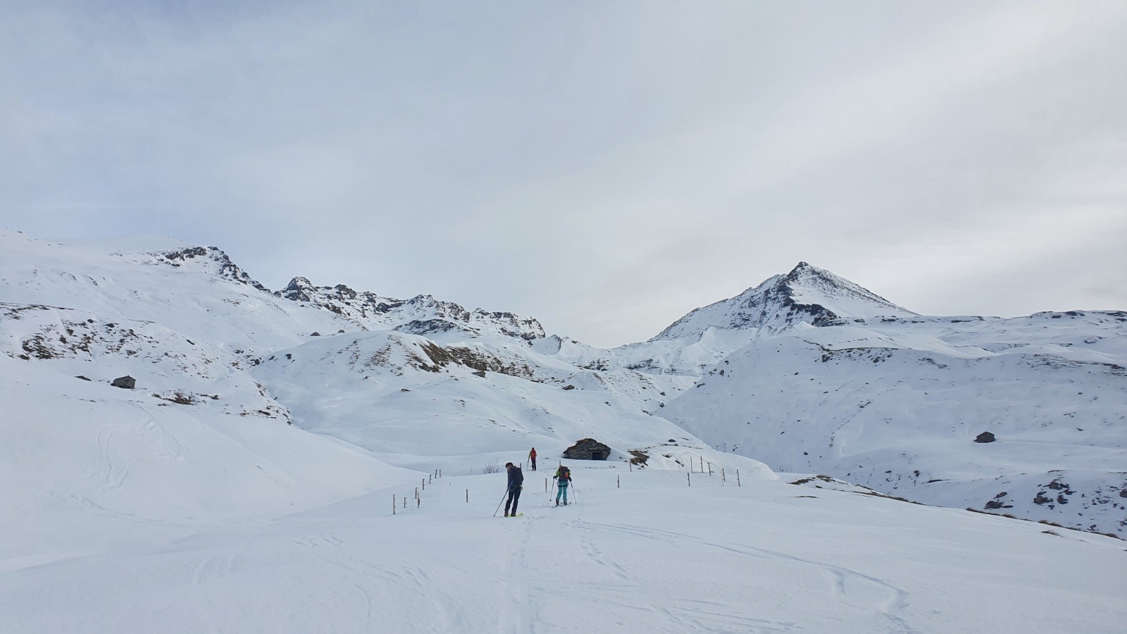 Conditions pour le ski : Neige soufflée mais skiable sur la rampe du glacier puis bonne poudreuse un peu tassée jusqu'à 2600m, et neige croutée ou glacée jusqu'au retour sur les pistes de ski de fond.
