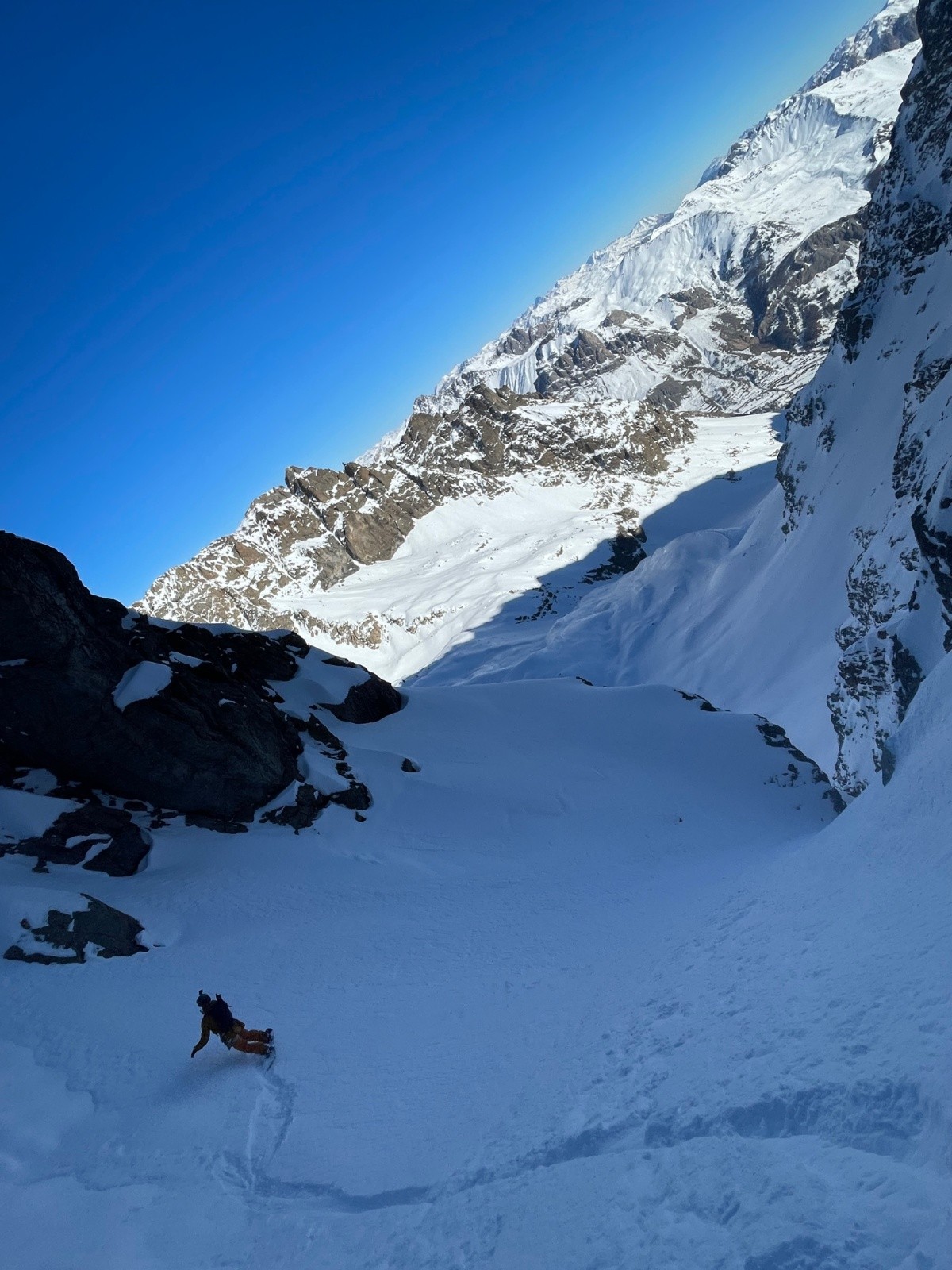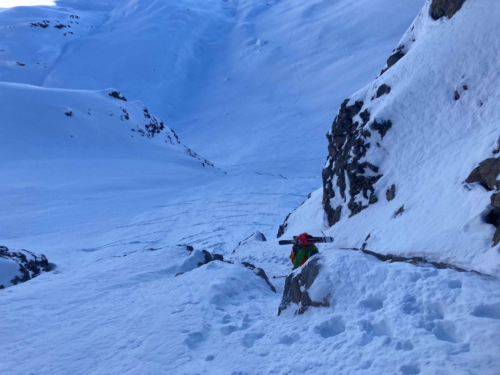 Avec un rappel de 30 mètres vous passez le rappel mais vous avez le droit de sauter une dalle de plus de deux mètres et vous cratériser dans une pente à 50° remplis de poudre (déconseillé quand il n’y a pas de poudre)