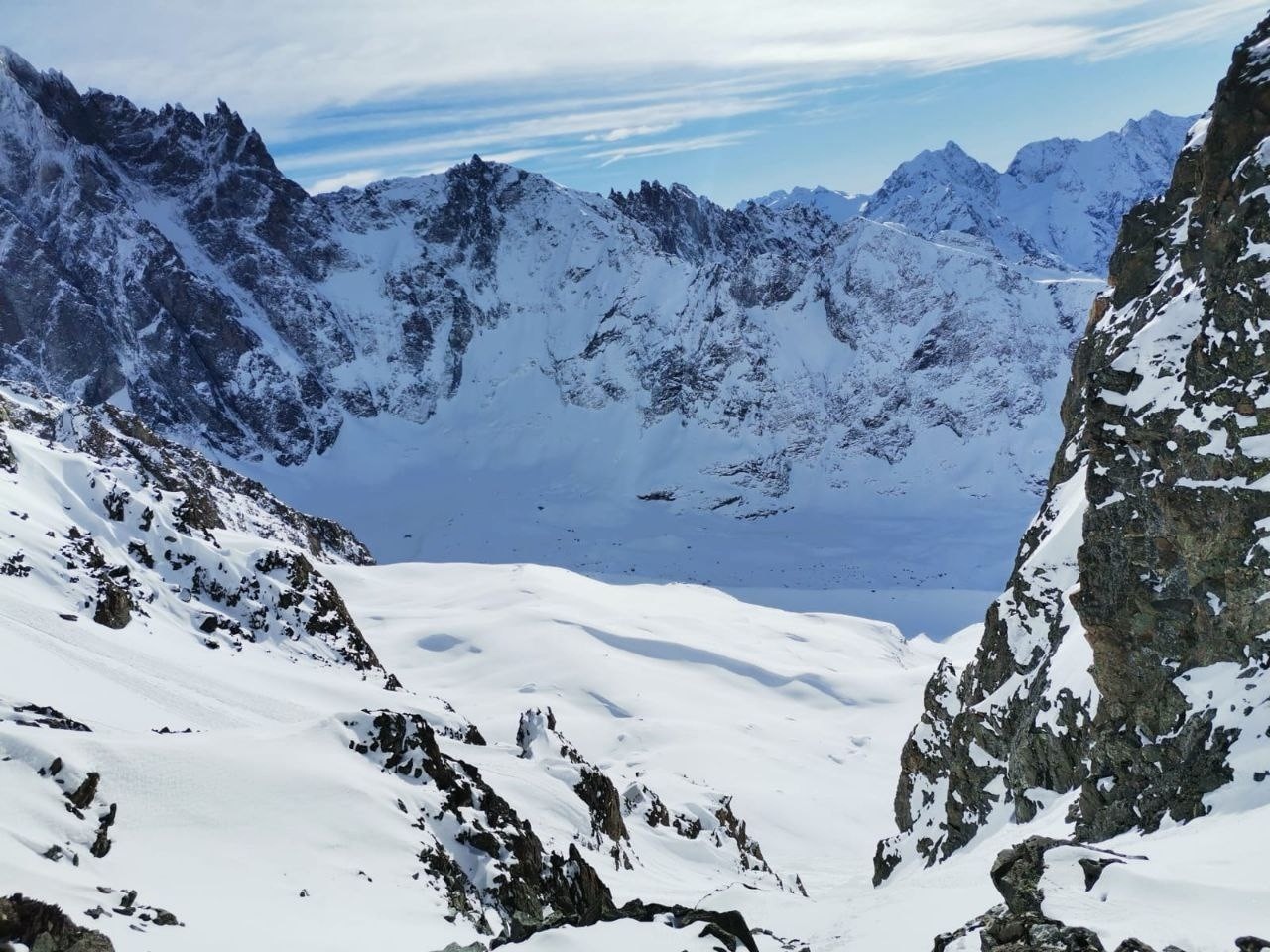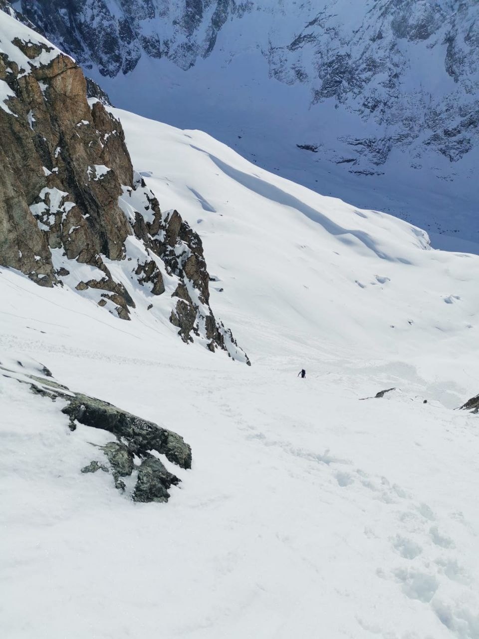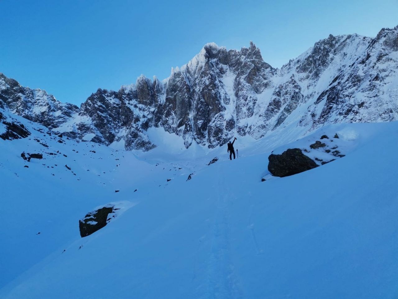 De plus en plus de neige fraiche sous le pied, on remonte progressivement le long du vallon avant de remonter les jolies pentes qiu nous ameneront au pied du couloir.