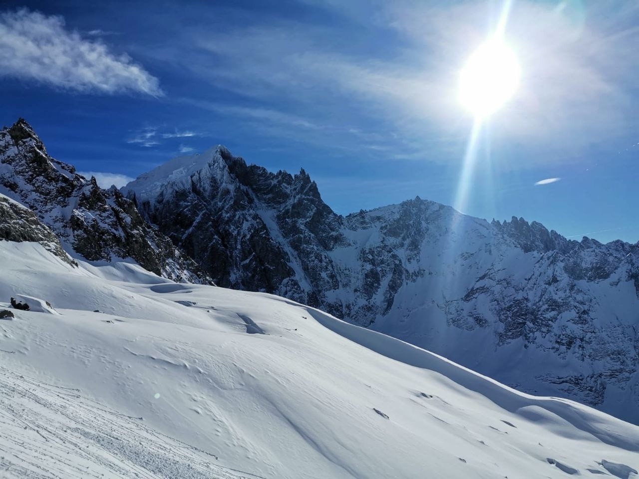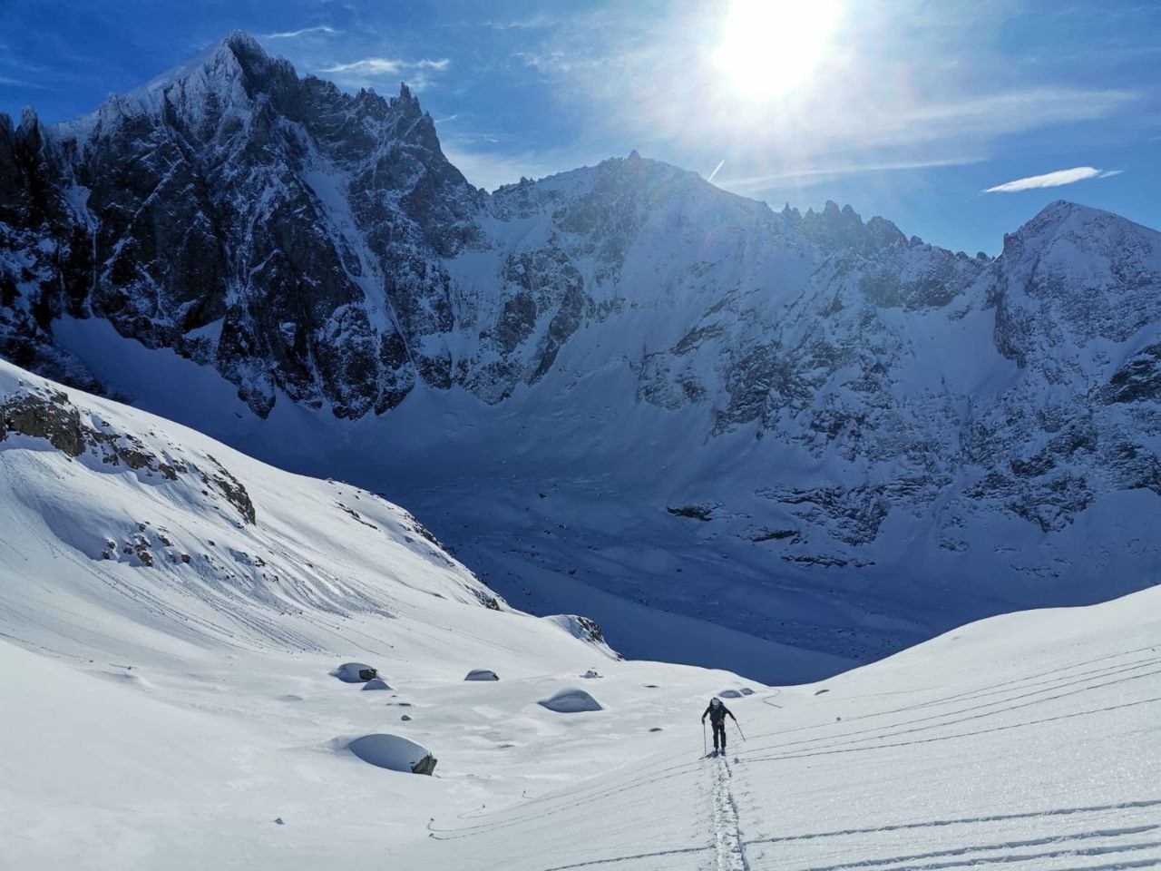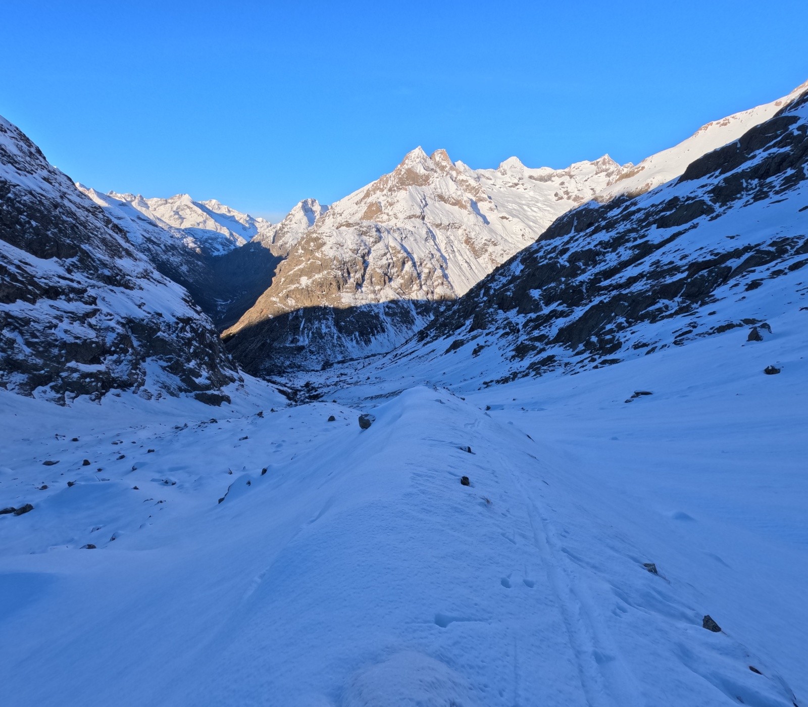 De plus en plus de neige fraiche sous le pied, on remonte progressivement le long du vallon avant de remonter les jolies pentes qiu nous ameneront au pied du couloir.