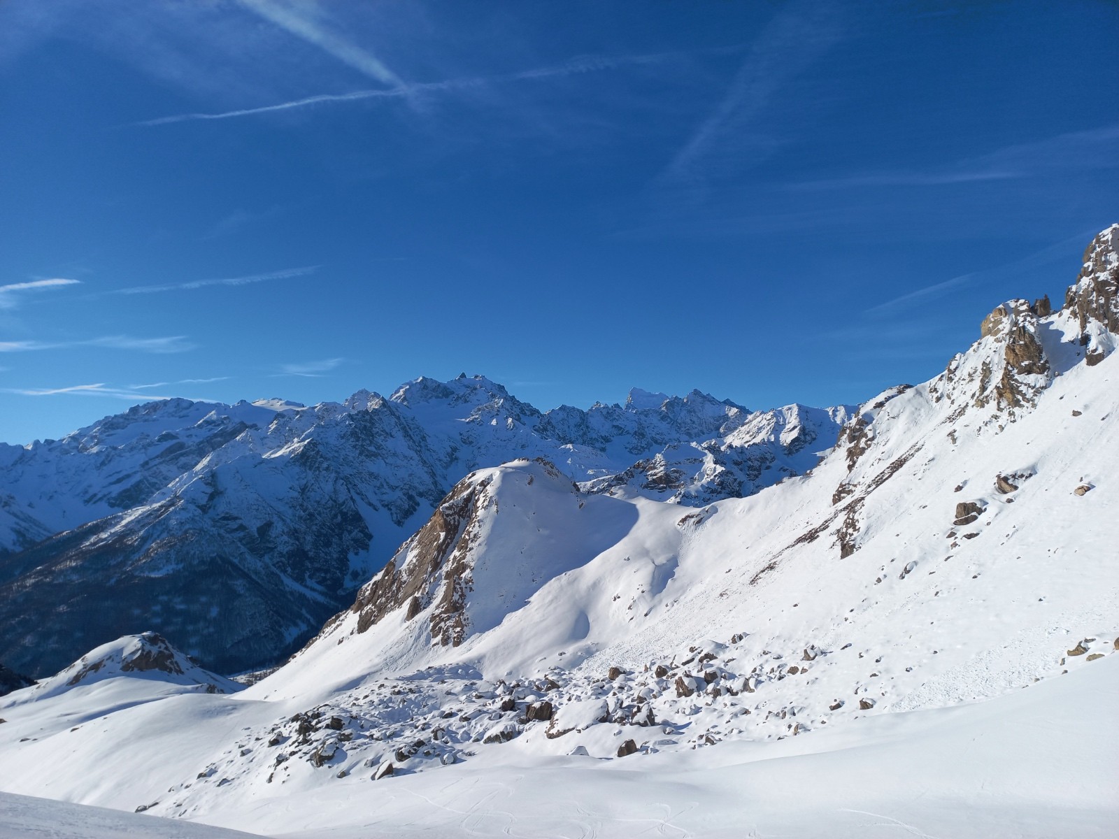 La neige est encore bien présente dans le secteur des Alpes du sud mais elle est bien bétonnée. Le panorama est magnifique dans toutes les directions. L'équipe à le sourire et c'est une bonne chose. Nous sommes surpris de la chaleur le long de la crête du Queyrellin qui nous chauffe bien les fesses et nous fait bien transpirer jusqu'au col de la Casse Blanche. C'est ici que nous décidons de changer nos plans et de prendre les traces à pieds le long de la Crête de la Casse Blanche (exercice toujours particulier mais sympathique et atypique dans une belle ambiance).