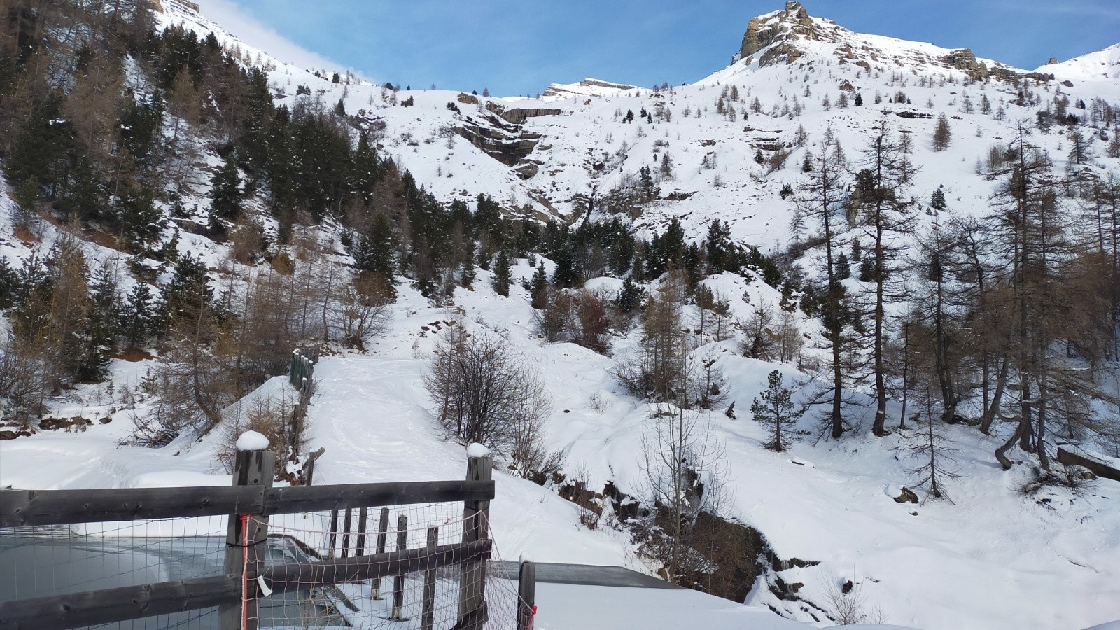Conditions pour le ski : Correcte dans l'ensemble, la dernière chute de neige a fait du bien, 10/15cms en bas qui permet d'accéder au réservoir sans déchausser à la montée comme à la descente, plus en haut mais très soufflée donc repartie très inégalement. On passe de la neige dure croûtée à de la poudreuse tassée par le vent mais assez agréable.