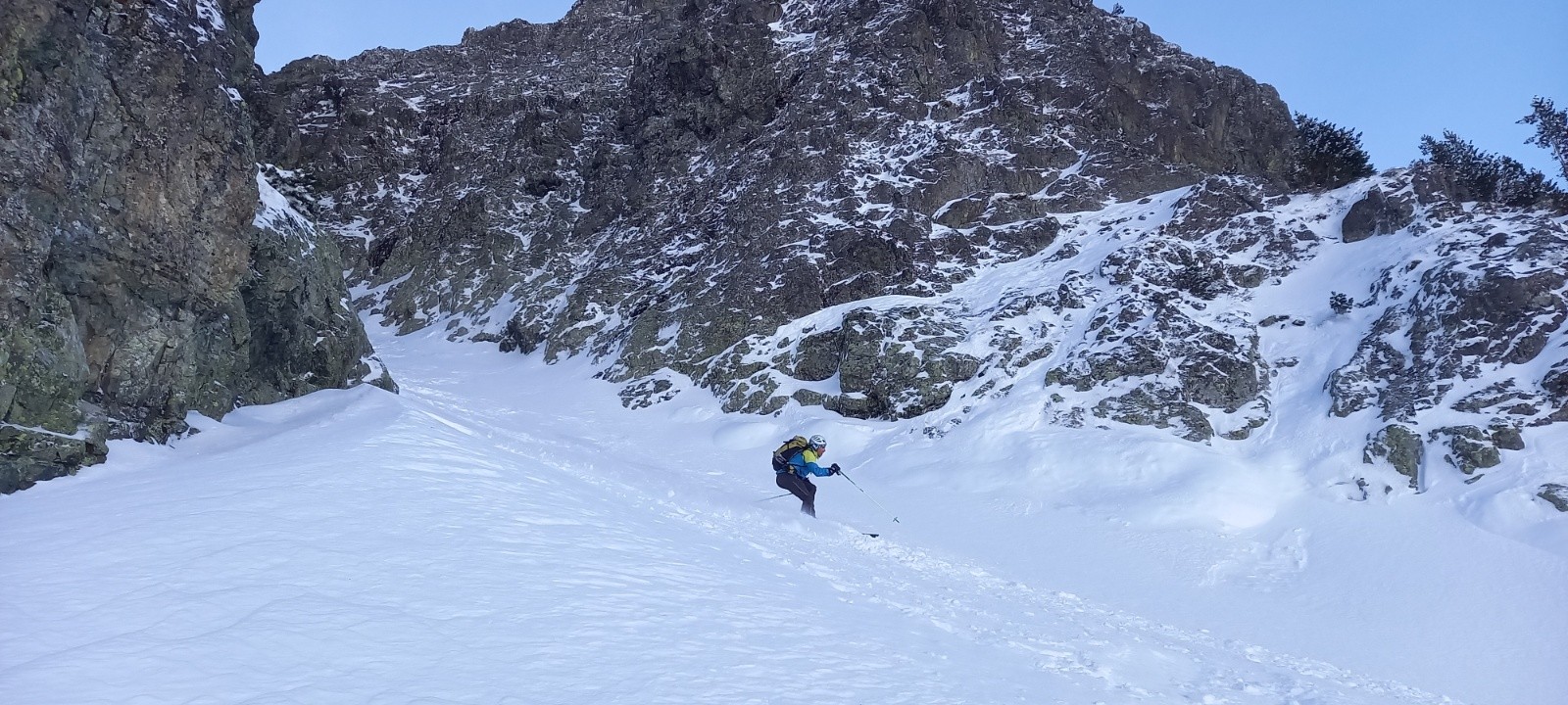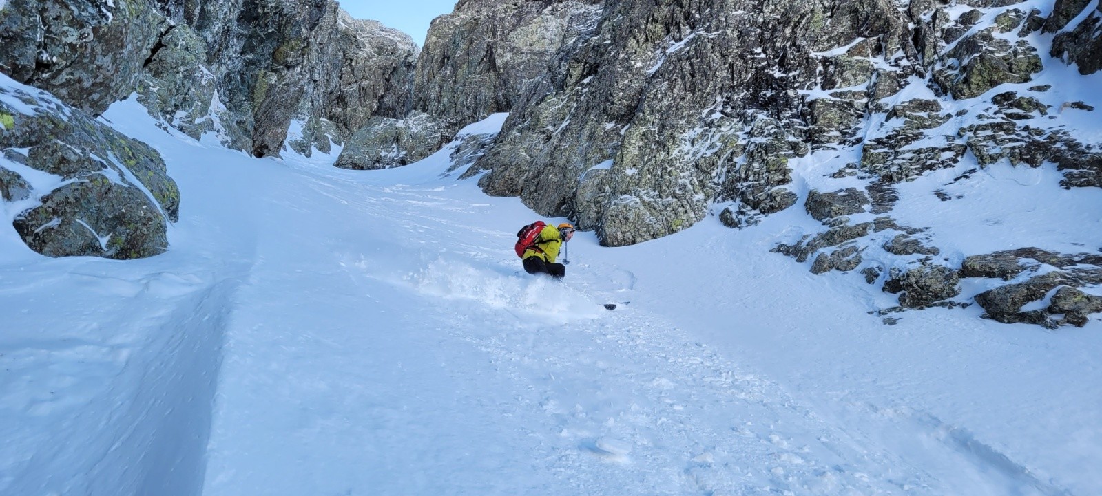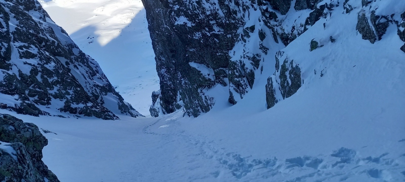 Dans le couloir des Roberts et le cône en dessous : irrégulière. De la poudre tassée agréable de haut en bas. Mais le vent a travaillé la zone : les parties en poudre sont d'épaisseurs très variées (quelques cm à plus de 40) et parfois étroites bordées de zones de vieille neige dure/gelée. Neige parfois plaquée, jusqu'à 10-20cm.