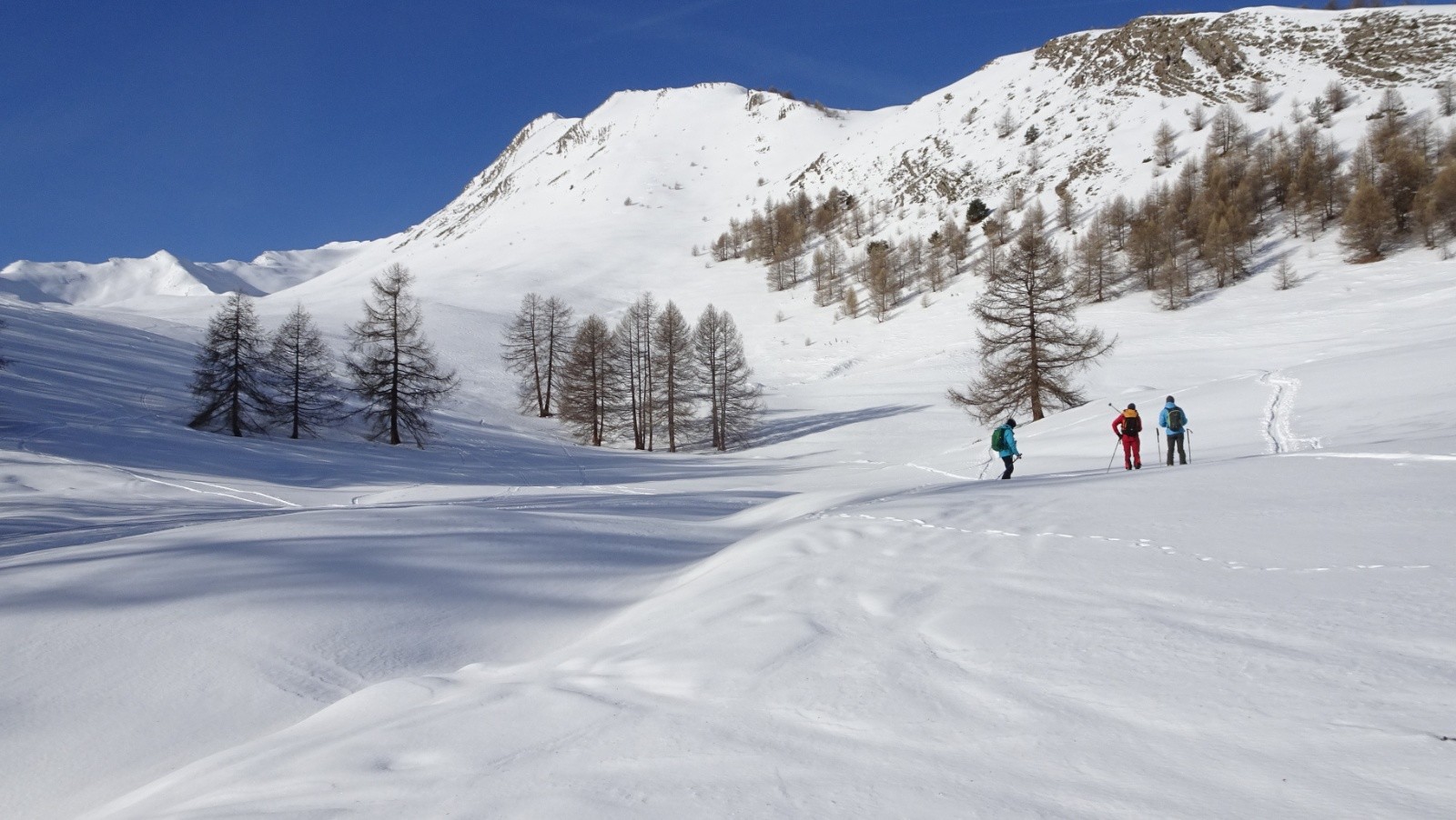 Conditions pour le ski :Assez bonnes, passages en poudreuse encore sur le bas dans les prés entre les bois. Dans le vallon un peu de croutée, un peu de poudreuse, des parties glacées décapées par le vent le tout alternant rapidement et qu'il faut bien observer pour ne pas se laisser surprendre.