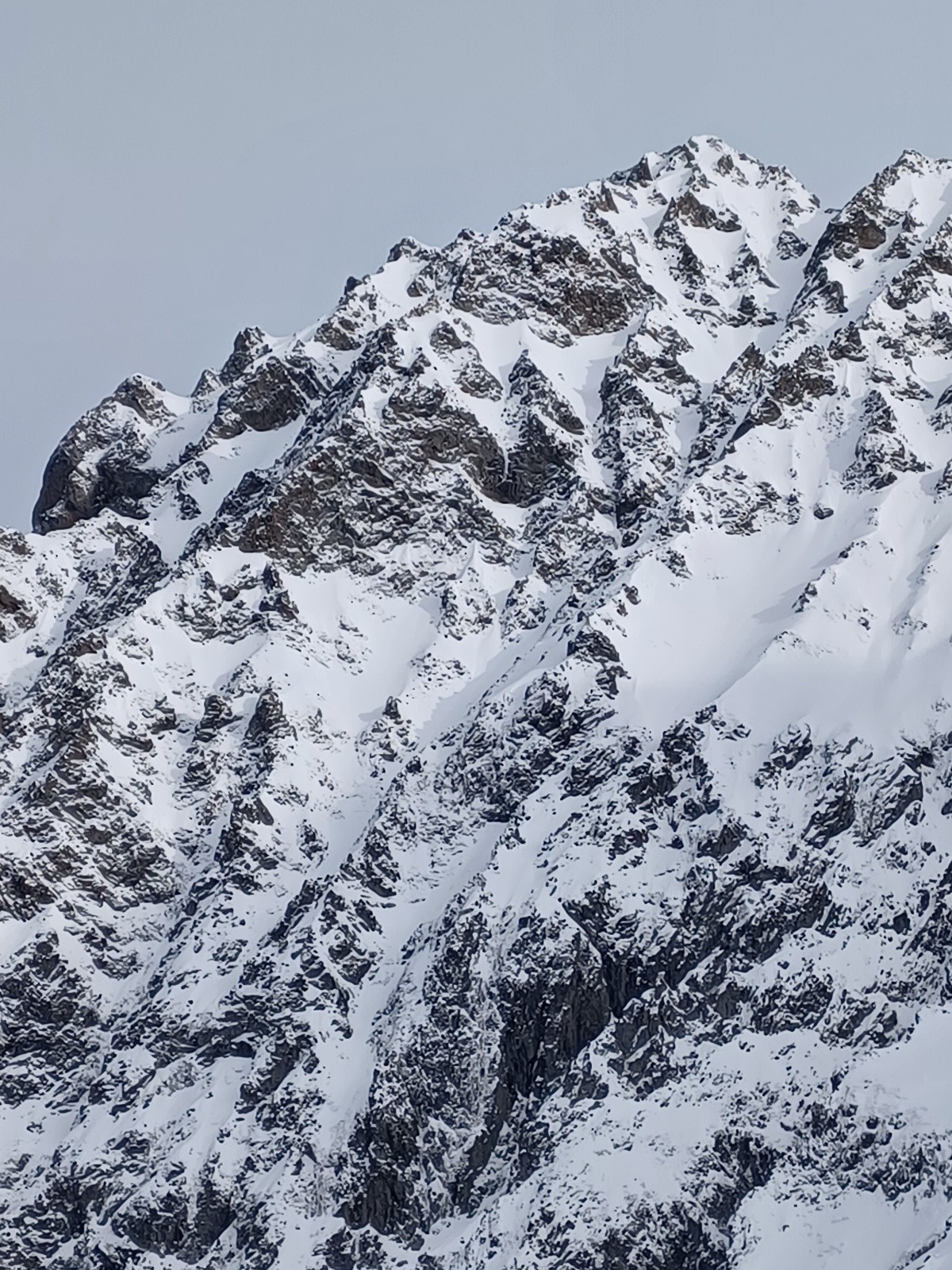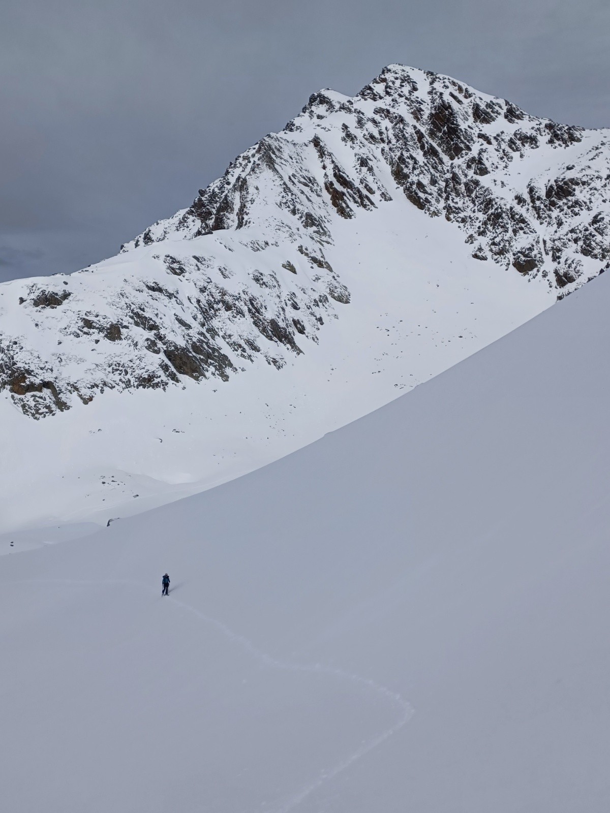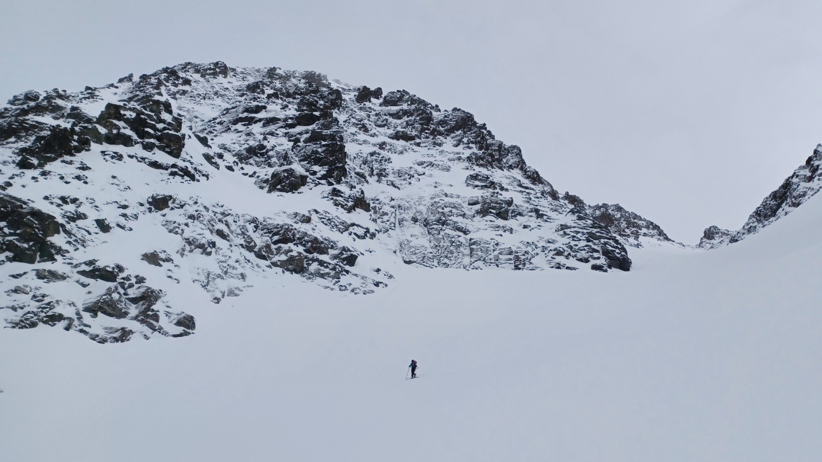 Une fois garé au parking, nous chaussons assez vite dès 1100m mais le cheminement n'est pas évident car les cailloux affleurent de partout, nous alternons portage et ski selon le terrain... L'enneigement sera un poil meilleur à partir de 1600m où nous pourrons glisser sur les peaux sur la majeure partie du circuit. Le refuge de l'Oule est toujours présent, pas de traces en direction du col de Comberousse. Quel plaisir de faire la sienne dans un coin sauvage avec vue sur le pic des Grands Lanches. Le col de Comberousse est en vue, le vent souffle...
