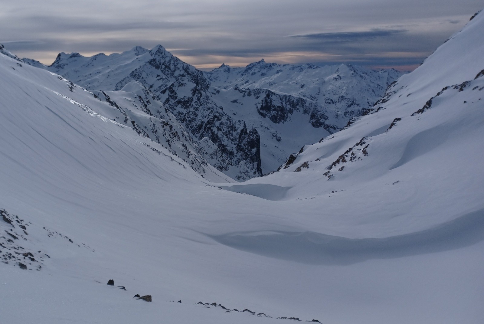 Le Grand Pic de Belledonne apparaît en toile de fond de la combe du Tépey... C'est parti pour la 2ème descente, nous redoublons de prudence à la vue des corniches. Après avoir enchaîné les virages sur 700m de dénivelé, il nous reste plus qu'une montée pour boucler le tour. Jusqu'à maintenant, nous n'avons croisé personne depuis notre départ de Gleyzin... Les cuisses commencent à fatiguer... La selle du Puy Gris montre le bout de son nez, la pénombre n'est plus loin. C'est étrange de faire du ski de rando printanier en plein mois de janvier, les journées sont encore courtes.